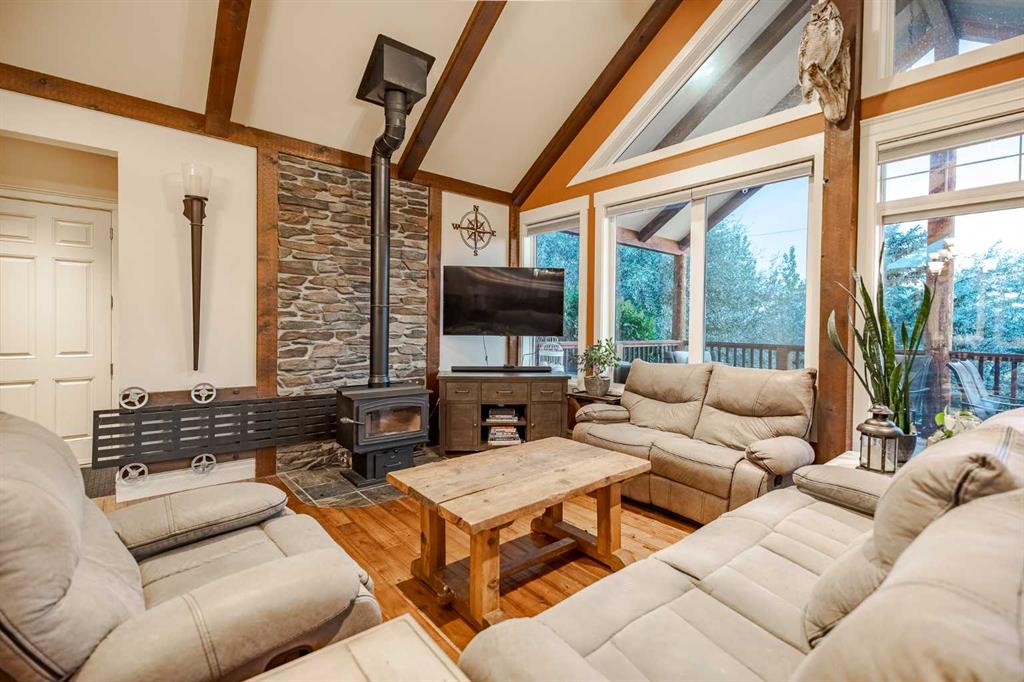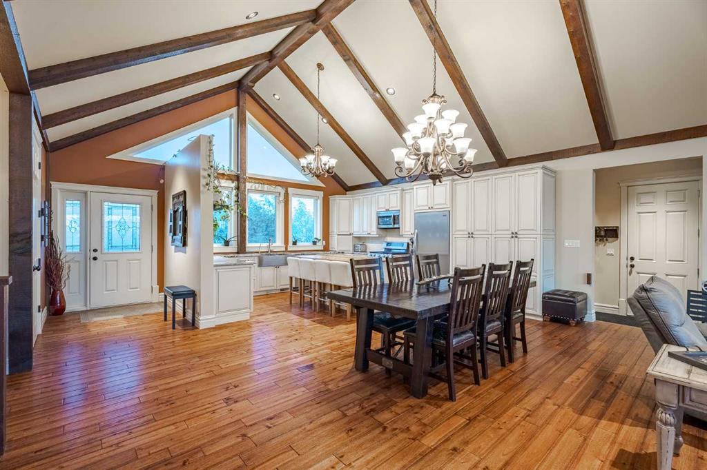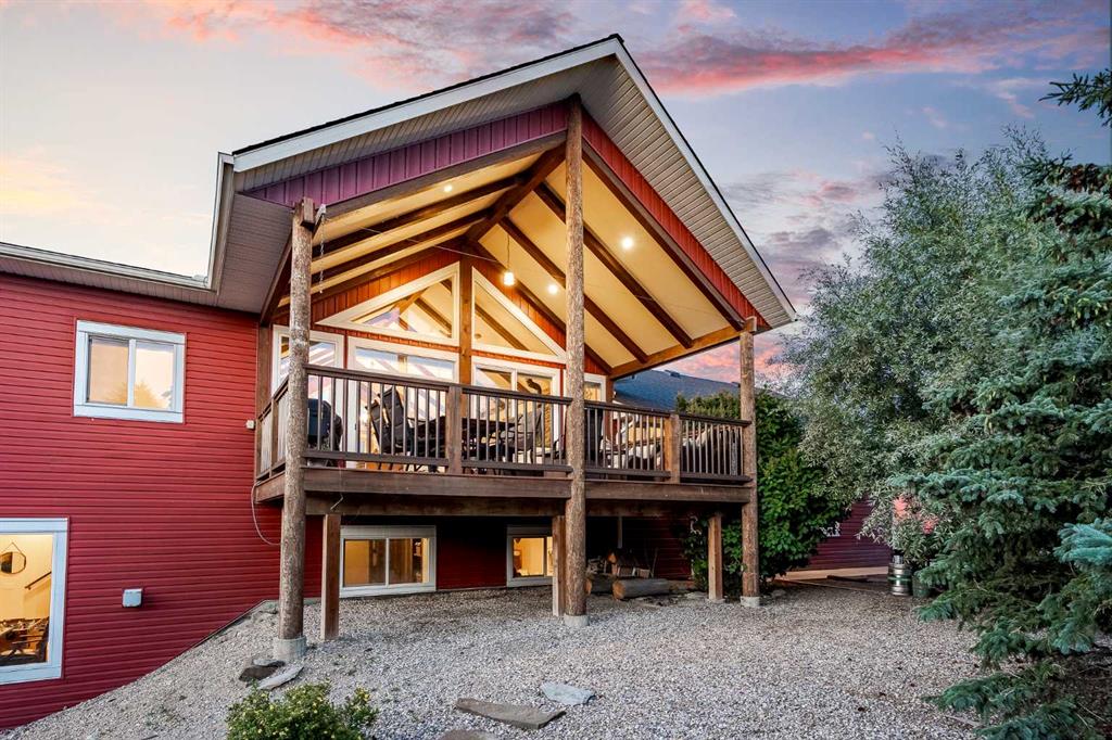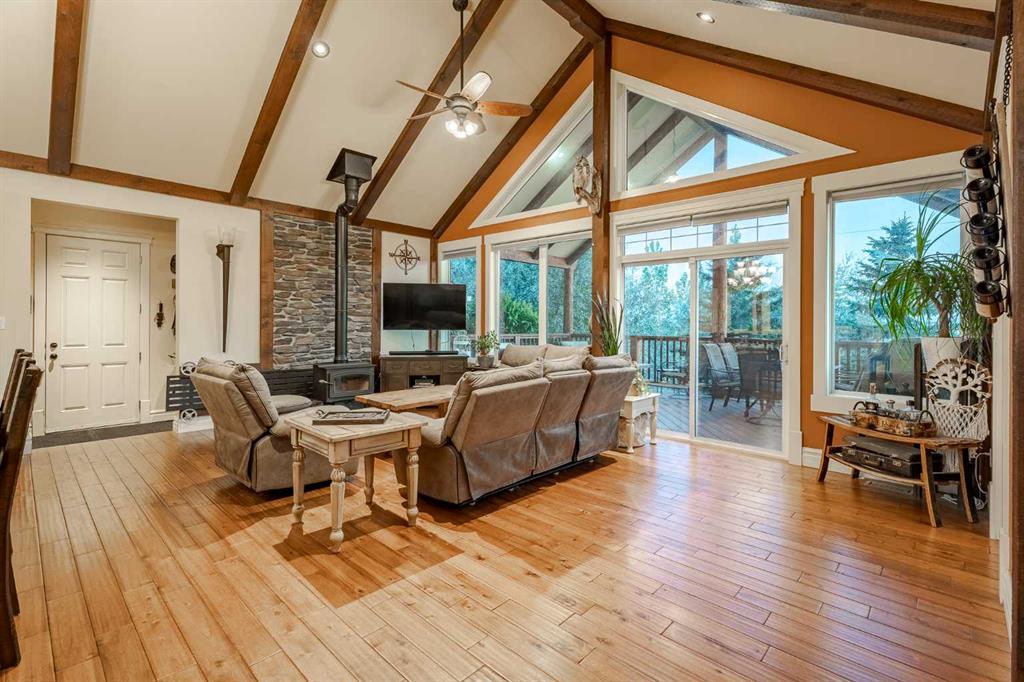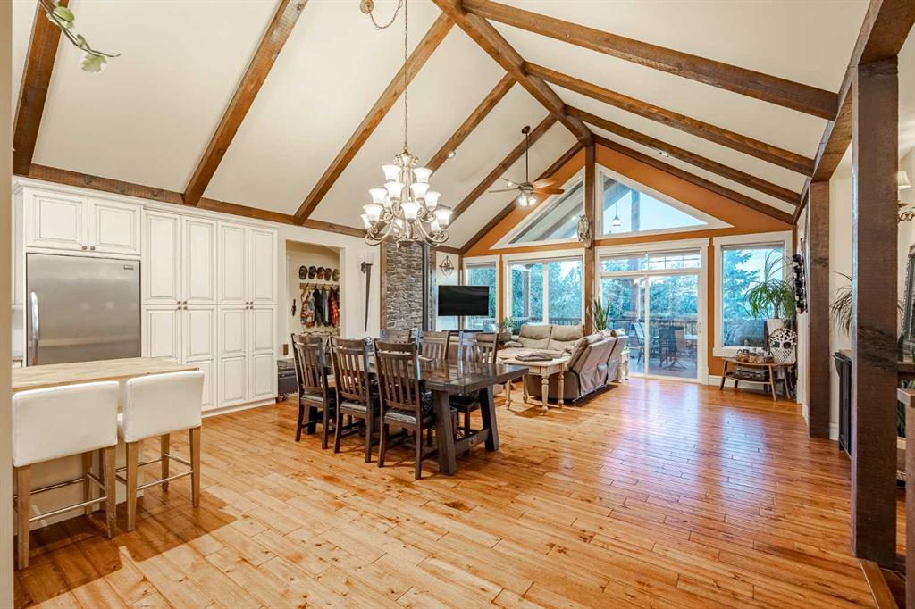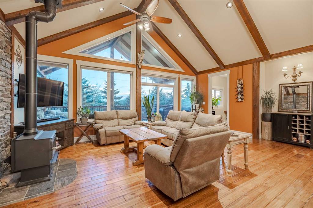 Welcome to this extraordinary walkout bungalow offering over 4,000 sq ft of thoughtfully designed living space with 6 bedrooms, 5 bathrooms, a heated oversized quad garage, a massive 40’ x 60’ insulated shop, and nearly 20 acres of endless possibility just minutes from Calgary. From the moment you arrive, the striking A-frame architecture stretches from the front elevation all the way to the covered back porch, perfectly framing panoramic mountain views. Step into the grand main level, where soaring vaulted ceilings with exposed beams and expansive west-facing windows fill the space with natural light and unforgettable views. The gourmet kitchen features upgraded cabinetry, a large center island, granite countertops, and premium stainless appliances designed for effortless entertaining. The spacious dining area easily accommodates large gatherings, while the open-concept living room is anchored by a cozy gas fireplace.