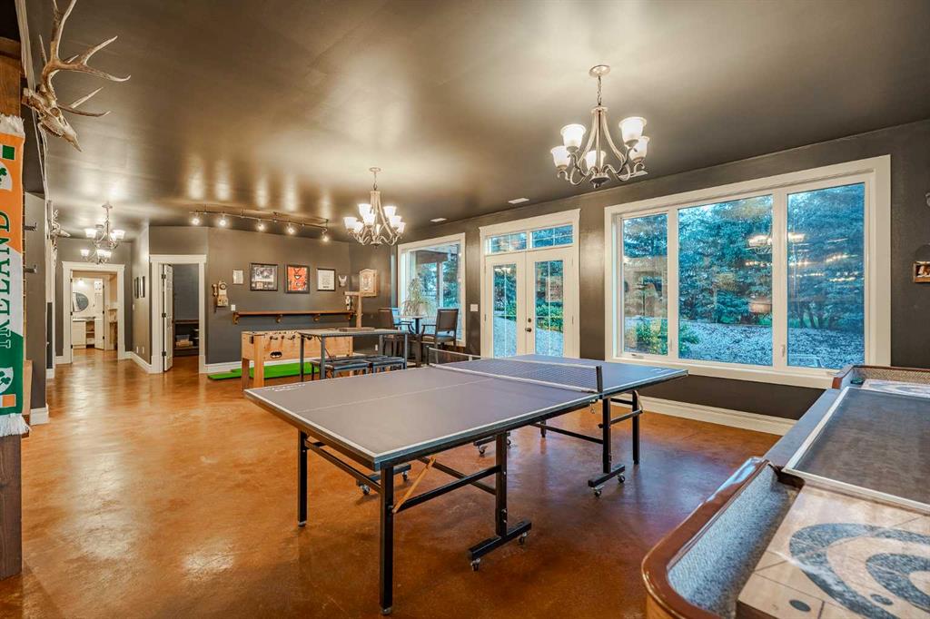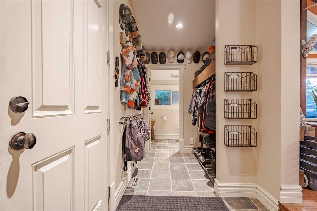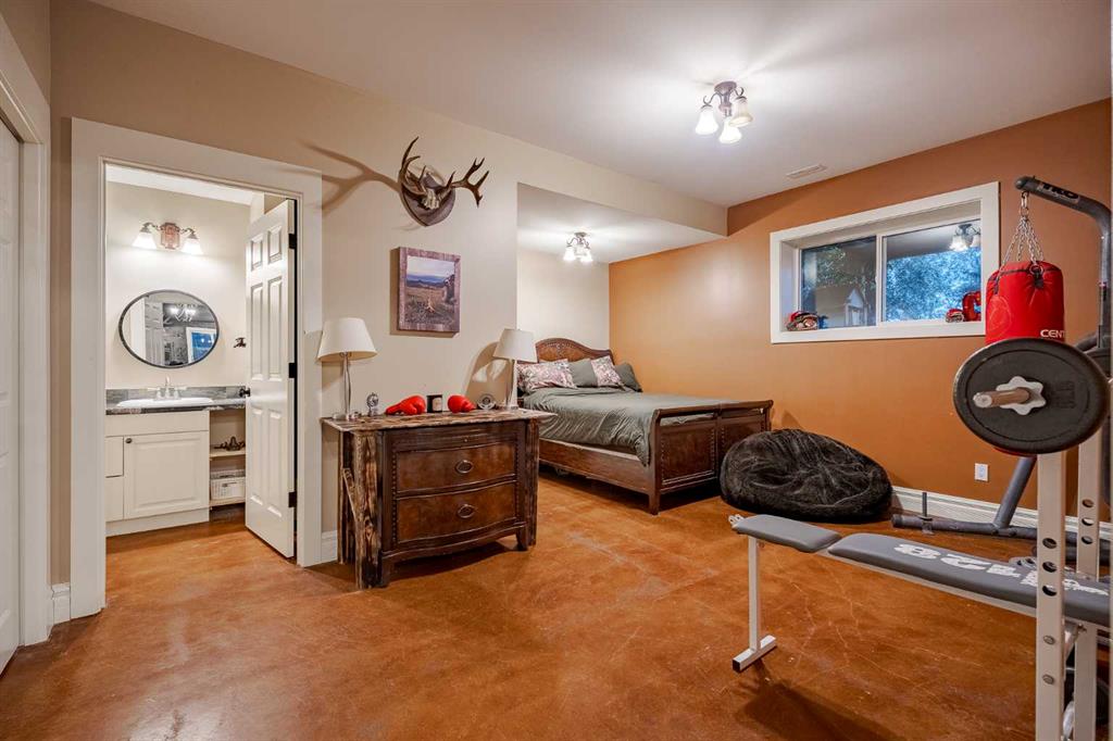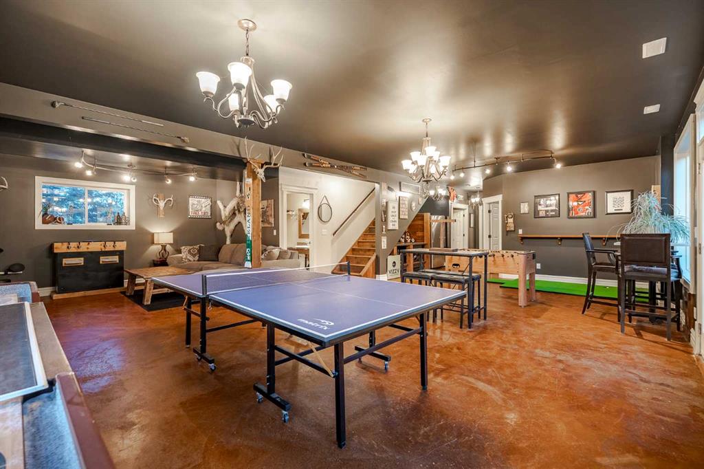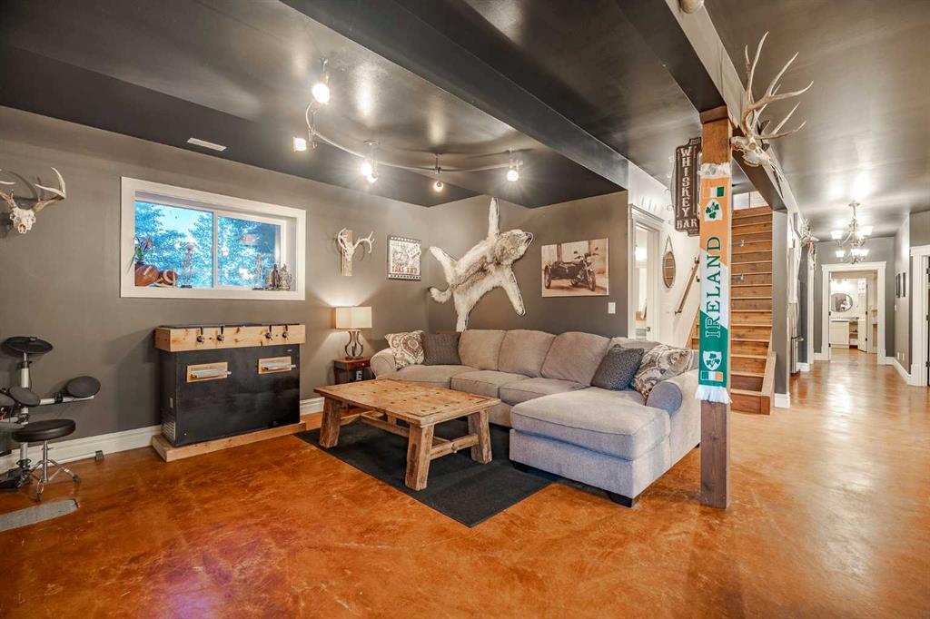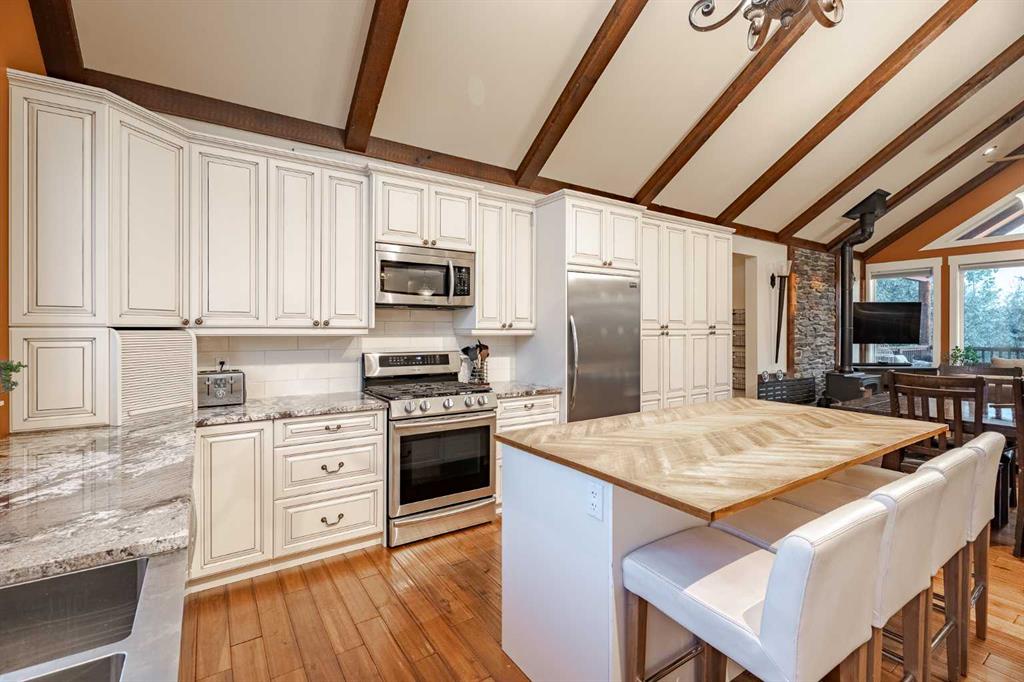 Welcome to this extraordinary walkout bungalow offering over 4,000 sq ft of thoughtfully designed living space with 6 bedrooms, 5 bathrooms, a heated oversized quad garage, a massive 40’ x 60’ insulated shop, and nearly 20 acres of endless possibility just minutes from Calgary. From the moment you arrive, the striking A-frame architecture stretches from the front elevation all the way to the covered back porch, perfectly framing panoramic mountain views. Step into the grand main level, where soaring vaulted ceilings with exposed beams and expansive west-facing windows fill the space with natural light and unforgettable views. The gourmet kitchen features upgraded cabinetry, a large center island, granite countertops, and premium stainless appliances designed for effortless entertaining. The spacious dining area easily accommodates large gatherings, while the open-concept living room is anchored by a cozy gas fireplace.
