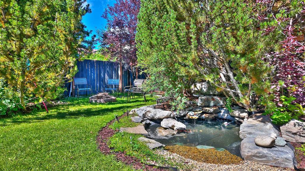 Landscaped yard with pond & outdoor firepit.