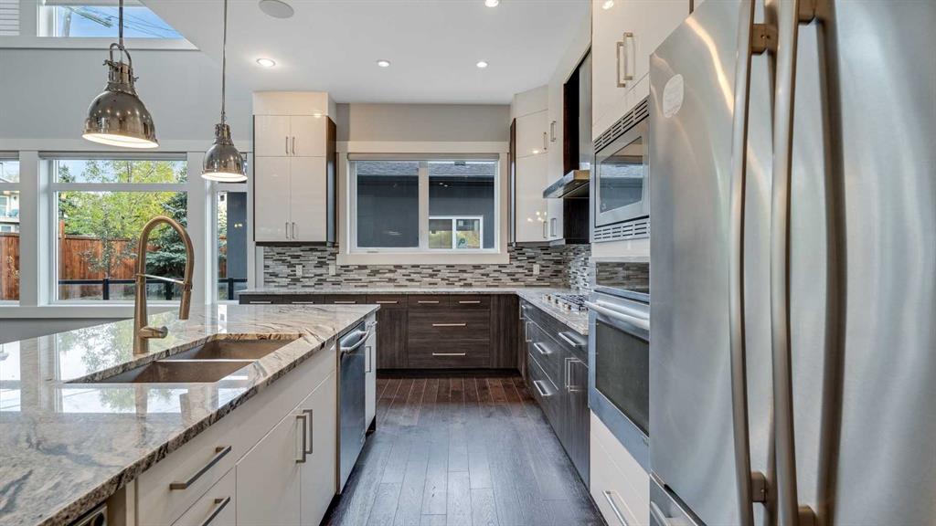 Nestled just steps from the serene Bow River pathways and the lush beauty of Elbow Park, this exquisite residence offers the perfect balance of nature, luxury, and urban convenience. Ideally situated near the Alberta Children’s Hospital, Foothills Hospital, and Market Mall, every essential—whether shopping, recreation, or emergency care—is mere minutes away. Behind the property, tranquil walking and cycling trails invite you to unwind and reconnect with the outdoors. Set on a generous 45-foot lot in Calgary’s highly sought-after inner-city enclave of Parkdale, this stunning stucco home is a showcase of architectural sophistication and exceptional craftsmanship. Spanning over 4,000 sq.ft. of opulent living space, including 2,573sq.ft. above grade, it features five spacious bedrooms and four-and-a-half luxurious baths. From the moment you enter, the home’s grandeur is undeniable—beginning with a soaring 19-foot foyer, beautifully tiled floors, and a dramatic open-riser staircase that exudes modern artistry. Expansive windows flood the open-concept interior with natural light, highlighting fine finishes and elegant design details throughout. The main living area is anchored by a sleek gas fireplace, offering both warmth and sophistication—a perfect setting for relaxed evenings or formal gatherings. The chef-inspired kitchen is a true statement of luxury, boasting a large granite island with breakfast bar, two-tone custom cabinetry, a built-in wine cooler, and an elite JennAir appliance package. French doors lead seamlessly to an oversized patio, ideal for al fresco dining and entertaining, complete with a rough-in BBQ gas line and integrated sound system. A spacious main-floor office or flex room, along with a refined powder room, completes this impressive level.