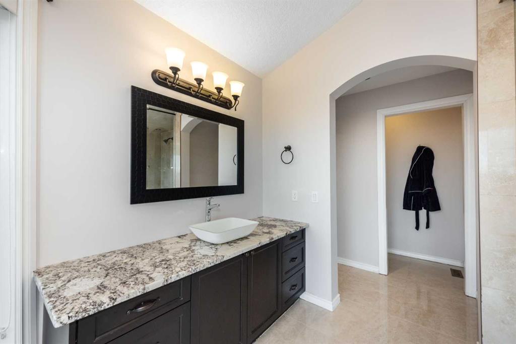 Upstairs, you’ll find three generous bedrooms and a large family room with lofted ceilings that elevate the home’s spacious feel. The primary suite is a true retreat, offering a private west-facing balcony with mountain views. The luxurious 5-piece ensuite includes a deep soaking tub set against a stunning window backdrop, a tiled steam shower with bench seating, dual vanities, and a private water closet. The custom walk-in closet provides exceptional storage and organization. Bedrooms 2 and 3 share a well-appointed 5-piece bathroom with dual sinks and a separate shower/tub and toilet area—ideal for busy families.