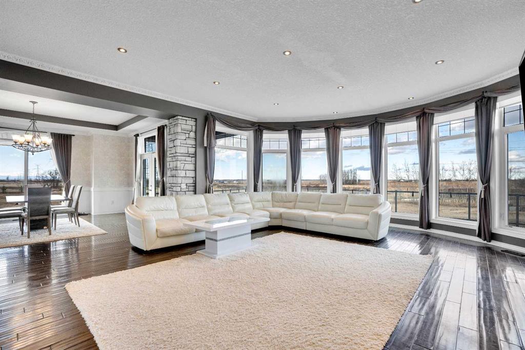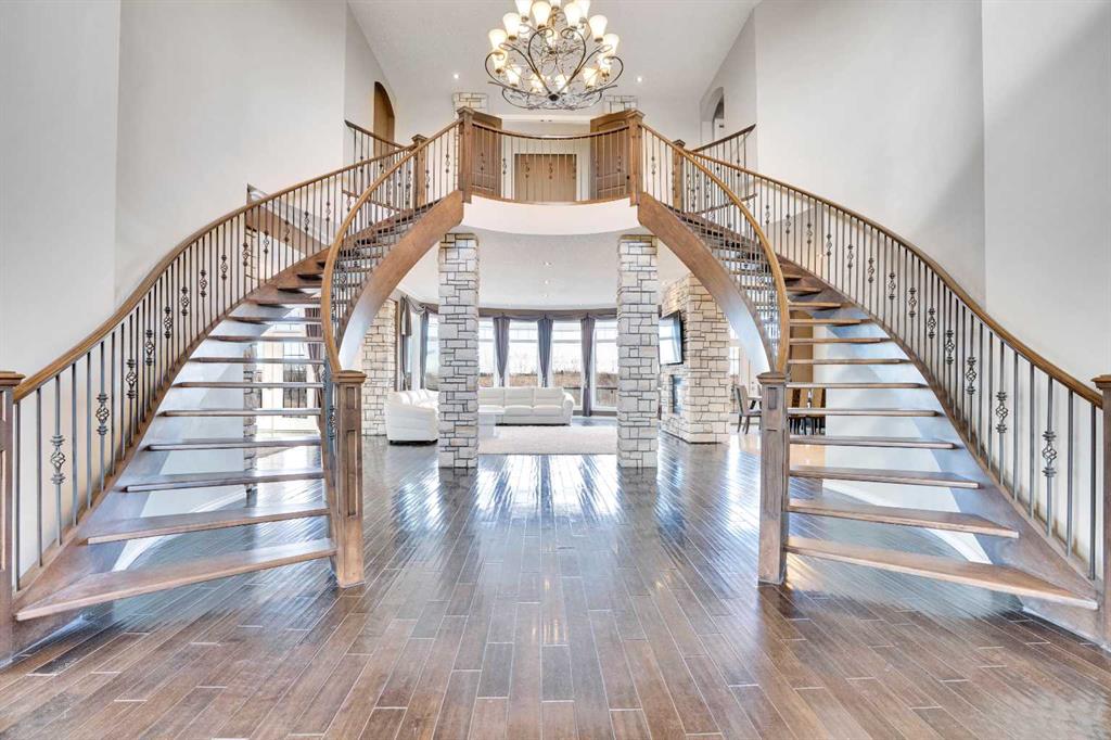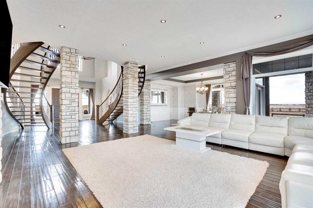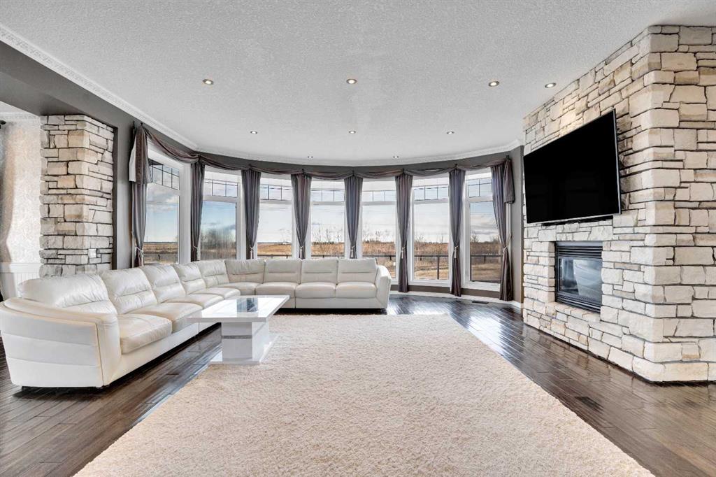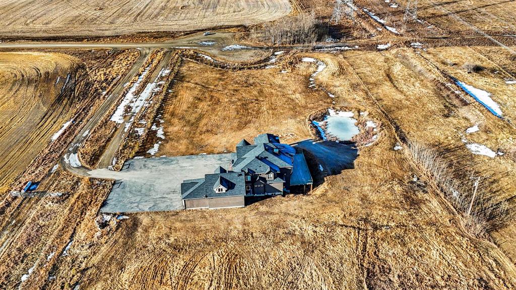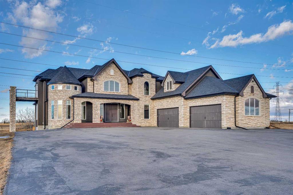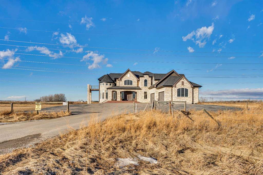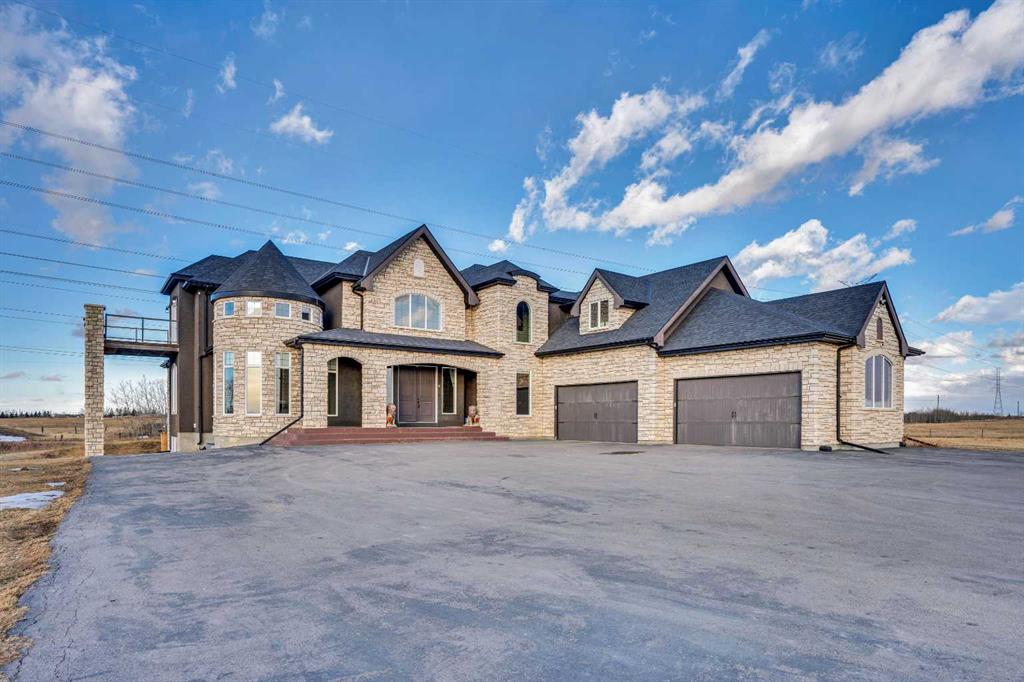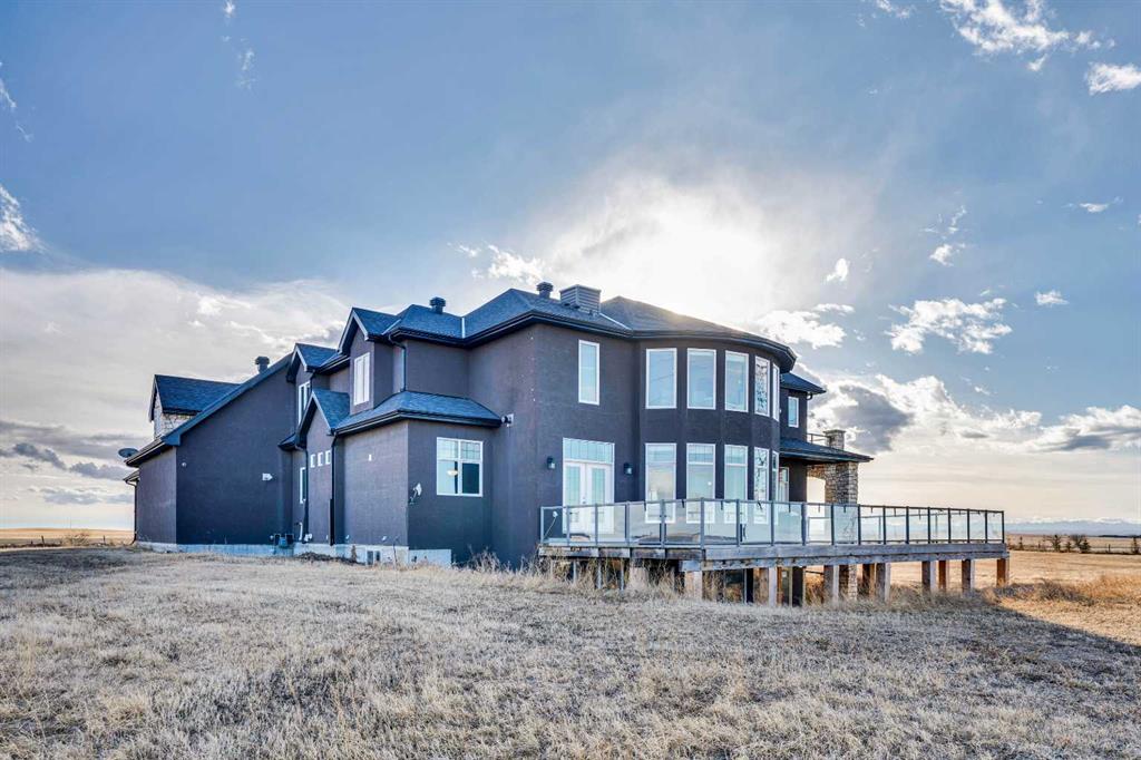 ?Welcome to this extraordinary custom-built estate offering over 7,000 sq ft of developed living space across three levels, including 4,682 sq ft above grade, all set on a beautifully positioned 4-acre parcel with a private gated driveway and a 4-car garage. Combining luxury, scale, and serenity, this remarkable property delivers peaceful country living just minutes from Calgary and Boulder Creek Golf Course. A grand double staircase and soaring open-to-below ceilings create a stunning first impression in the expansive foyer. The open-concept main floor showcases rich hardwood flooring, oversized windows framing panoramic views, and seamless flow designed for both entertaining and everyday living.? The chef-inspired kitchen features full-height cabinetry, stainless steel appliances, granite countertops, a hidden built-in range hood, wine cooler, built-in wine rack, and a large centre island with bar seating and bar sink. A walkthrough pantry connects directly to the mudroom and main-floor laundry for exceptional functionality. The bright dining nook and formal dining room both open through French doors to the massive north-facing deck, creating effortless indoor-outdoor living. The inviting living room is anchored by a double-sided gas fireplace shared with the kitchen, adding warmth and ambiance. A main-level office/den provides the perfect work-from-home space.? Upstairs, you’ll find three spacious bedrooms and a large family room with lofted ceilings that enhance the home’s grandeur. The primary suite is a private retreat featuring a west-facing balcony with mountain views. The luxurious 5-piece ensuite offers a deep soaking tub set against a wall of windows, a tiled steam shower with bench seating, dual vanities, a private water closet, and a custom walk-in closet with built-in organization. Bedrooms two and three share a well-designed 5-piece bathroom with dual sinks and a separate shower/tub and toilet area—ideal for family living.? The bright walkout basement offers an additional 2,347 sq ft of space, is PAINT READY and fully developed featuring a recreation area, home theatre, gym, or additional bedrooms, 2 full bathrooms.? This one-of-a-kind estate blends breathtaking views, expansive living spaces, and refined finishes in a highly desirable location just minutes from the city. A rare opportunity to own a truly remarkable home that must be experienced to be fully appreciated.