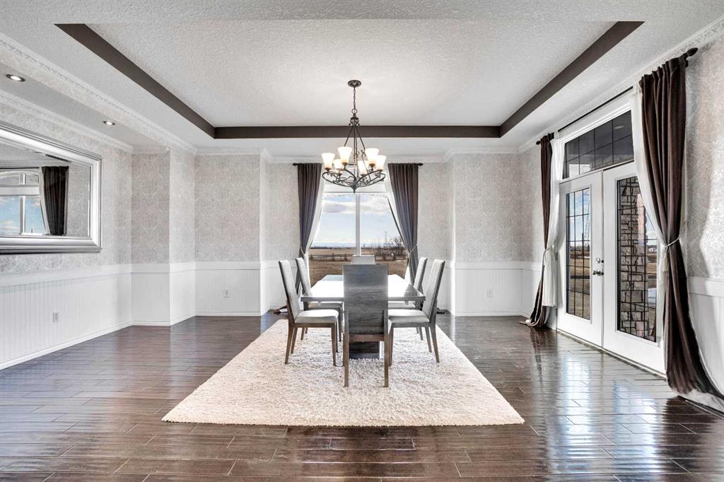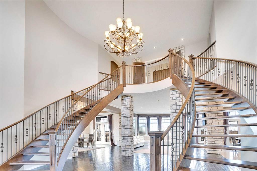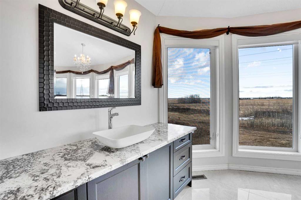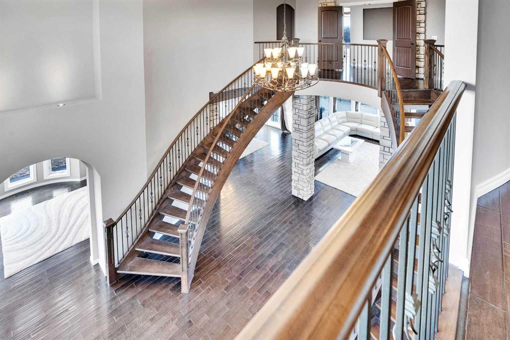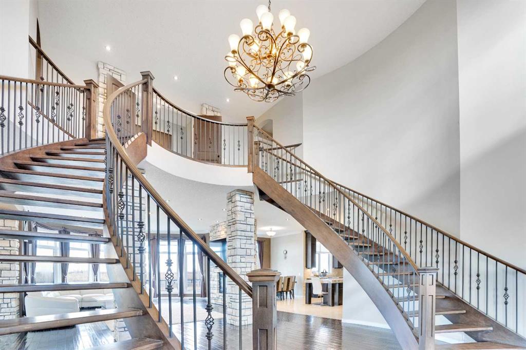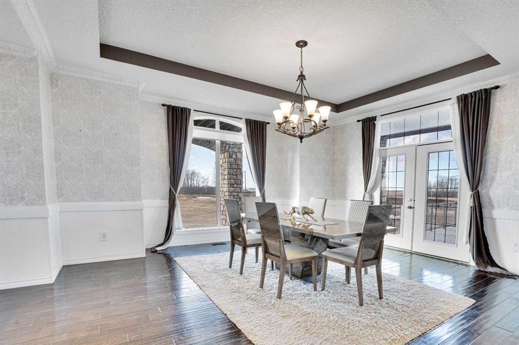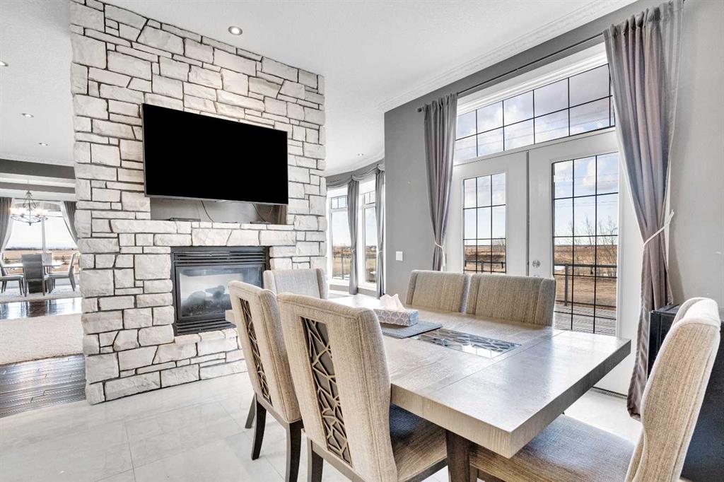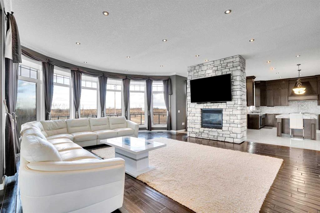 ?Welcome to this extraordinary custom-built estate offering over 7,000 sq ft of developed living space across three levels, including 4,682 sq ft above grade, all set on a beautifully positioned 4-acre parcel with a private gated driveway and a 4-car garage. Combining luxury, scale, and serenity, this remarkable property delivers peaceful country living just minutes from Calgary and Boulder Creek Golf Course. A grand double staircase and soaring open-to-below ceilings create a stunning first impression in the expansive foyer. The open-concept main floor showcases rich hardwood flooring, oversized windows framing panoramic views, and seamless flow designed for both entertaining and everyday living.? The chef-inspired kitchen features full-height cabinetry, stainless steel appliances, granite countertops, a hidden built-in range hood, wine cooler, built-in wine rack, and a large centre island with bar seating and bar sink. A walkthrough pantry connects directly to the mudroom and main-floor laundry for exceptional functionality. The bright dining nook and formal dining room both open through French doors to the massive north-facing deck, creating effortless indoor-outdoor living. The inviting living room is anchored by a double-sided gas fireplace shared with the kitchen, adding warmth and ambiance. A main-level office/den provides the perfect work-from-home space.? Upstairs, you’ll find three spacious bedrooms and a large family room with lofted ceilings that enhance the home’s grandeur. The primary suite is a private retreat featuring a west-facing balcony with mountain views. The luxurious 5-piece ensuite offers a deep soaking tub set against a wall of windows, a tiled steam shower with bench seating, dual vanities, a private water closet, and a custom walk-in closet with built-in organization. Bedrooms two and three share a well-designed 5-piece bathroom with dual sinks and a separate shower/tub and toilet area—ideal for family living.? The bright walkout basement offers an additional 2,347 sq ft of space, is PAINT READY and fully developed featuring a recreation area, home theatre, gym, or additional bedrooms, 2 full bathrooms.? This one-of-a-kind estate blends breathtaking views, expansive living spaces, and refined finishes in a highly desirable location just minutes from the city. A rare opportunity to own a truly remarkable home that must be experienced to be fully appreciated.