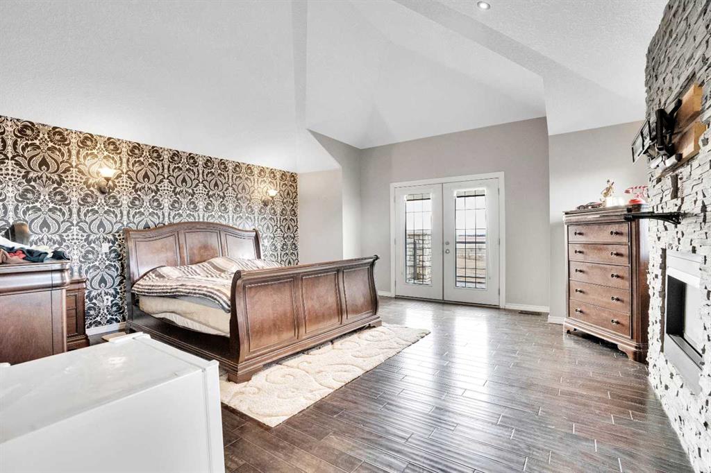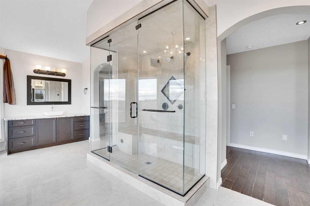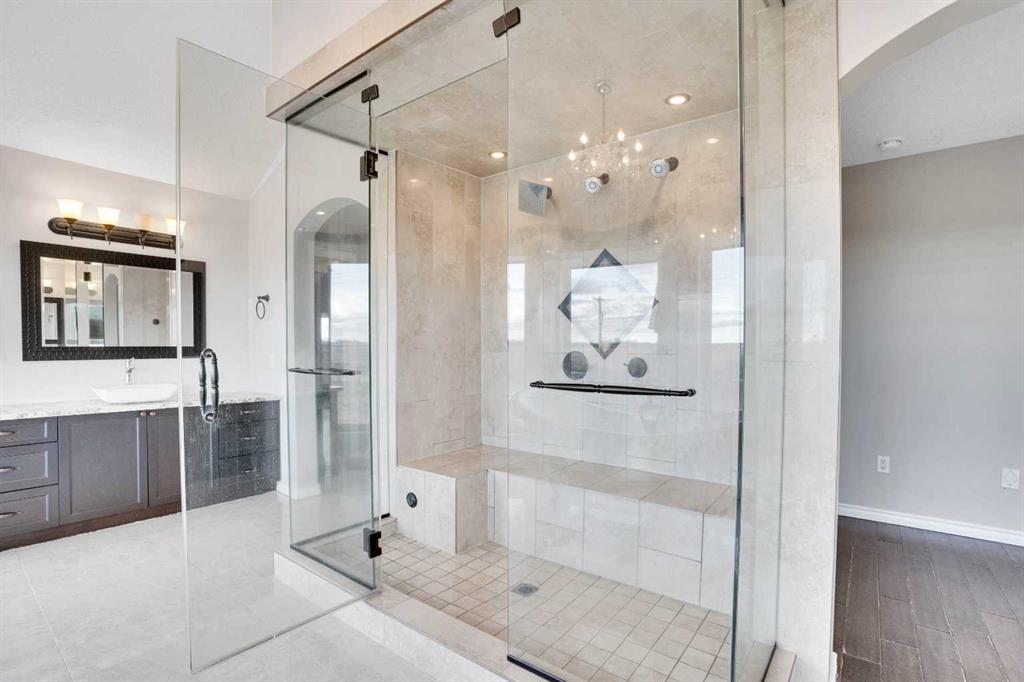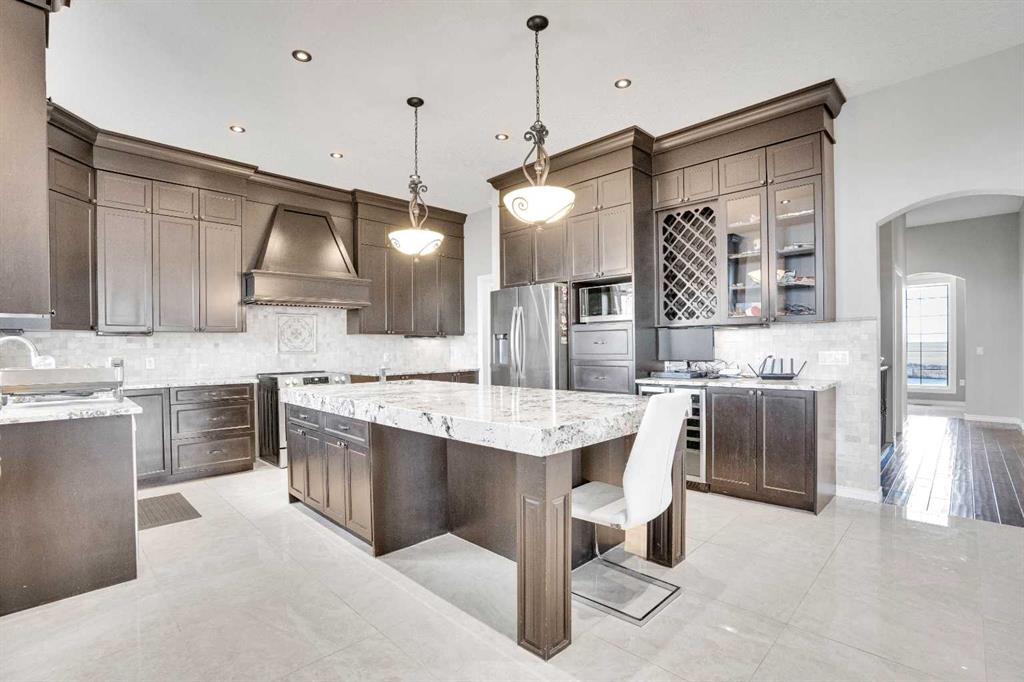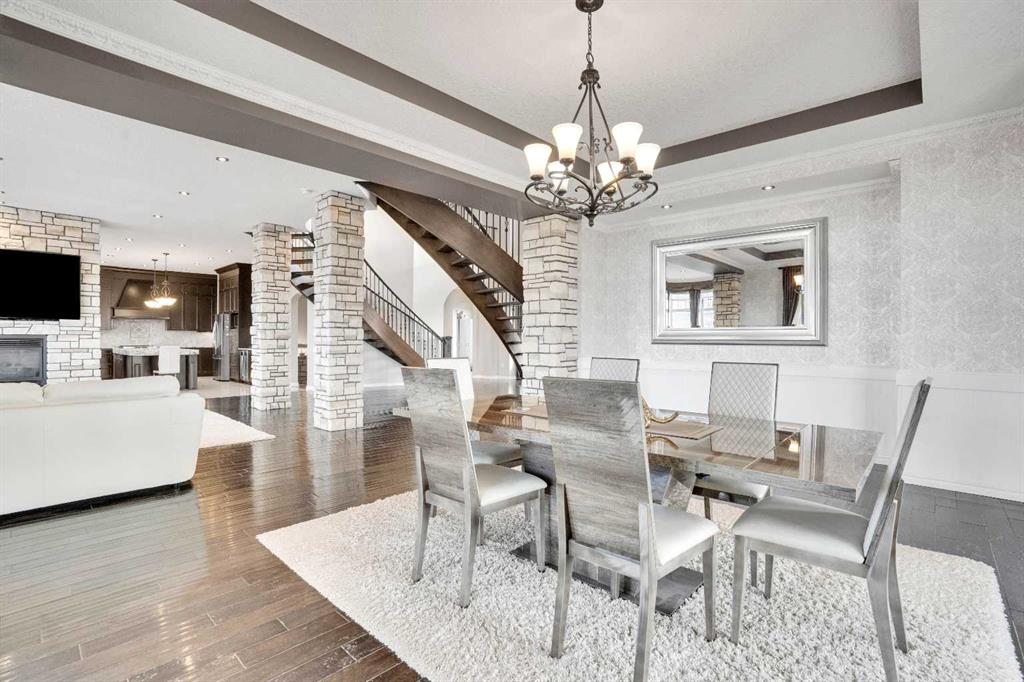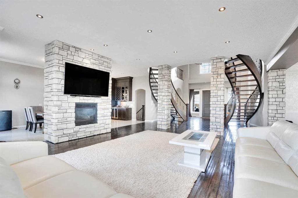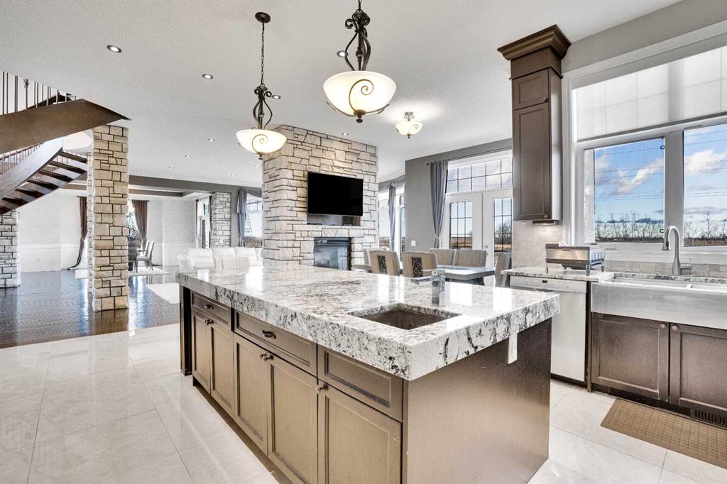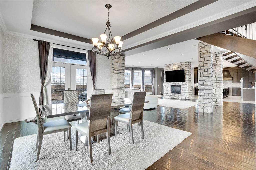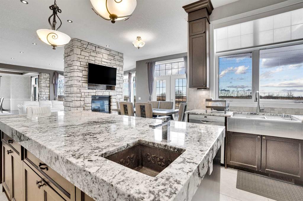?Welcome to this extraordinary custom-built estate offering over 7,000 sq ft of developed living space across three levels, including 4,682 sq ft above grade, all set on a beautifully positioned 4-acre parcel with a private gated driveway and a 4-car garage. Combining luxury, scale, and serenity, this remarkable property delivers peaceful country living just minutes from Calgary and Boulder Creek Golf Course. A grand double staircase and soaring open-to-below ceilings create a stunning first impression in the expansive foyer. The open-concept main floor showcases rich hardwood flooring, oversized windows framing panoramic views, and seamless flow designed for both entertaining and everyday living.? The chef-inspired kitchen features full-height cabinetry, stainless steel appliances, granite countertops, a hidden built-in range hood, wine cooler, built-in wine rack, and a large centre island with bar seating and bar sink. A walkthrough pantry connects directly to the mudroom and main-floor laundry for exceptional functionality. The bright dining nook and formal dining room both open through French doors to the massive north-facing deck, creating effortless indoor-outdoor living. The inviting living room is anchored by a double-sided gas fireplace shared with the kitchen, adding warmth and ambiance. A main-level office/den provides the perfect work-from-home space.? Upstairs, you’ll find three spacious bedrooms and a large family room with lofted ceilings that enhance the home’s grandeur. The primary suite is a private retreat featuring a west-facing balcony with mountain views. The luxurious 5-piece ensuite offers a deep soaking tub set against a wall of windows, a tiled steam shower with bench seating, dual vanities, a private water closet, and a custom walk-in closet with built-in organization. Bedrooms two and three share a well-designed 5-piece bathroom with dual sinks and a separate shower/tub and toilet area—ideal for family living.? The bright walkout basement offers an additional 2,347 sq ft of space, is PAINT READY and fully developed featuring a recreation area, home theatre, gym, or additional bedrooms, 2 full bathrooms.? This one-of-a-kind estate blends breathtaking views, expansive living spaces, and refined finishes in a highly desirable location just minutes from the city. A rare opportunity to own a truly remarkable home that must be experienced to be fully appreciated.