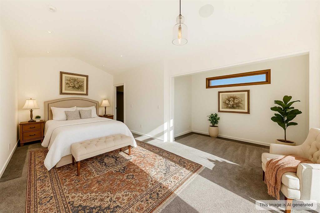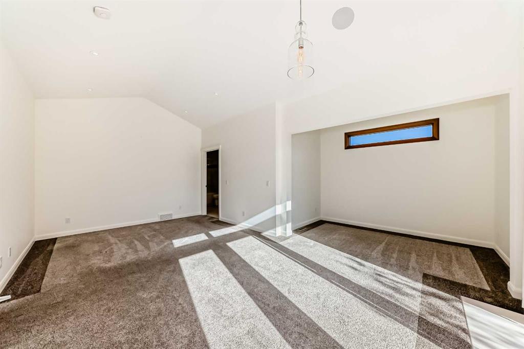 A wide, well-lit staircase leads to the exceptionally designed upper level, which features two additional bedrooms, a full bathroom, a convenient laundry room, and a spacious bonus room. The primary suite is a true sanctuary, offering vaulted ceilings, a custom walk-in closet, and an indulgent 5-piece ensuite complete with in-floor heating, a glass-enclosed shower, and a deep soaker tub for ultimate relaxation.