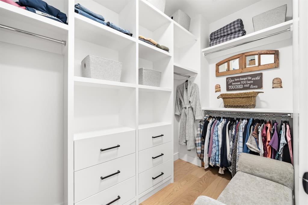 Ascending the gorgeous open-riser staircase, the upper level continues with hardwood flooring throughout. Here you’ll find two generous secondary bedrooms with custom built-in closet systems, a spacious laundry room, a well-appointed four-piece bathroom, and a serene primary retreat. The primary suite features soaring ceilings, a designer feature wall, and a spa-inspired ensuite complete with heated tile floors, dual vanities, a steam shower, and a deep soaker tub—your own private escape at the end of the day.