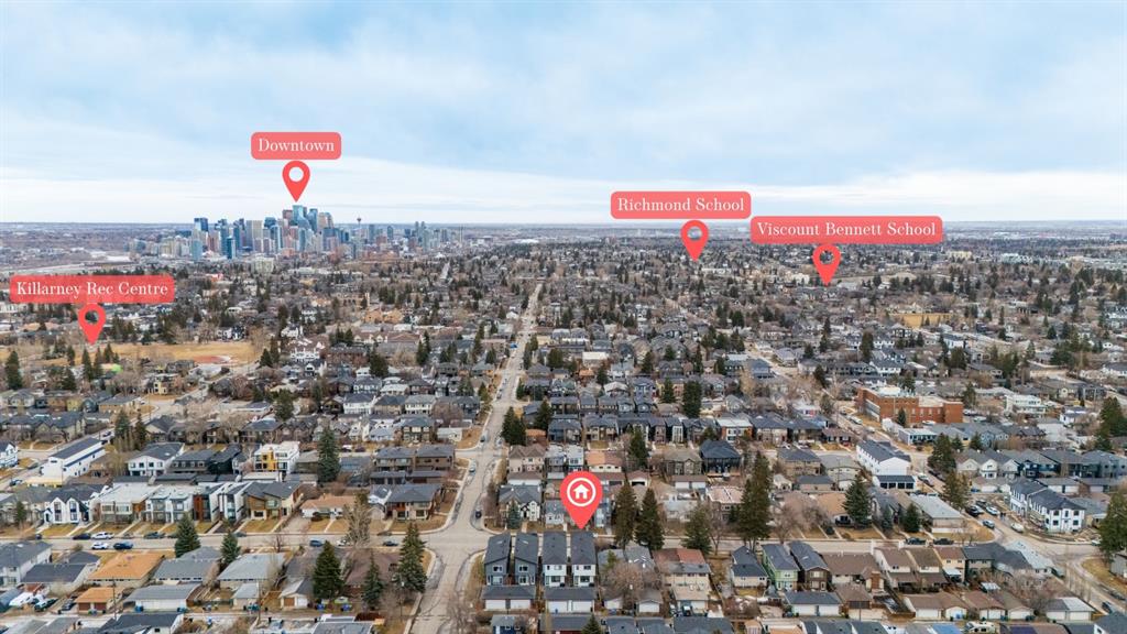 Additional highlights include built-in ceiling speakers, central air conditioning, central vacuum rough-in, and a rough-in for a security system. Ideally located close to parks, schools, local amenities, and the LRT, with quick access to downtown via Bow Trail or 17th Avenue, and within walking distance to the Killarney Aquatic & Recreation Centre and community garden.