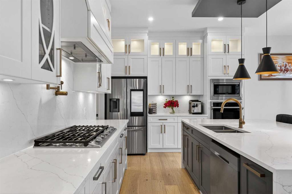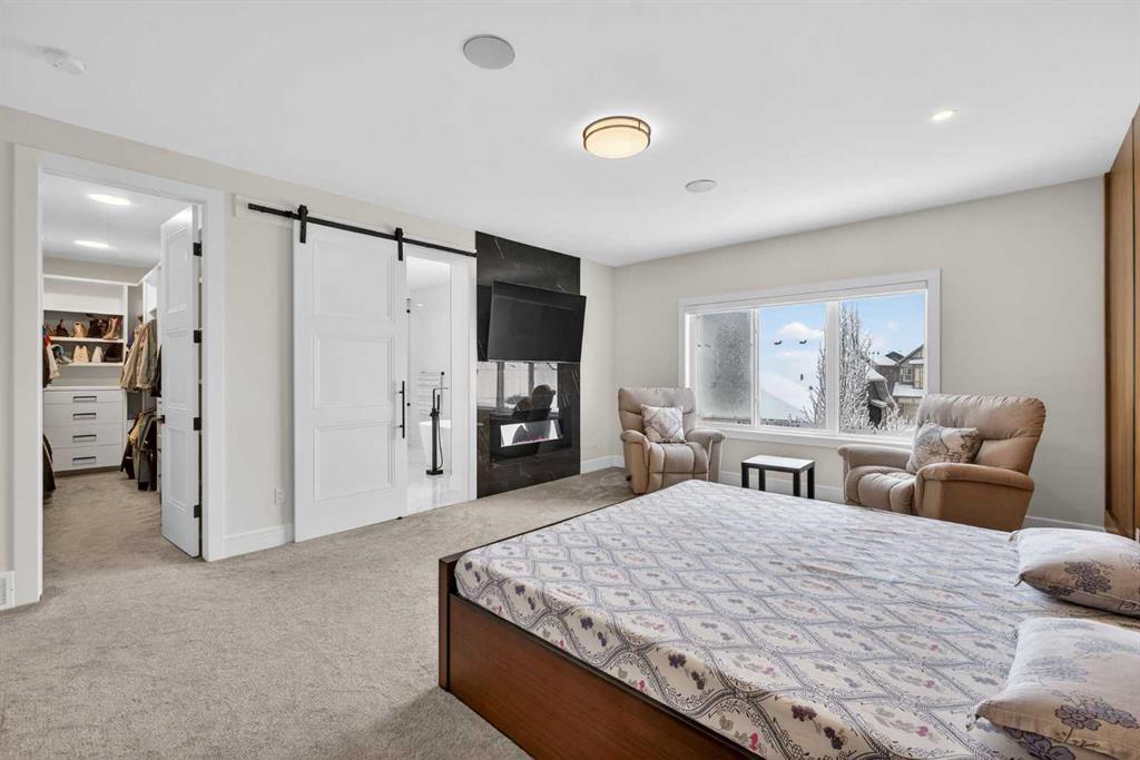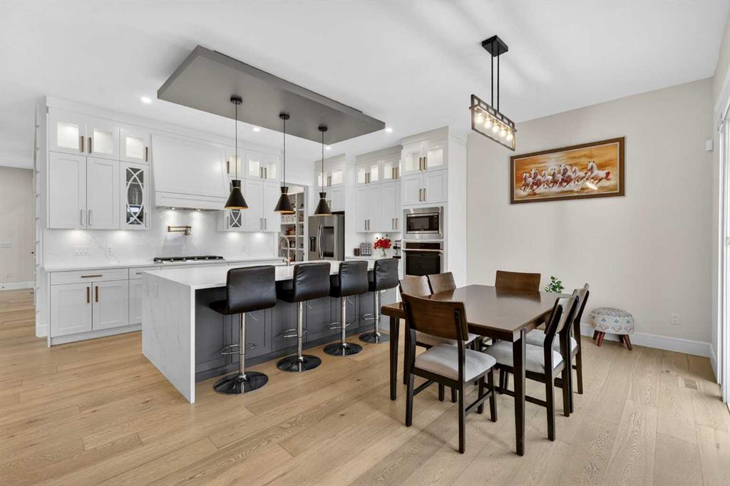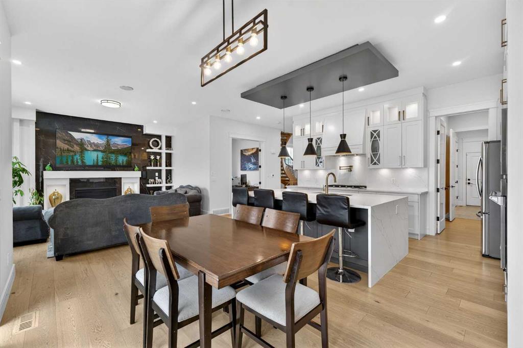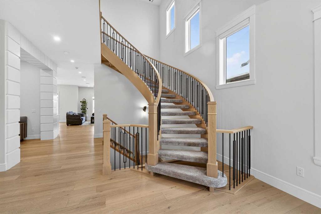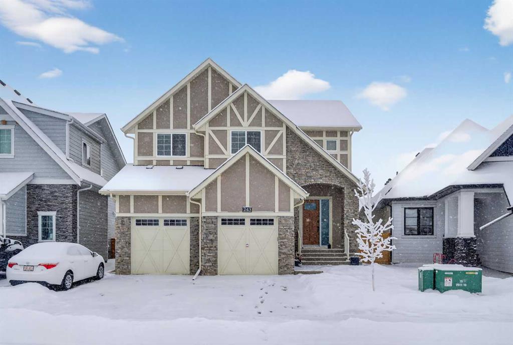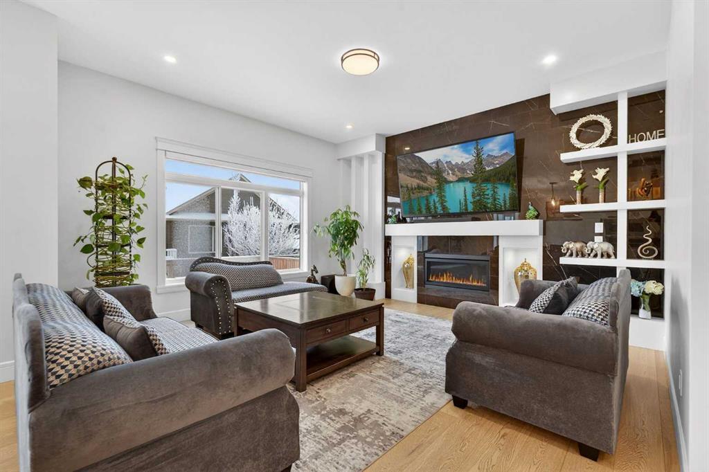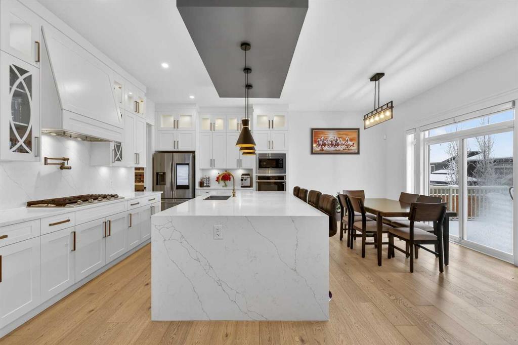 Welcome to this exceptional custom-built luxury residence situated in the prestigious community of Coopers Crossing , this refined two-storey home offers nearly 4,000 sq.ft. of meticulously designed living space, blending elegance, comfort, and timeless craftsmanship. With 4 generously sized bedrooms and 3.5 beautifully appointed bathrooms, this home delivers a grand first impression from the moment you step inside the impressive front foyer, featuring soaring double-height ceilings, a bespoke staircase with wrought iron railing, and a striking designer chandelier. The main level showcases elevated finishes and exceptional attention to detail, highlighted by rich custom millwork, expansive ceilings, a private office, and a versatile flex space suited for modern luxury living. The gourmet kitchen serves as the centerpiece of the home, complete with premium built-in appliances, a sleek gas range, thoughtfully designed cabinetry, and sophisticated finishes throughout. The adjoining dining area comfortably accommodates a 10-person table, ideal for hosting elegant gatherings, while the oversized island provides additional seating and functionality. The living room is both refined and inviting, offering custom built-ins and a dramatic fireplace framed by bold black tile, creating a modern yet timeless focal point. Upstairs, the custom staircase leads to an oversized bonus room with built-in entertainment cabinetry, perfect for relaxation or entertaining. The primary retreat is truly impressive, featuring double-door entry, designer wall detailing, integrated speakers, and a stunning fireplace. The spa-inspired ensuite is equipped with a double vanity, deep soaker tub, and an expansive steam shower, delivering a true resort-like experience. Two additional spacious bedrooms complete the upper level, each offering its own walk-in closet. The fully developed basement continues the luxury theme, designed as an entertainer’s retreat with custom built-ins and a generous wet bar ideal for showcasing fine spirits. A fourth bedroom and full bathroom complete the lower level, providing exceptional comfort for guests or extended family. Additional premium features include central air conditioning, central vacuum system, and a heated garage designed for year-round convenience. The garage is further enhanced with a fully equipped kitchen setup, ideal for cooking spicy or aromatic foods, offering both practicality and thoughtful design. This remarkable home offers sophisticated living in one of Airdrie’s most sought-after communities. Book your private showing today and experience this stunning property firsthand.