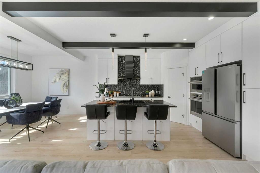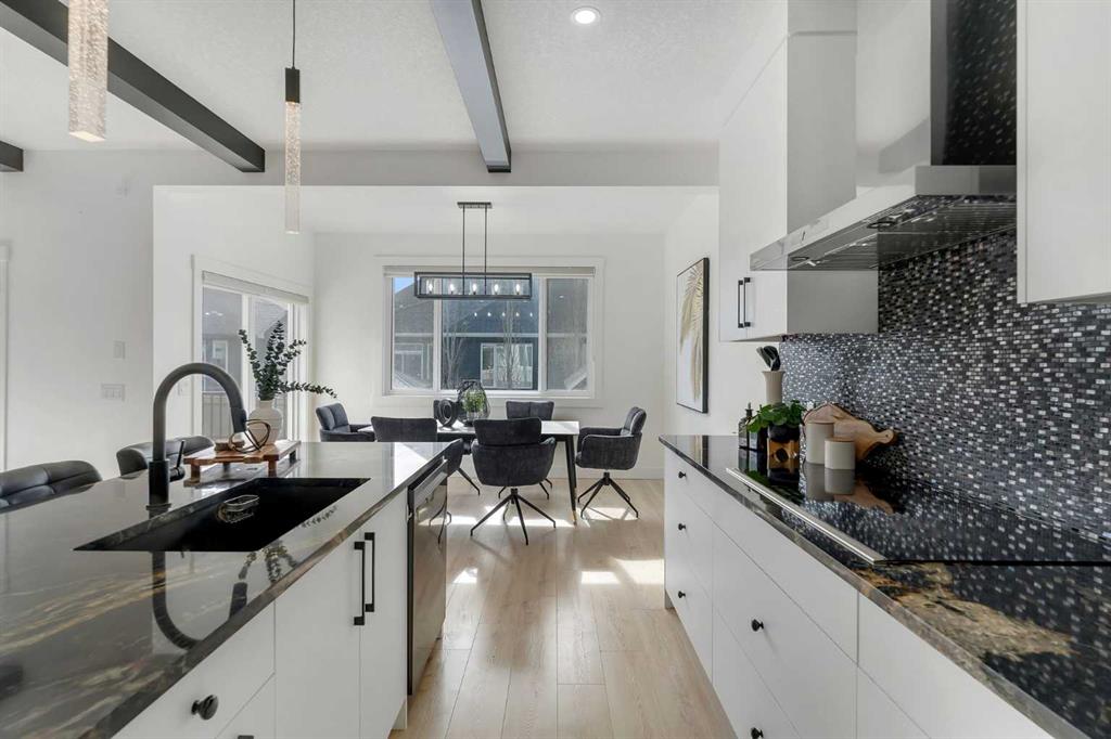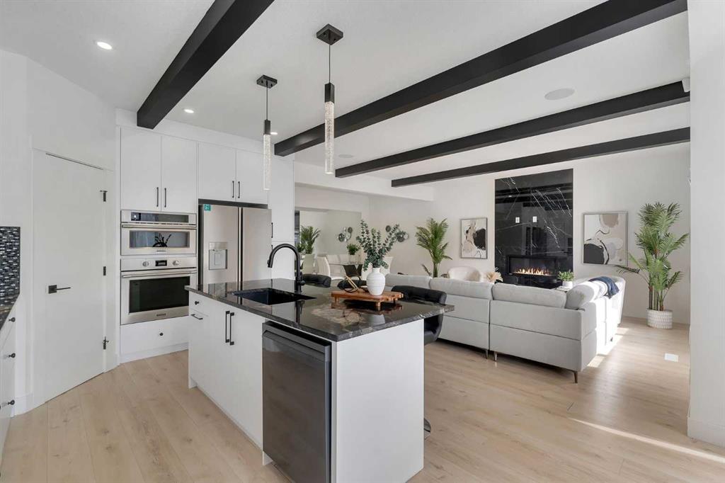The chef-inspired kitchen is beautifully upgraded with built-in appliances, a chimney-style hood fan, ceiling-height cabinetry, and sleek black hardware throughout. The living room showcases a striking feature fireplace with bold black tile detailing, adding warmth and sophistication. Large windows across the main floor allow for an abundance of natural light, while the elegant spindle railing enhances the overall design.