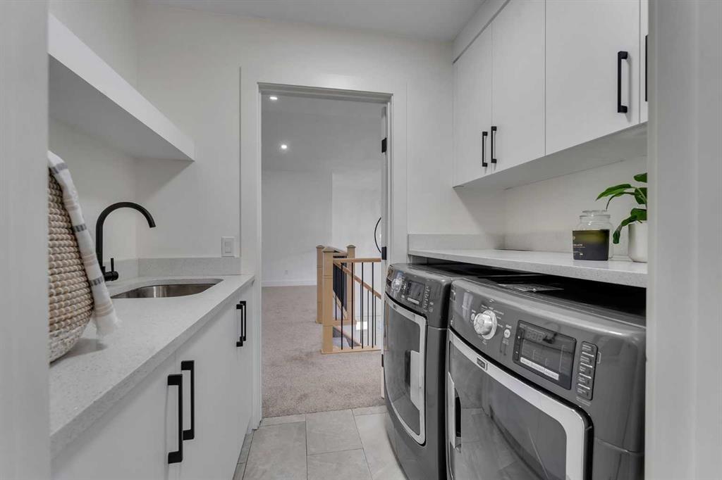 The upper-level laundry room is equipped with a sink and additional storage for convenience. All secondary bedrooms are well-proportioned, with access to two additional full bathrooms.
