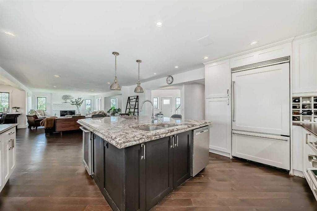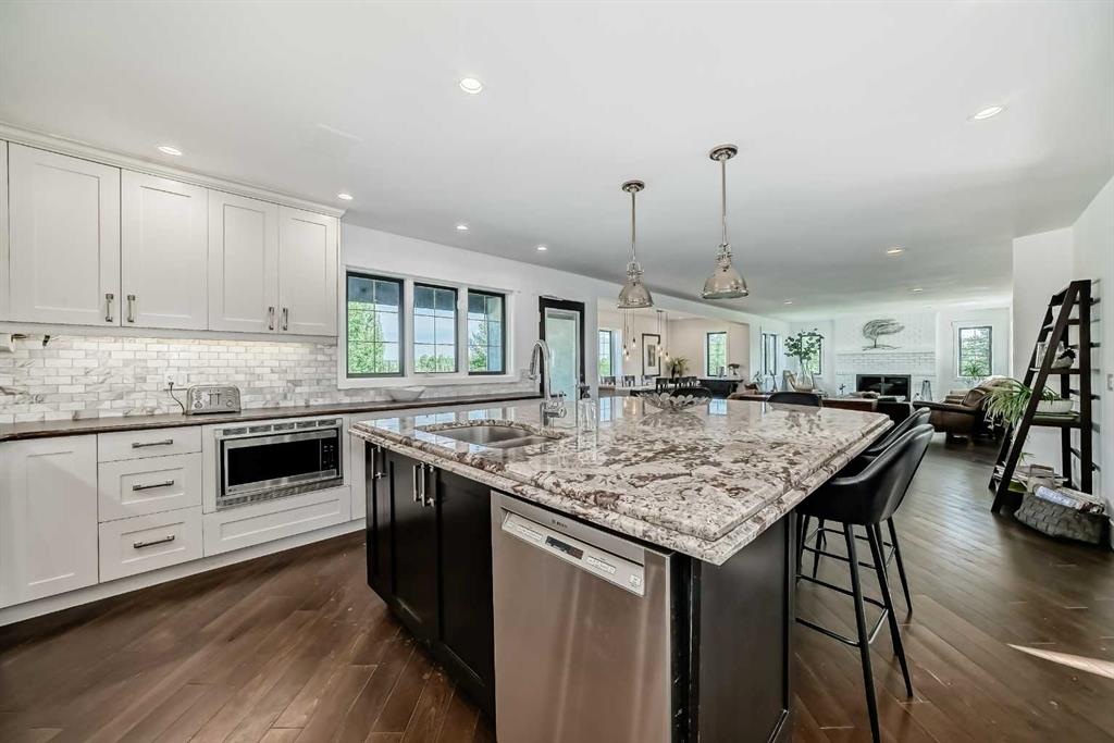 Experience the best of both worlds with this breathtaking 4-acre estate, where idyllic country living meets exceptional comfort and style. This impeccably maintained 2-storey walkout residence with 4782 sq ft of total living space blends timeless European charm with luxurious finishes, featuring rich oil-stained hardwood, elegant brick wood-burning fireplaces, and a grand tower foyer with a curved staircase. The main level offers a spacious living room, formal dining area, and an open gourmet kitchen with modern shaker cabinetry, granite countertops, and an eating bar—ideal for entertaining. A large family room gives you tons of extra space for the family. Upstairs, you’ll find three generous bedrooms, including a stunning primary suite with a spa-like ensuite. The fully developed walkout level—currently set up as a full illegal in law suite—includes an additional bedroom, den, large family room, kitchen, and separate access. The home showcases tile, hardwood, and carpet flooring, and is complemented by a detached 2-car garage, paved circular driveway with RV parking potential, expansive fenced garden, firepit, storage area with a unique wood-burning sauna and games room, plus a garden shed, mature trees, and landscaped grounds. Zoned for horses and close to both private and public schools. This property offers the tranquil living just minutes from Calgary and located close to the future Bingham crossing shopping centre featuring Costco! You will love the quick access to Highway 1 for heading out of town and other destinations. It will be a pleasure to move when this is your destination!