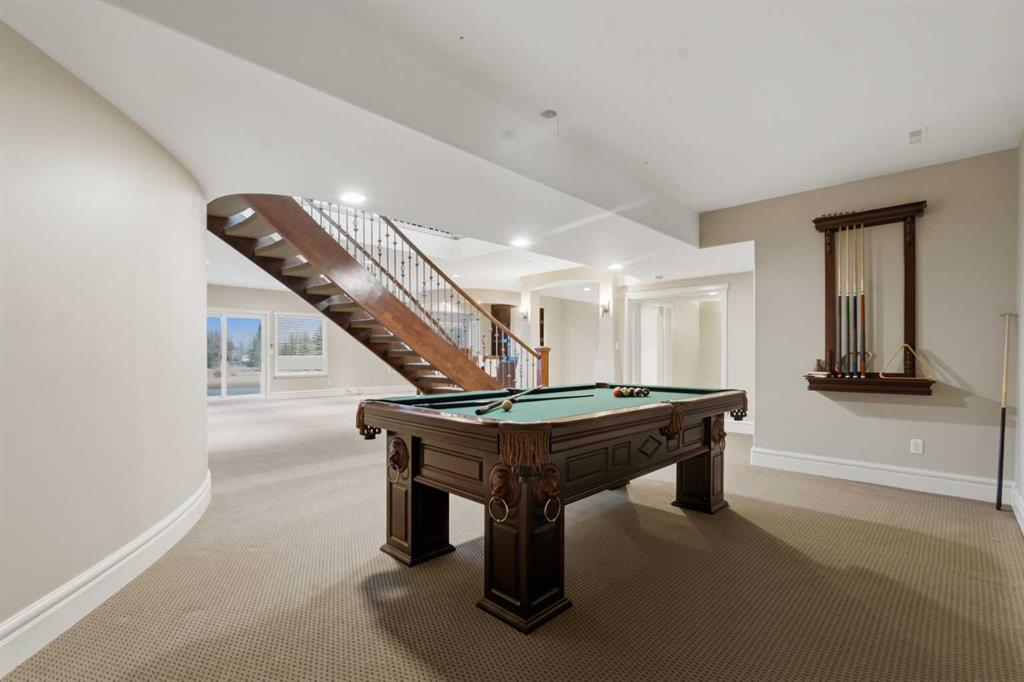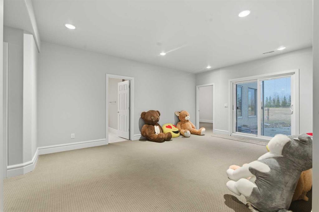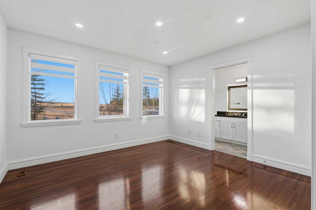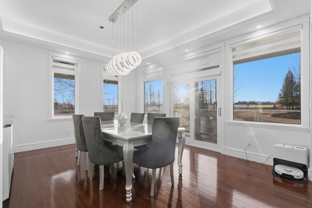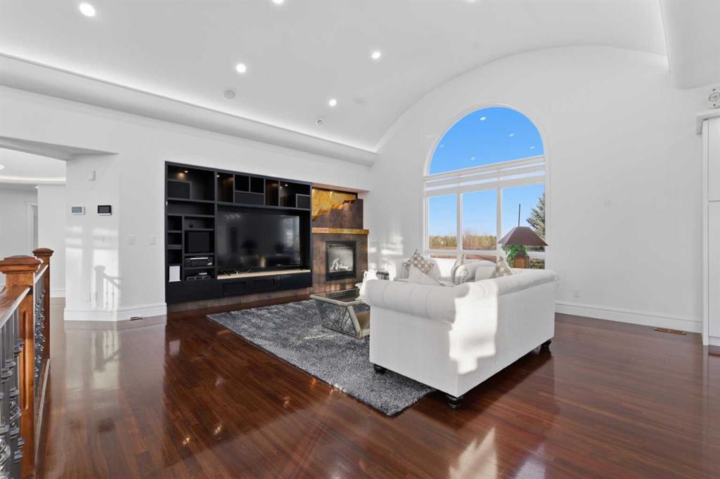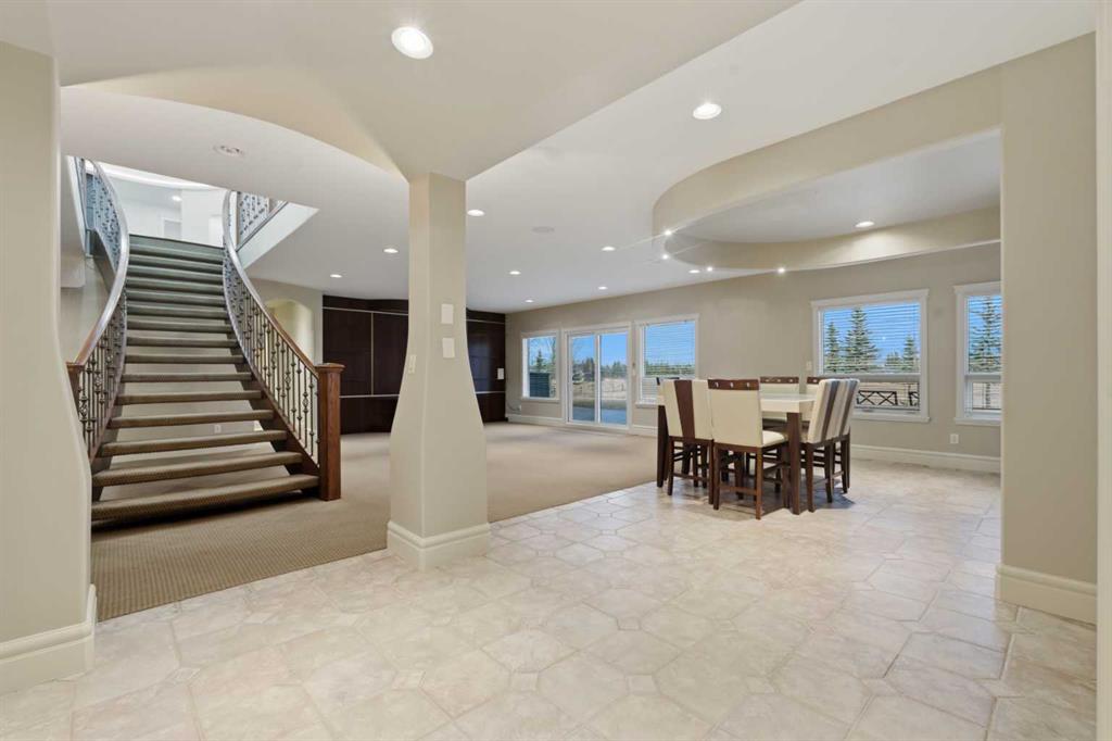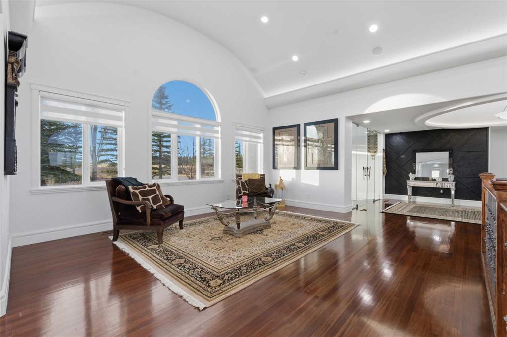 3.62 ACRES | 7 BED & 8 BATHS | OVER 7000 SQFT OF LIVING SPACE | WALKOUT BASEMENT | HEATED QUAD GARAGE + TANDEM 2 CAR GARAGE | ABOVE-GARAGE AREA EASILY SUITABLE WITH COUNTY APPROVAL | Unparalleled luxury defines this Springbank estate set on 3.62 acres, blending timeless elegance with modern comfort in a prestigious location minutes from Calgary. Central A/C, exceptional views & exquisite craftsmanship establish a refined living experience from the start. A sophisticated entry introduces a grand open floor plan with 14’ cove-vaulted ceilings & site-finished Brazilian cherry hardwood that amplifies natural light. Oversized windows in the living room frame serene country scenery, while the dining room provides an elevated backdrop for hosting with designer lighting & corner windows capturing sweeping views. A welcoming family room centres around a gas fireplace & custom media unit to create a warm everyday gathering space. The chef’s kitchen supports large-scale cooking with high-end appliances, custom cabinetry, a spacious island & a built-in table for casual meals. A powder room is conveniently placed for guests. The primary bedroom is a private retreat with a spa-inspired ensuite featuring a deep soaker tub, oversized shower, dual vanities & a massive custom walk-in closet. A second bedroom with its own 3-piece ensuite plus 1 of 3 laundry rooms complete this level. The upper floor includes a bright 4-piece bathroom with skylight, a bedroom with a 3-piece ensuite & walk-in closet, along with 2 additional bedrooms, offering excellent flexibility for families or multigenerational living. Stylish design continues through the bright walkout basement where an entire wall of glass connects indoor living with the outdoors. A generous family room with built-in media center is ideal for movie or games nights, while a wet bar keeps refreshments close at hand. A Cigar room with proper ventilation. A recreation area cab accommodate a pool table or play space. A third laundry room & powder room add everyday convenience. 2 bedrooms sit on opposite sides of a spacious bonus zone to form a natural hangout area, with 1 bedroom featuring a private 4-piece ensuite & walk-in closet. Another 3-piece bathroom, a dedicated gym & ample storage add valuable function. Outdoor living excels with a wraparound lower patio & an upper deck with glass railings that preserve the panoramic views. The property is zoned for 2 horses & allows up to 2040 sqft of outbuildings, creating opportunities for equestrian use, a hobby farm or future development. A heated quadruple garage sits alongside a tandem 2 car garage offering extensive room for vehicles, equipment or workshop needs. Above-garage space is easily suitable with county approval, elevating long-term versatility. This estate delivers luxury, privacy & convenience in one of Springbank’s most sought-after settings mere minutes to the city!