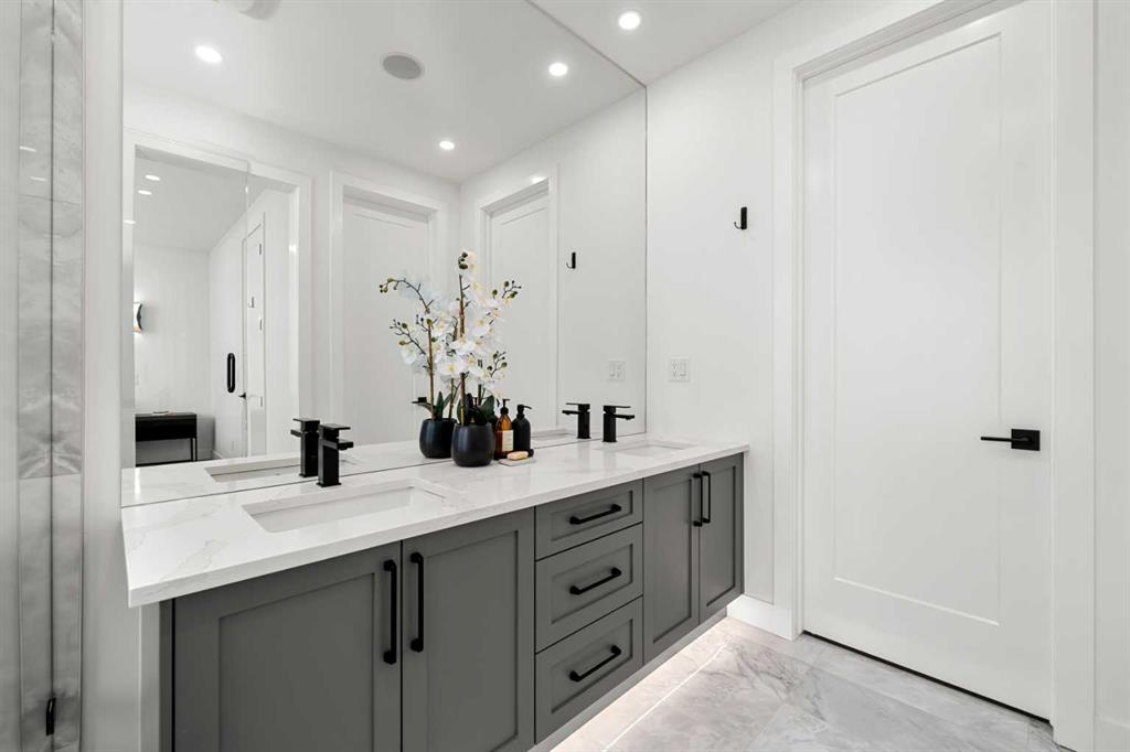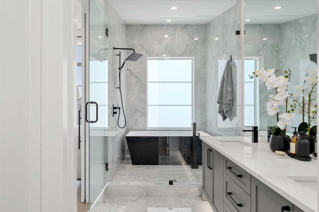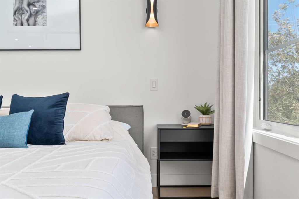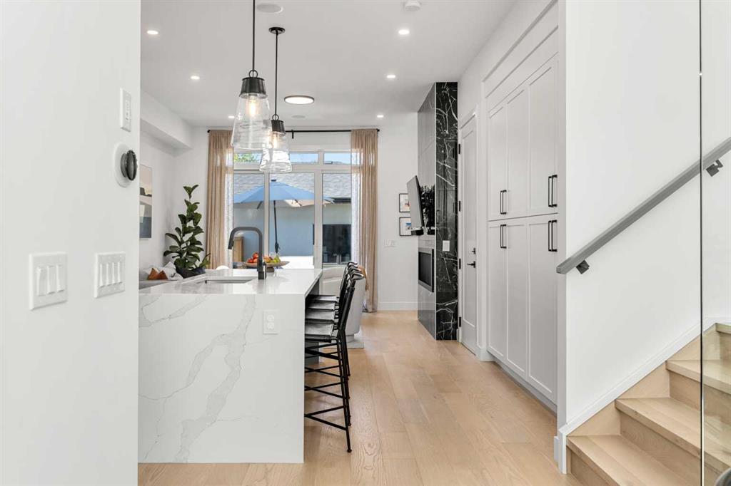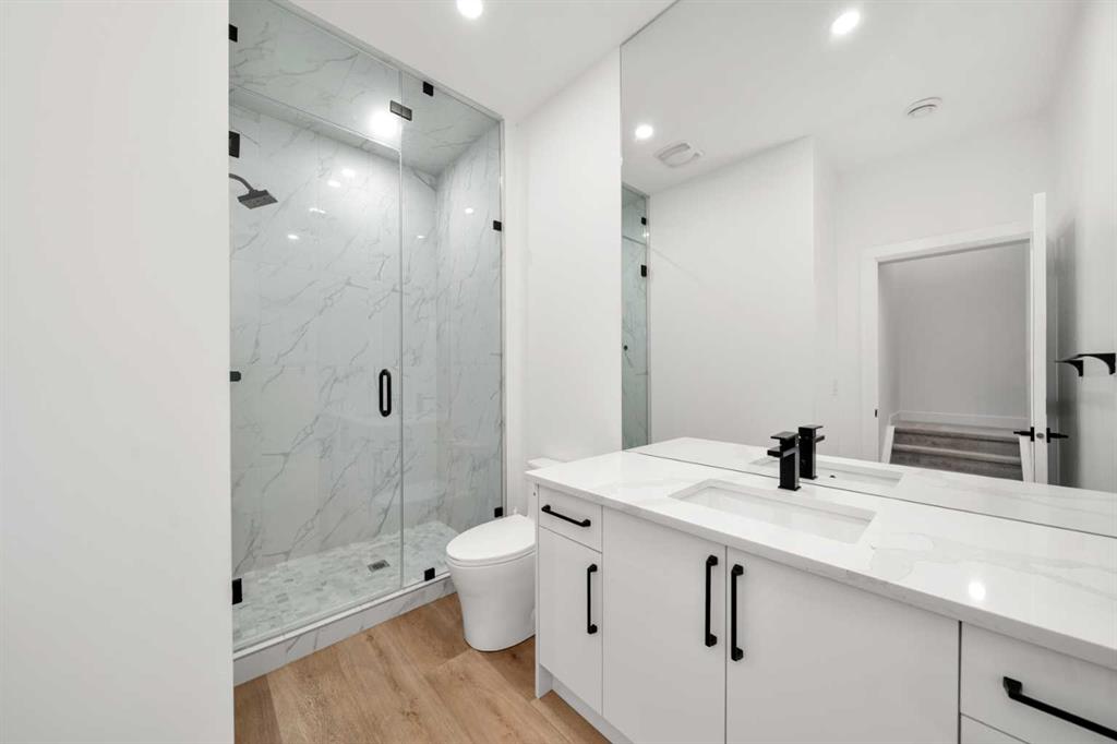 Welcome to 2503 20 Street SW, a beautifully designed semi-detached home in Richmond with 2,313 sqft of living space featuring a full legal basement suite, west-facing backyard, A/C, and high-end finishes throughout, with 4 bedrooms, and 4 bathrooms. The main level offers an open floor plan with floor-to-ceiling windows, a cozy gas fireplace in the living room, and a chef’s kitchen with engineered hardwood flooring throughout. And as a bonus, extra storage and cupboard space in your kitchen. Sleek glass panel banisters lead upstairs, where you’ll find laundry, 3 spacious bedrooms, and a stunning primary ensuite highlighted by a luxurious wet-room design with a deep soaker tub set beside a frosted window, all within a large walk-in shower, plus dual vanities.