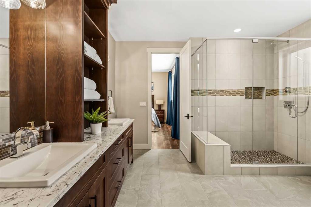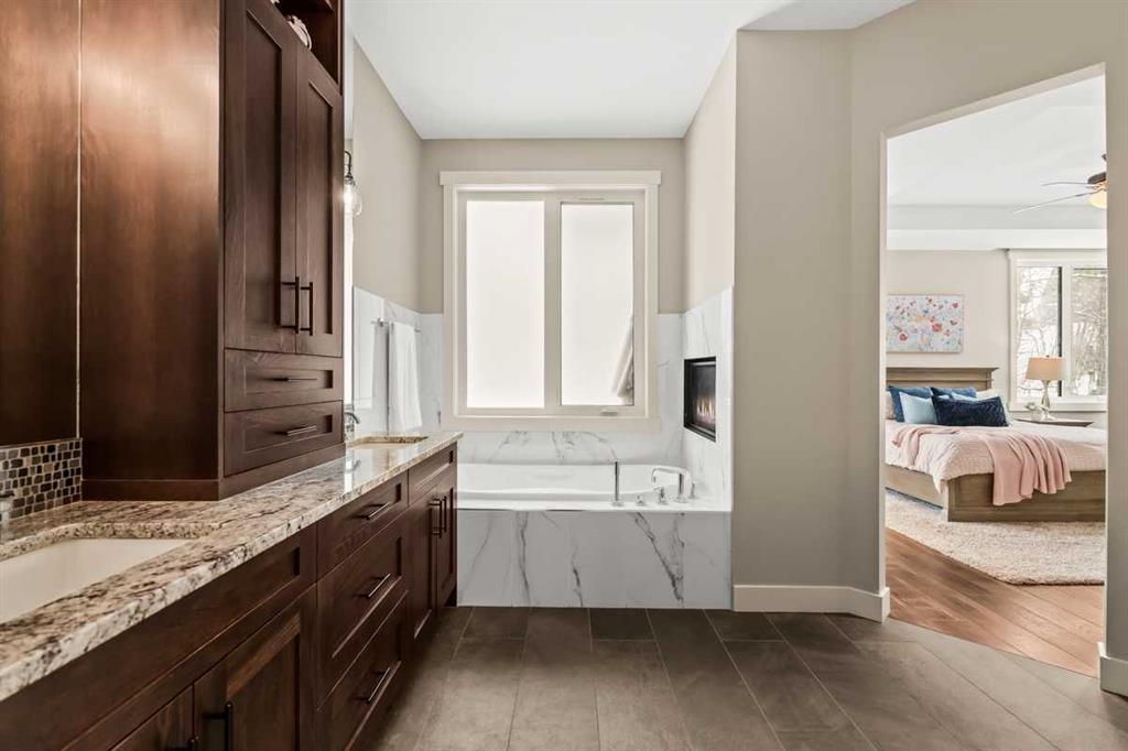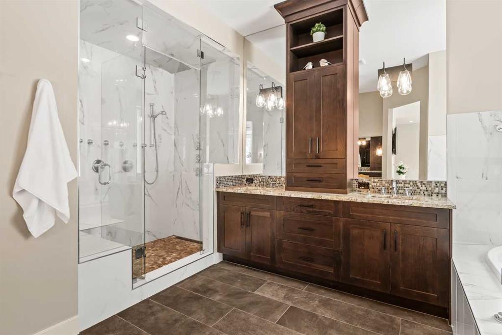 Designed with consideration for main floor living, this home offers an exceptional layout. Two generously sized bedrooms, each with their own walk in closets and private ensuites, are complemented by a home office, a well appointed laundry room, and an exquisite primary retreat. Entered through elegant French doors, the primary suite is a private sanctuary, complete with a spa inspired ensuite featuring a deep soaker tub, makeup vanity, steam shower, dual vanities, and an expansive walk in closet.