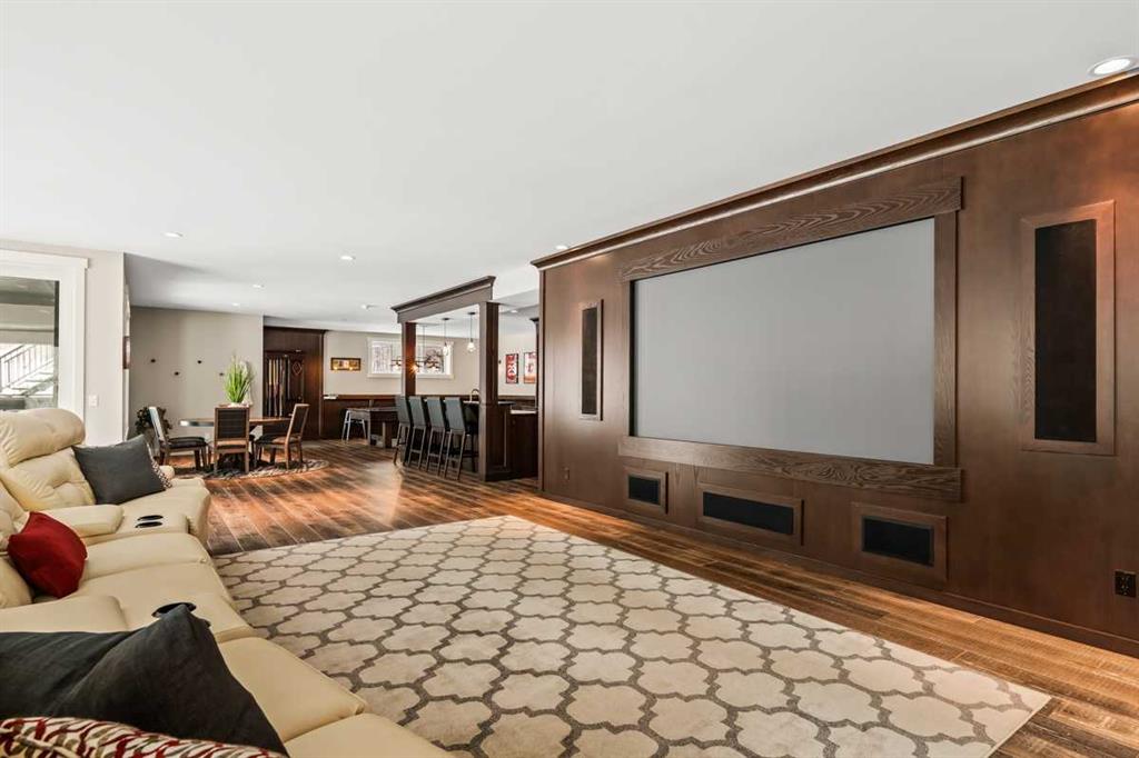 The walkout lower level elevates the home’s entertainment experience to an entirely new level. Even more expansive than the main floor, it features two additional bedrooms and an impressive array of entertaining spaces, including a full custom bar, a feature wine wall, and dedicated areas for billiards and poker. Step outside to your private outdoor retreat with a hot tub and beautifully crafted firepit area—perfect for year round enjoyment. A state of the art projection system and oversized screen transform movie nights into a true cinematic experience.