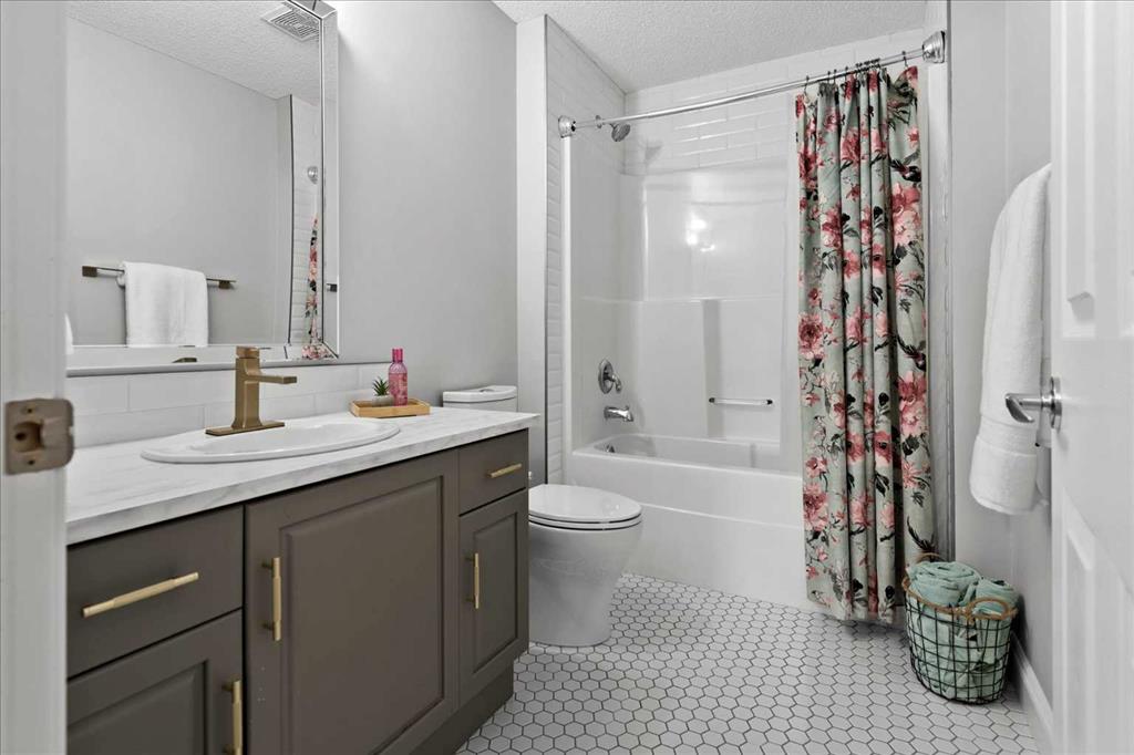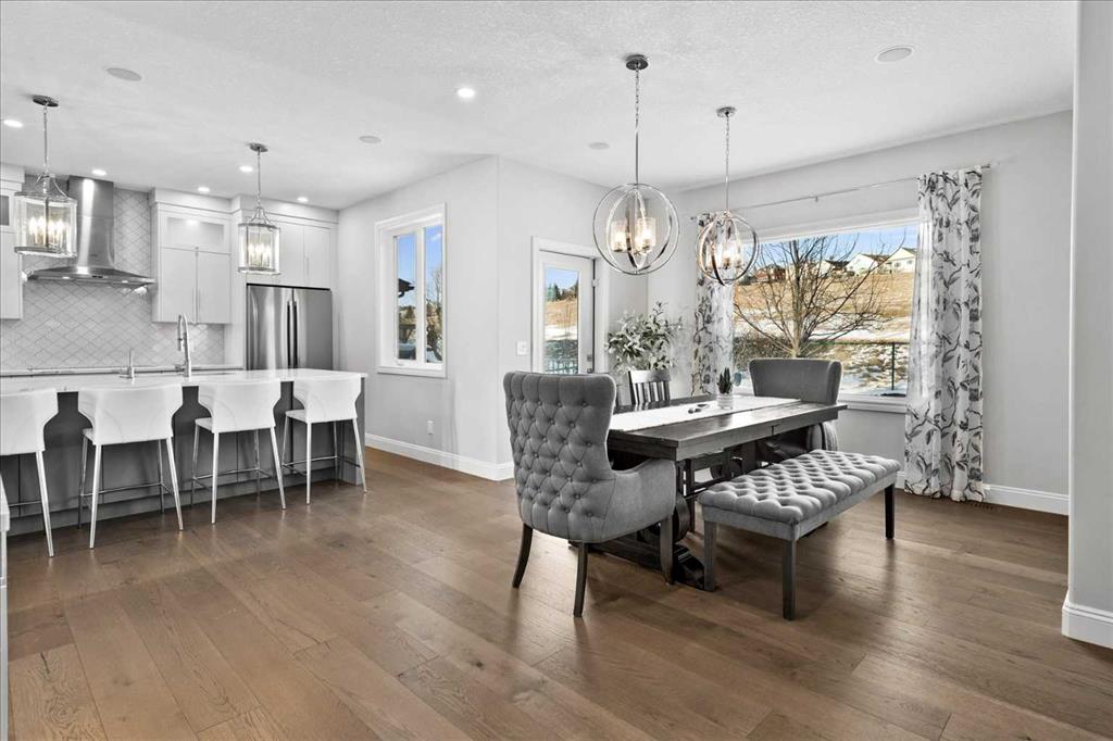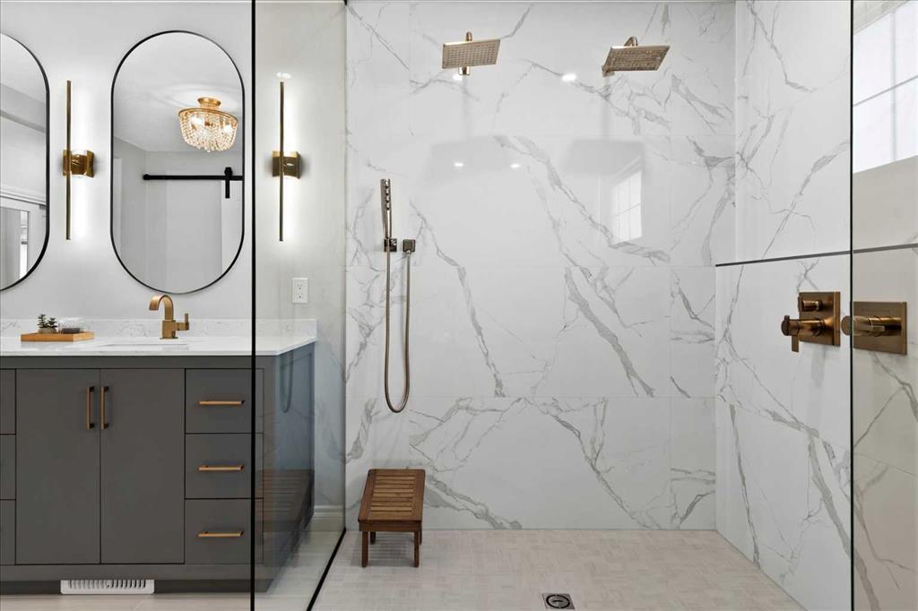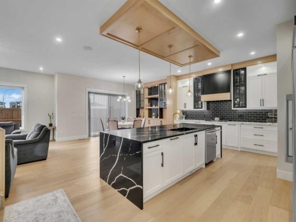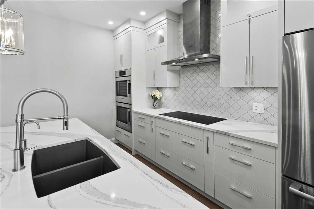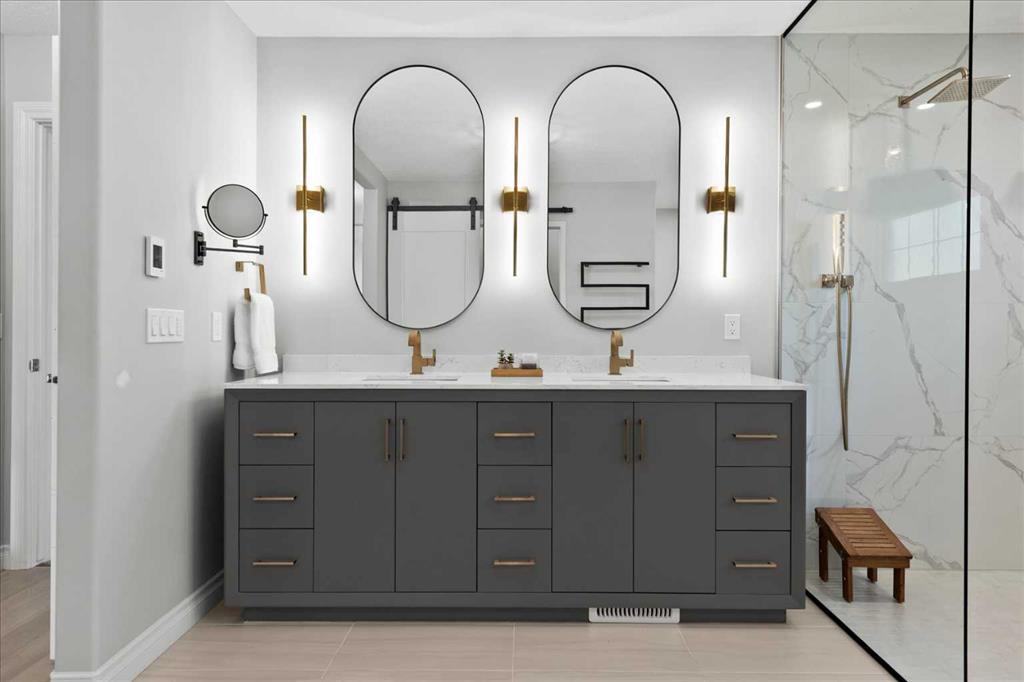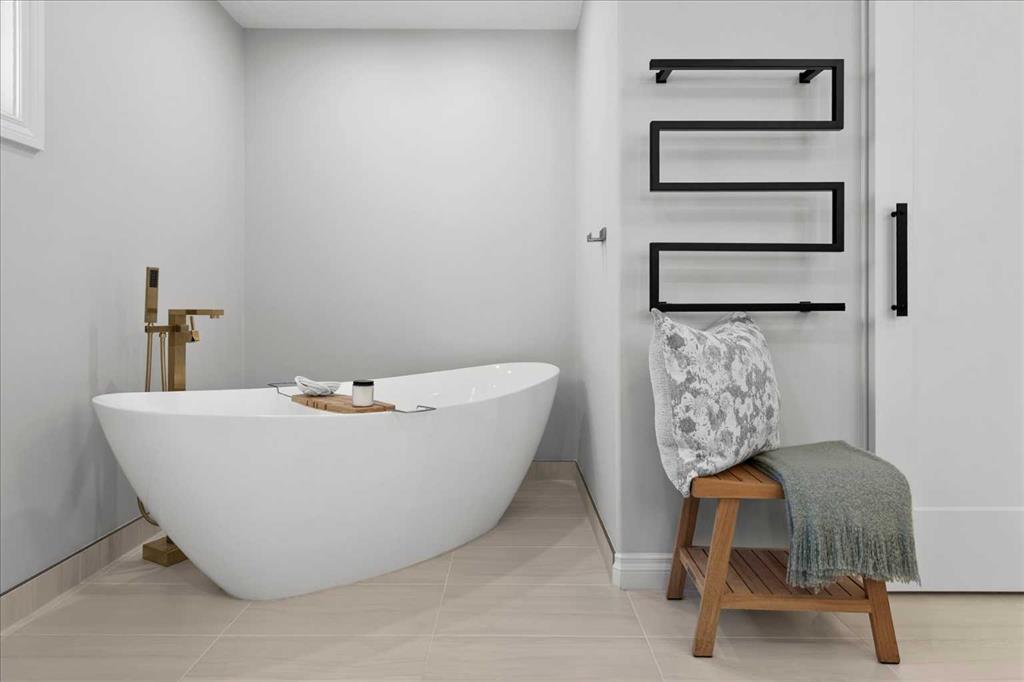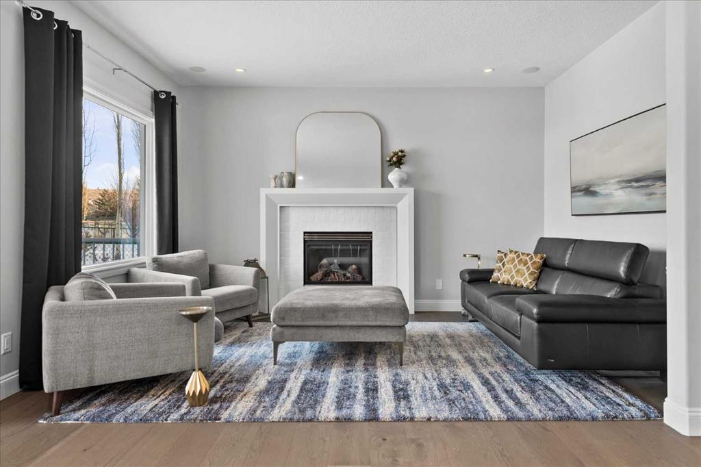Upstairs, retreat to the breathtaking primary bedroom with gas fireplace and access to a private balcony—the ideal place to enjoy your coffee at sunrise or take in the mountain views at sunset. The ensuite is a stunning 7 pce spa-like retreat with underfloor heating. Two additional bedrooms, a beautifully renovated 4-piece bath, over sized family/media room and convenient upper-level laundry complete this level. The fully developed lower level offers additional living space including a fourth bedroom, generous family room, work out area and a renovated 3-piece bathroom—ideal for guests or growing families.