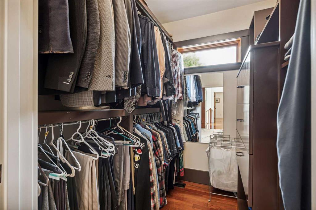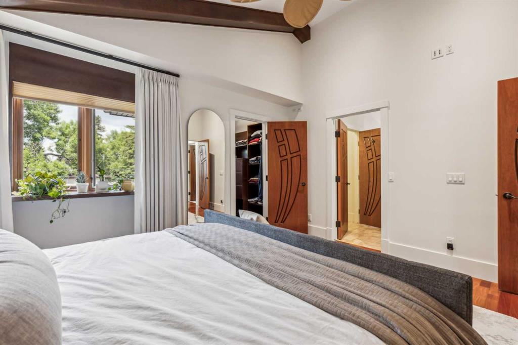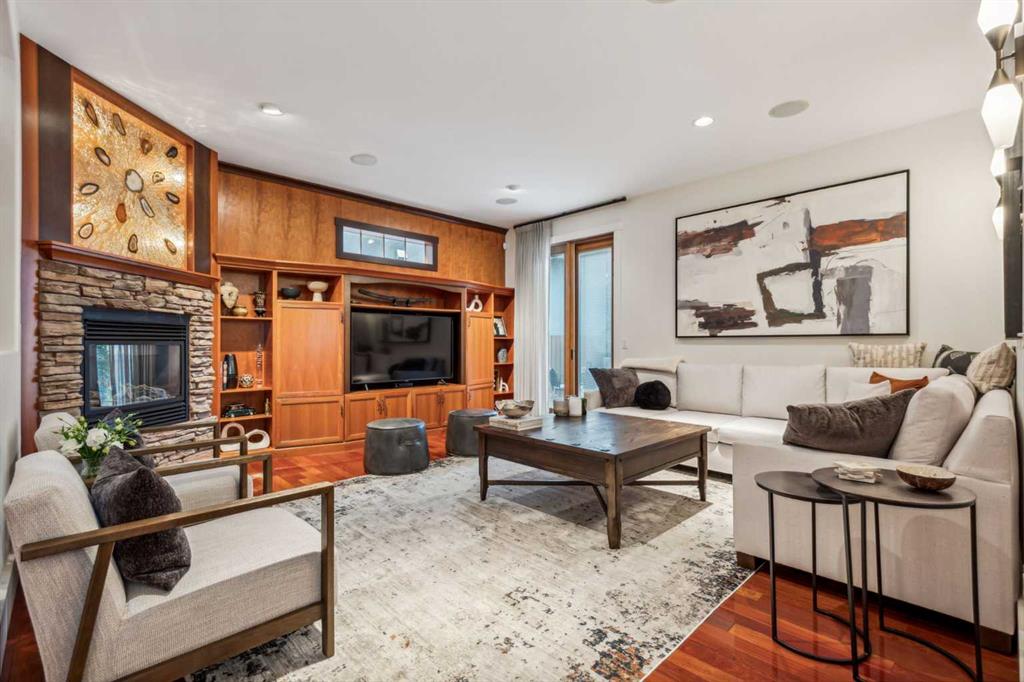 The main floor is bathed in natural light from abundant windows, highlighting the rich Jatoba hardwood floors and solid core doors. Enjoy cozy in-floor heating and the comfort of air conditioning year-round. The living room serves as the heart of the home, featuring a custom-built surround fireplace and patio doors that seamlessly connect indoor and outdoor living. Entertain effortlessly in the gourmet kitchen, complete with integrated cherry cabinetry, granite countertops, a built-in table, and top-of-the-line appliances. Adjacent is the formal dining room with an open-beam ceiling that exudes elegance, plus a versatile den with a built-in desk—perfect for a home office or study.