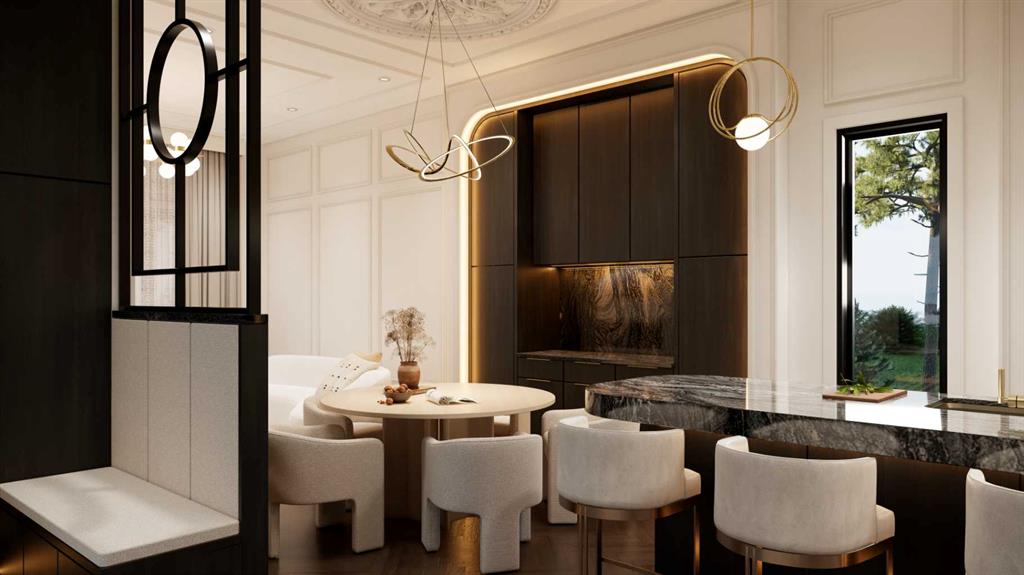 The rear living space is designed as a relaxed gathering area, centred around a contemporary fireplace feature with room for a full media setup. Oversized bi-parting patio doors are planned to open to the backyard, allowing the space to remain light-filled throughout the year. A discreet powder room is positioned off the staircase, while a side entry mudroom with built-in storage offers a functional transition from outdoors, keeping the main living areas uncluttered.