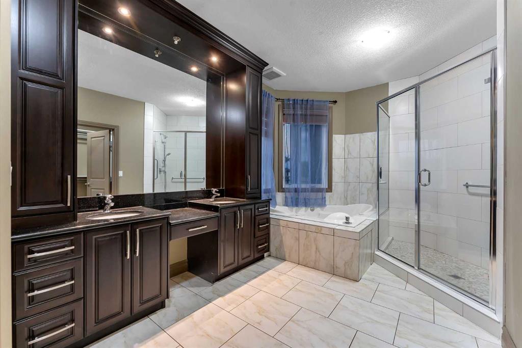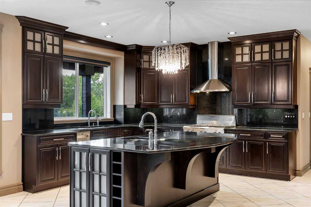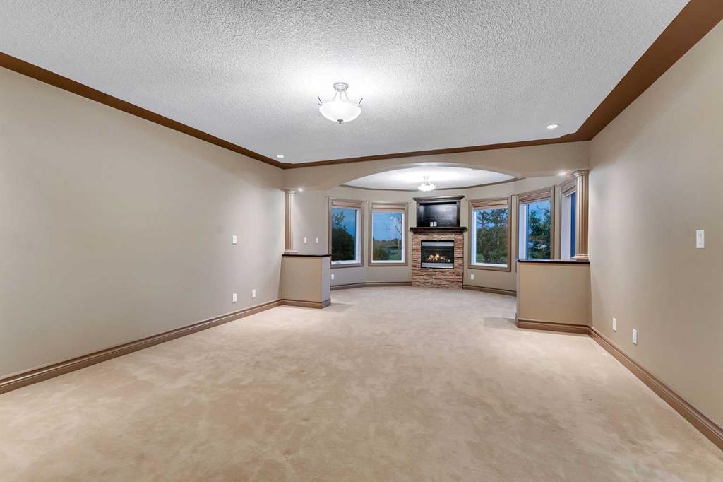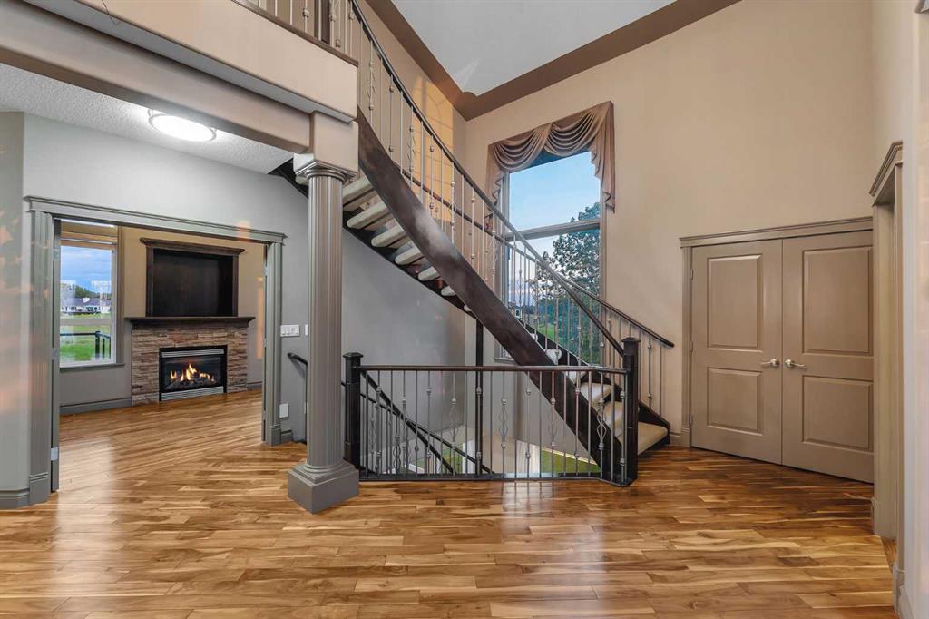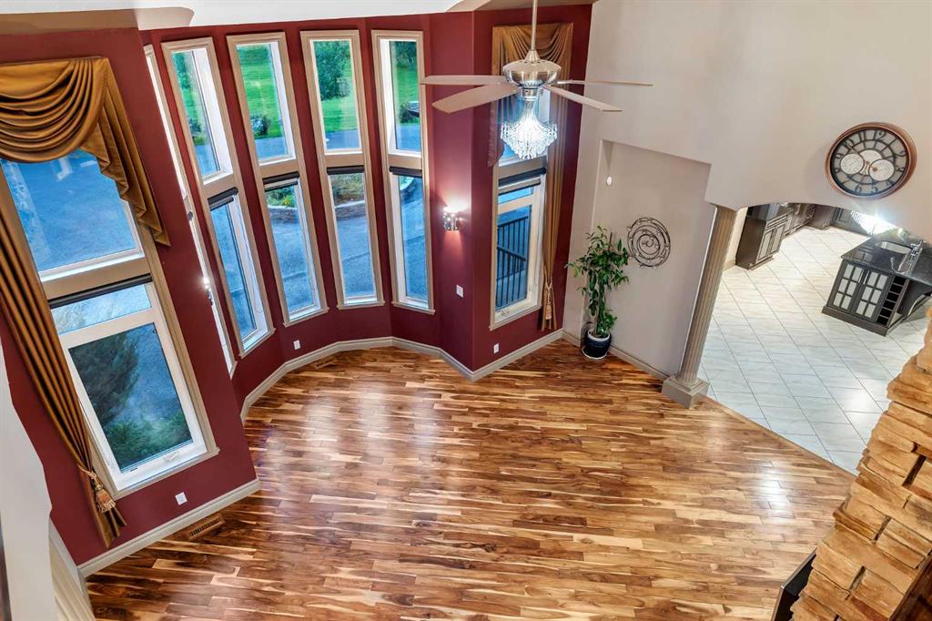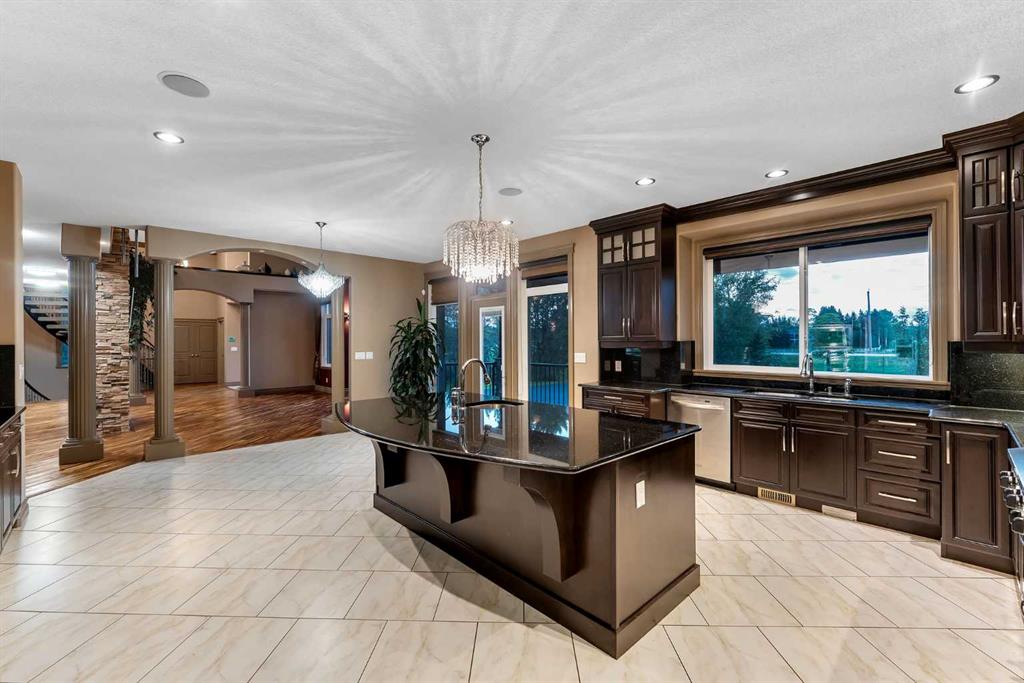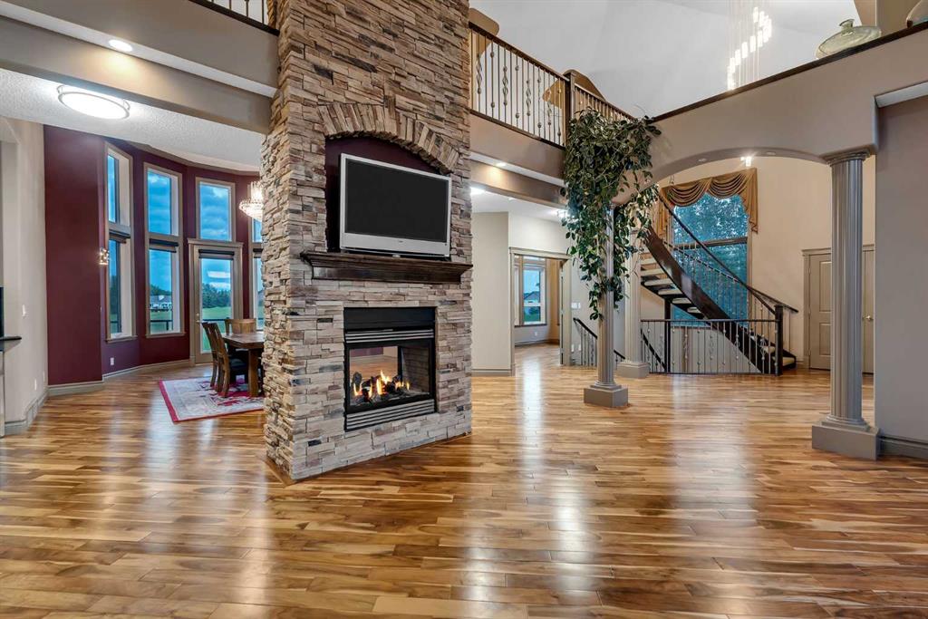 Discover refined acreage living on a fully landscaped 2-acre lot in one of Bearspaw’s most coveted locations. This over 6,000 sq ft walkout estate blends timeless elegance with modern versatility, offering spaces designed for both everyday comfort and impressive entertaining. A striking open-riser staircase and upper walkway welcome you into a light-filled main floor. A stone-faced fireplace warms the private den, ideal for a home office or reading nook, while the gourmet kitchen features cherry cabinetry, stainless appliances, a gas range, and a spacious walk-in pantry. The kitchen flows into the vaulted-ceiling living room and dining area, where a double-sided fireplace and expansive windows frame lush greenery and distant mountain views. Thoughtfully designed for both privacy and connection, the home offers a serene main-level primary suite with private deck access, panoramic windows, and a spa-inspired ensuite. Upstairs, a second private suite with its own fireplace and 5-piece ensuite provides flexibility for guests or older children, alongside two additional generously sized bedrooms and a full bath—perfect for younger family members or long-term guests. The fully finished walkout basement is an entertainer’s dream, with a wet bar, wine storage, theatre room, two additional bedrooms (one with ensuite), and space for a gym, studio, or hobbies. This level opens directly to your outdoor oasis, where mature trees, manicured gardens, and multiple seating areas create a year-round retreat for gatherings or quiet relaxation. With exceptional craftsmanship, a versatile layout, and a prime Bearspaw address just minutes from Calgary, this home offers the perfect balance of luxury, space, and lifestyle. Book your private showing today and experience Bearspaw living at its finest.