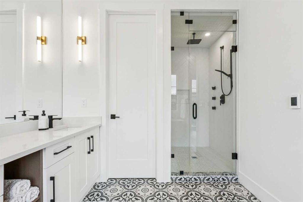 Upstairs, the primary suite is a serene retreat defined by a vaulted ceiling, abundant natural light, and a spacious walk-in closet. The spa-inspired ensuite elevates daily living with designer tilework, dual vanities, and a sculptural freestanding soaking tub. Two additional bedrooms, a beautifully appointed main bath, and a convenient upper laundry room round out this thoughtfully designed level.
