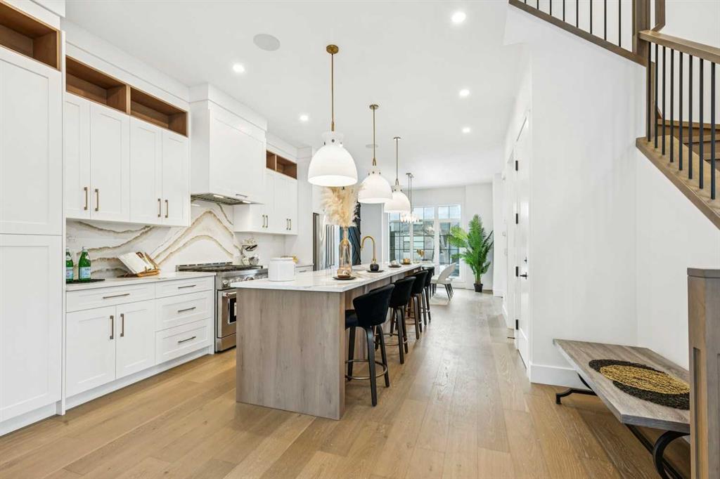 A welcoming formal dining space makes an elegant first impression, setting the stage for the home’s elevated aesthetic. The space transitions beautifully into a show-stopping chef’s kitchen, anchored by a dramatic 12-foot quartz waterfall island that serves as both a design centrepiece and an entertainer’s dream. Premium finishes, clean lines, and thoughtful layout create a kitchen that is as beautiful as it is practical.