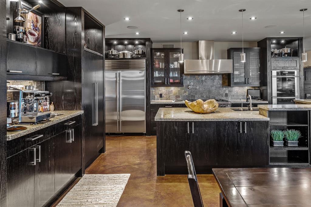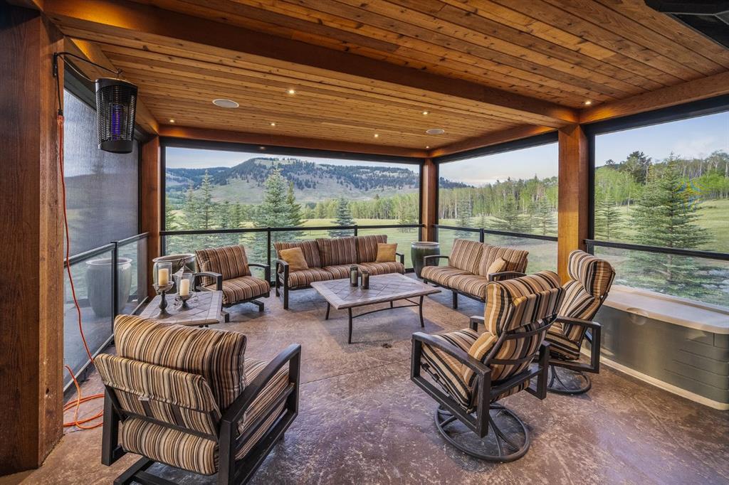 Inside, polished concrete floors, soaring ceilings, and expansive windows immerse the home in natural light and endless mountain views. The heart of the home is a chef’s kitchen complete with a massive island, premium appliances, and seamless connection to a covered outdoor living room with Phantom screens, a gas fireplace, and overhead heaters—creating a true indoor-outdoor sanctuary for year-round enjoyment.