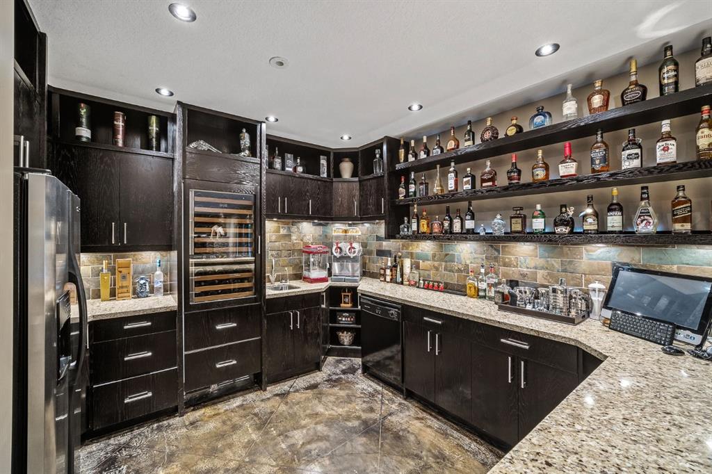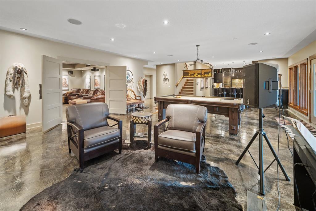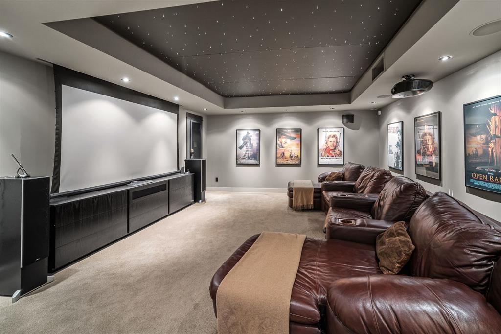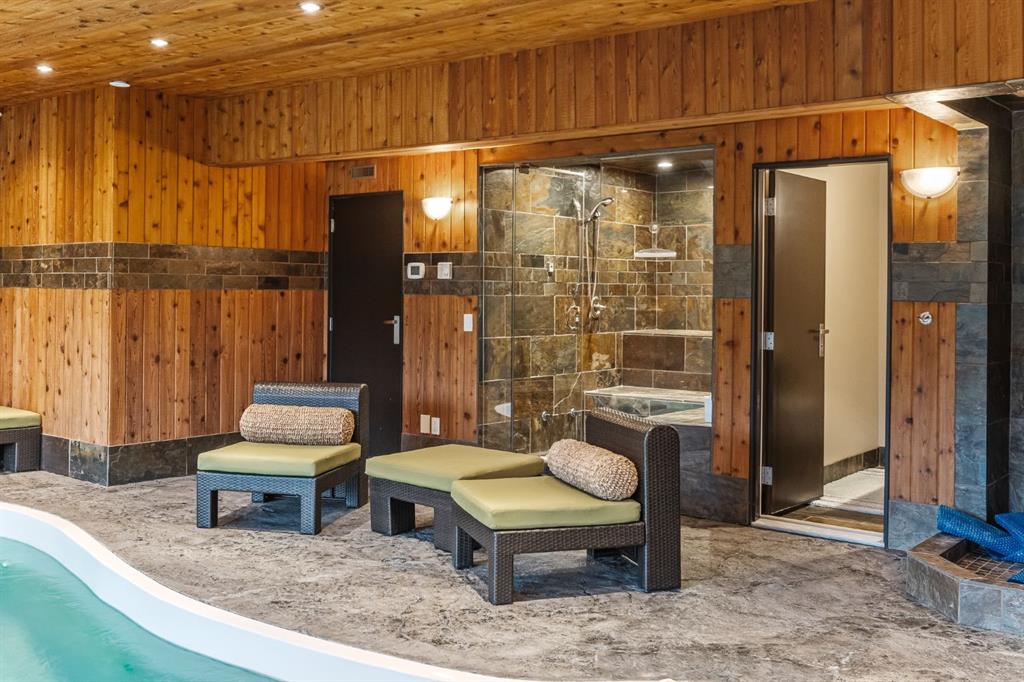 The fully developed walkout level is designed for elevated entertaining, featuring a full bar, games area, theatre with a starlit ceiling, two guest bedrooms, and a third laundry space. A dedicated dog wash and mudroom add practicality, while the cedar-clad indoor pool room is the ultimate in-home spa—complete with swim jets, a recessed hot tub, steam room, shower, and ambient LED lighting.