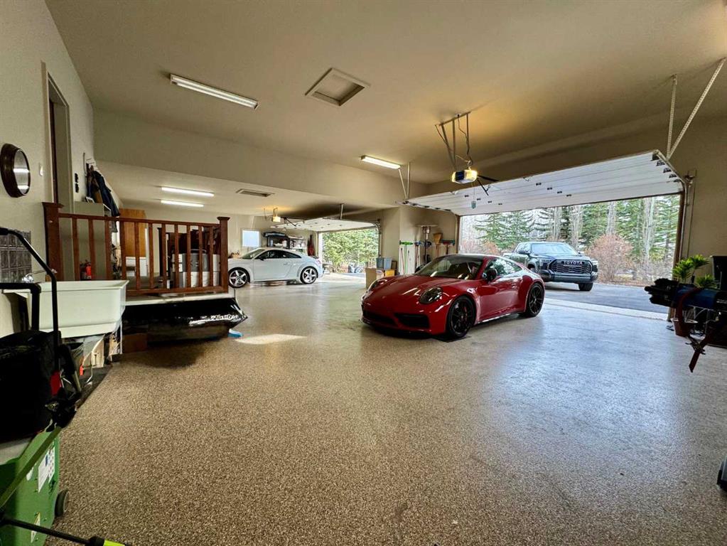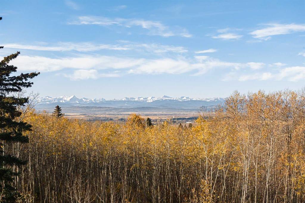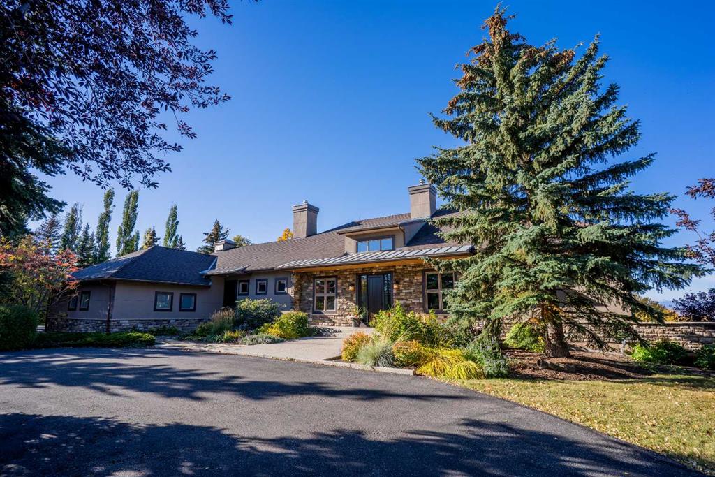 This exceptional, one-of-a-kind property offers the best of Springbank living — privacy, tranquillity, and breathtaking Rocky Mountain views. Set on a picturesque 2.17-acre lot in the heart of Pinnacle Ridge, this walkout bungalow sits high on the ridge, surrounded by beautifully landscaped grounds that provide seclusion from the street and neighbours. Tucked away from main roads, the property features its own private ravine, approximately one acre of mature trees and natural landscape, offering beauty and privacy while minimizing yard maintenance. A circular driveway flanked by mature trees sets the tone from the moment you arrive — this is truly something special. Inside, you’re greeted by stunning mountain vistas and an open layout. The beautifully renovated kitchen features a large island, granite countertops, and high-end appliances, including a Sub-Zero refrigerator, wine fridge, microwave, and 48” Wolf gas range. It opens to a bright dining space and sitting area with access to the large main deck (23' x 22'). The spacious living room, complete with a fireplace, perfectly frames the magnificent mountain backdrop. The main-floor primary suite offers a luxurious six-piece ensuite and a generous walk-in closet. The main level also includes a home office, two powder rooms, a walk-in pantry, and a mudroom that connects to an oversized four-car garage. The 54' x 26' garage (1,279 sq. ft.) is insulated, drywalled, painted, and finished with epoxy flooring, with half the space offering a 12’3” ceiling that is ideal for large trucks or lifts. The walkout lower level features a large recreation room, a wet bar that seats up to ten, a dedicated theatre room, three additional bedrooms, and two full baths. Cherry hardwood and tile flooring flow throughout the home, with wool carpet in the lower-level bedrooms for added comfort. The exterior showcases stucco and stone, complemented by a newer asphalt shingle roof (2020, 50-year warranty). An enclosed under-deck storage room is ideal for garden tools or a ride-on mower. This immaculate property has been meticulously maintained by its current owners, with recent mechanical upgrades including two new furnaces with humidifiers (2019) and two new air-conditioning units (2024). A truly remarkable estate combining privacy, panoramic views, and refined living in one of Springbank’s most sought-after locations.