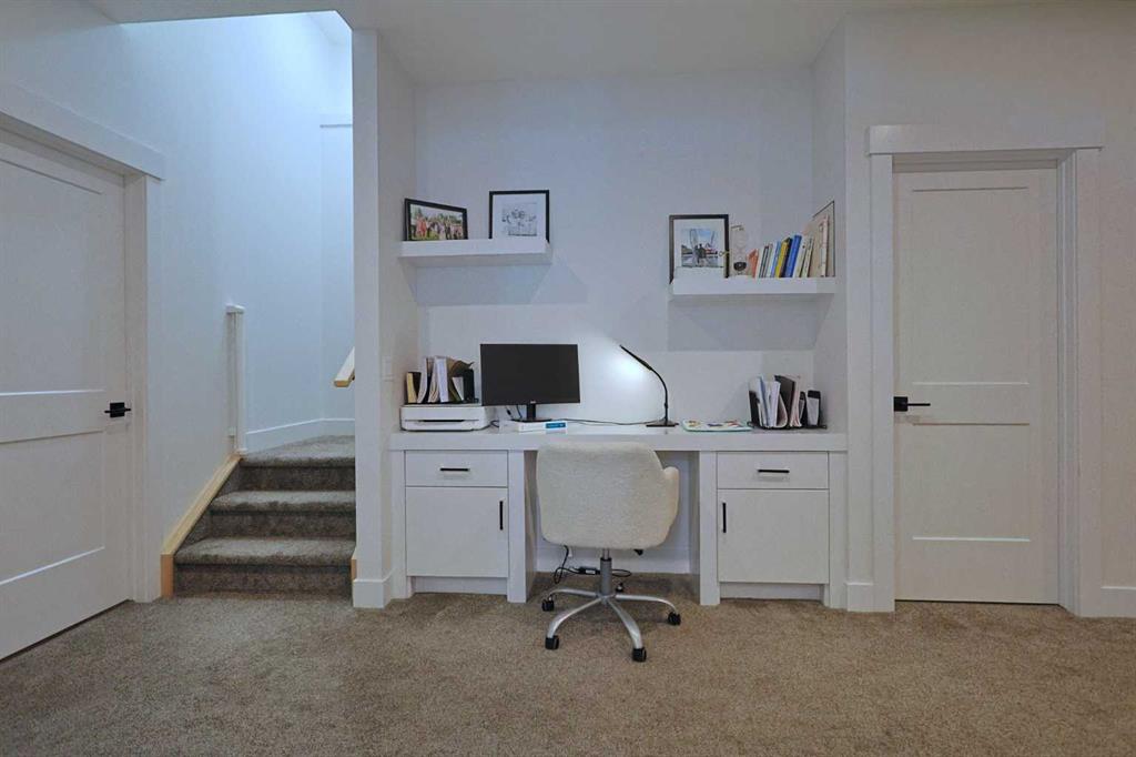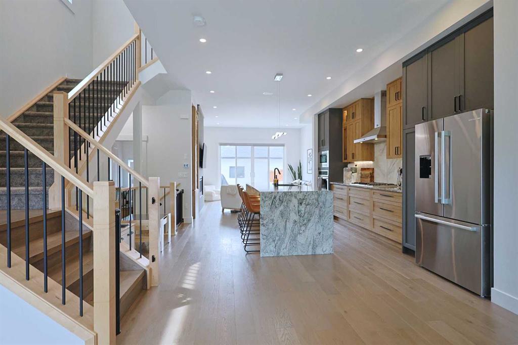 Truly amazing describes this sensational semi-detached home in the popular inner city community of Capitol Hill, located here on this quiet street within walking distance to Confederation Park & the bluff overlooking Confederation golf course. Offering a total of 4 bedrooms & over 2600sqft of air-conditioned living space, this sleek designer home enjoys upgraded engineered hardwood floors, stunning custom kitchen with granite countertops, dreamy master ensuite with heated floors & fenced West backyard complete with large deck & detached 2 car garage. Complemented by soaring 10ft ceilings & expansive windows, you’ll fall in love with the incredible open concept flow of the main floor with its bright & airy dining room with paneled feature wall & West-facing living room with 4-panel sliding garden doors & sleek contemporary fireplace with floor-to-ceiling granite surround. The fully-loaded kitchen is a sight-to-behold & features full-height cabinets & granite counters, impressive granite waterfall island & stainless steel Bosch appliances including gas cooktop plus chimney hoodfan & Frigidaire built-in oven. The graceful & extra-wide staircase leads up to the 2nd floor where you’ll find 9ft ceilings & 3 wonderful bedrooms; the West-facing owners’ retreat has engineered hardwood floors & large walk-in closet, & a barn door opens into the luxurious ensuite with heated floors & free-standing tub, oversized glass shower & quartz-topped double vanities. Finishing off this floor is the family bathroom with 2 sinks & quartz counters, deep linen closet & laundry room with Maytag washer & dryer. The lower level – with 9ft ceilings & roughed-in infloor heating, is beautifully finished with a 4th bedroom with walk-in closet, another full bathroom, office area with built-in desk & terrific rec room with granite-topped wet bar. Additional features include built-in ceiling speakers, low-flow/dual-flush toilets, main floor mudroom with built-in lockers, closet organizers, 3M-tinted windows (Night Vision 35 for upper staircase windows & PR40 for 2nd floor bedrooms), roughed-in central vacuum system & natural gas line for your BBQ on the backyard deck. Conveniently situated in this prime location within walking distance to bus stops & just minutes to the University of Calgary, area schools & Foothills Medical Centre, with easy access to major retail centers, LRT & downtown.