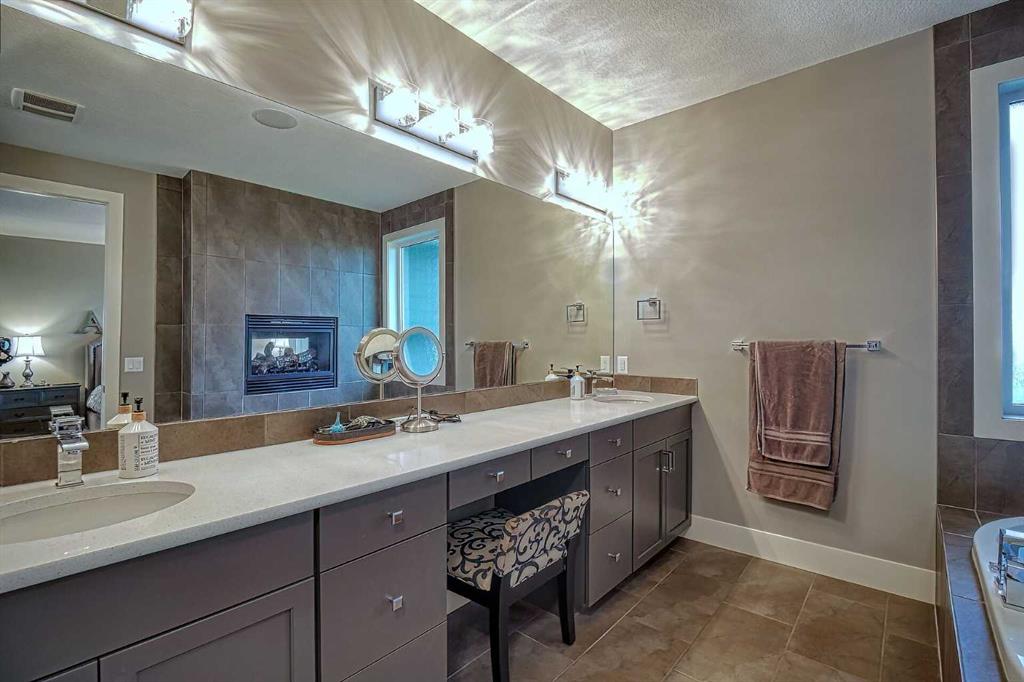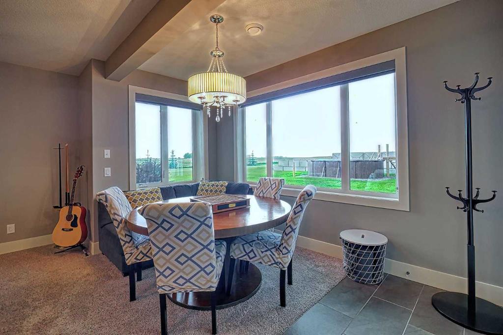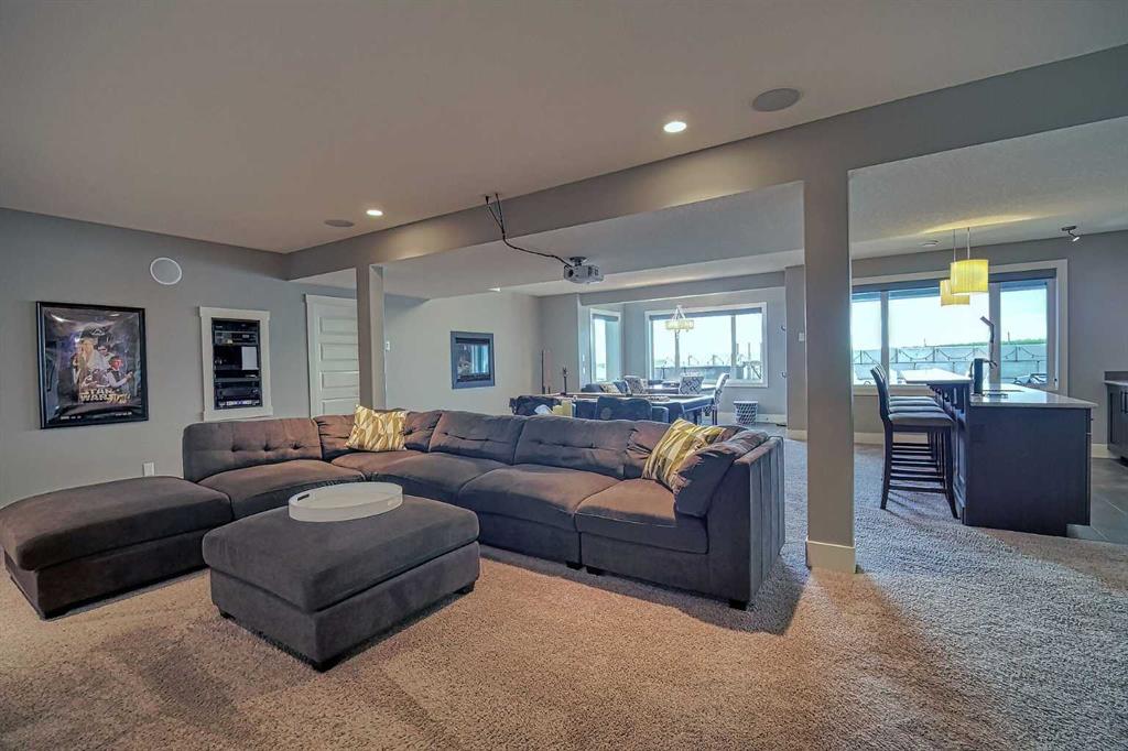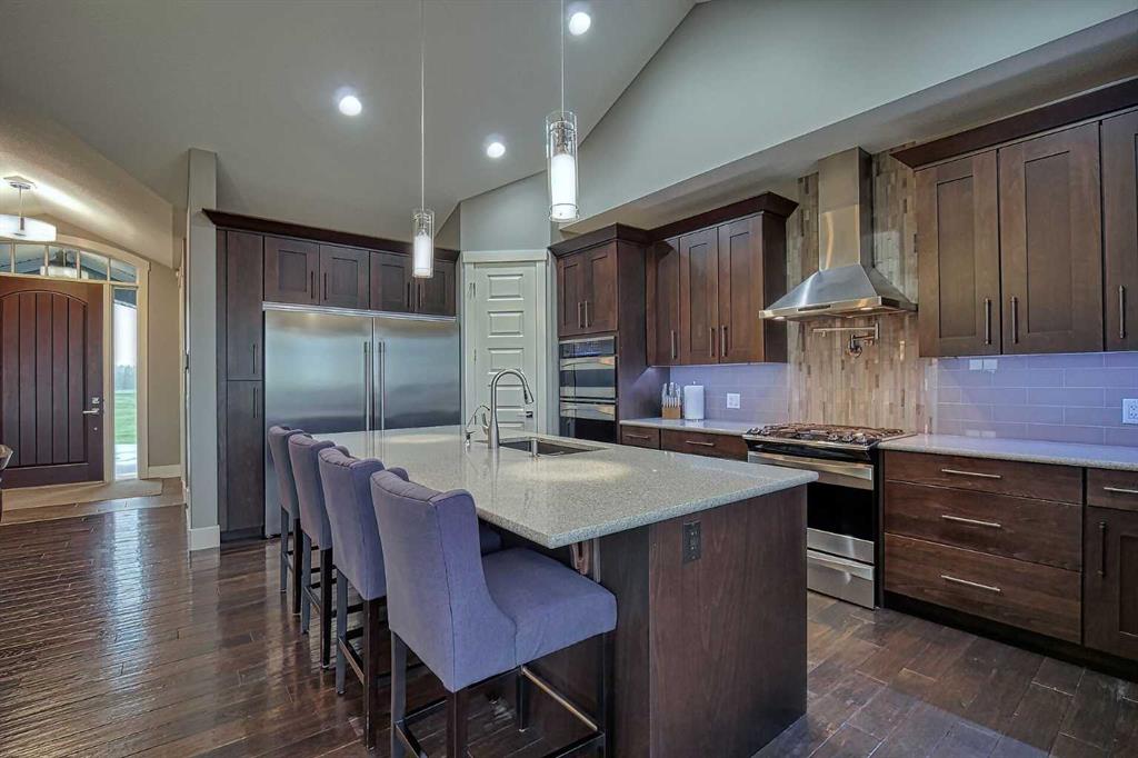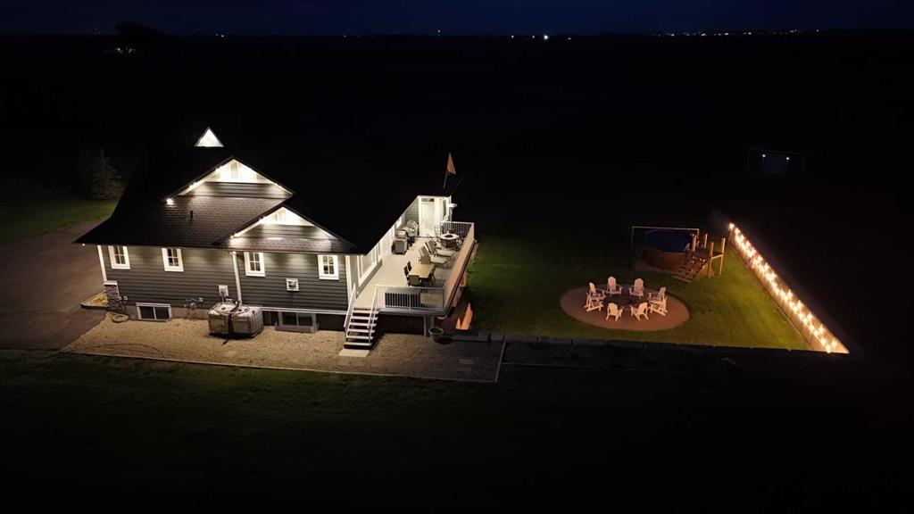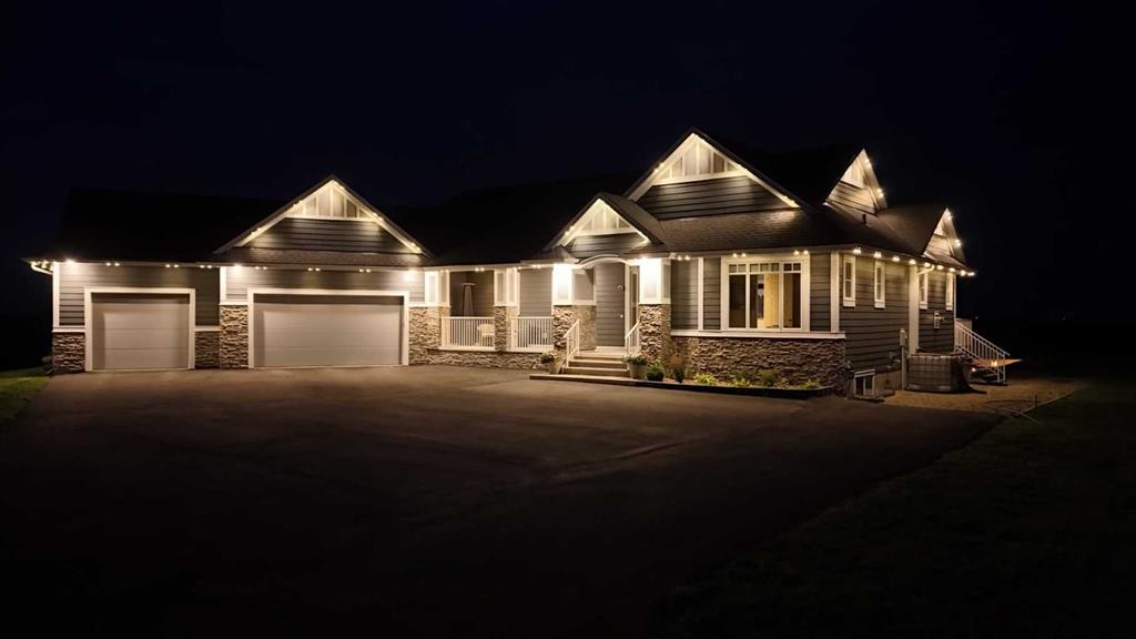 This stunning CUSTOM home was designed with no expense spared. From the moment you enter through the automated gates and follow the paved driveway, the quality is undeniable. Hardy Board siding, a triple garage, Gemstone lighting, and a warm, inviting front porch set the tone. Step into the spacious foyer, complete with its own walk-in closet, and prepare for a WOW moment as the home opens up with light, expansive windows, and breathtaking views. The kitchen, breakfast bar, dining area, and living room share an open-concept design, so no matter where you are, you’re part of the conversation. A floor-to-ceiling brick fireplace with built-ins on both sides anchors the living room beneath soaring 10’ ceilings. The dining area easily accommodates a large table, while the breakfast bar and all countertops gleam with high-quality quartz. The built-in fridge and freezer combo is a generous in size, complemented by two ovens including a built-in microwave, a gourmet gas range with another oven, and a convenient pasta faucet. Hand-scraped hardwood floors add sophistication while maintaining a cozy, farm-inspired feel.This thoughtfully designed kitchen offers expansive quartz counters, abundant cabinetry, and a hidden gem — a walk-through butler’s pantry, providing even more space for your culinary essentials. Double doors open to a spacious deck, perfect for lively gatherings or quiet evenings soaking in the peaceful farm views. In the primary suite, expansive windows frame the rolling landscape, making the view a part of the room itself. A gas fireplace flickers warmly on cooler nights, while a French door leads you directly to the patio for a breath of fresh country air. The luxurious 5-piece ensuite offers a spa-like retreat — a deep soaker tub set beside the fireplace invites indulgent baths, while double sinks, a generous walk-in shower with built-in seating, and a private water closet provide both comfort and function. The grand walk-in closet offers ample space to keep everything perfectly organized. The Main floor features a second bedroom that provides guests or family with their own retreat, complete with a walk-in closet and an elegant 4-piece ensuite. The hall area includes a 2-piece bath, organized laundry room, and mudroom. Downstairs, a media room with a 135” screen and 4K projector is perfect for movie nights. There’s also space for a pool table (negotiable), poker table area and a full wet bar with quartz counters, sink, dishwasher, beer keg with tap, wine storage, and a commercial beverage fridge. This level has two bedrooms with walk-in closets, a 4-piece bath, and a walkout to a covered patio with hot tub, heated above-ground pool, and fire pit. A massive retaining wall ensures privacy, and a shed provides garden storage. There are underground sprinklers. Included are 22 built-in speakers with Control 4 automation, five TVs with mounts, projector and screen & cameras. Come experience Executive Country Living.