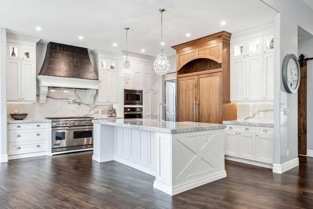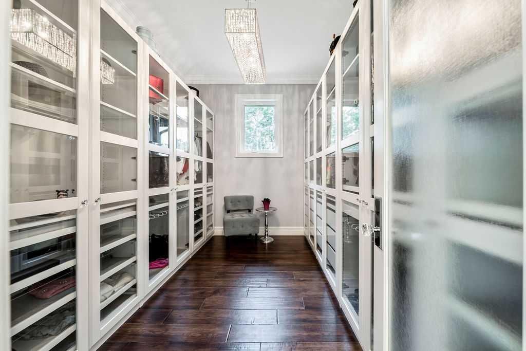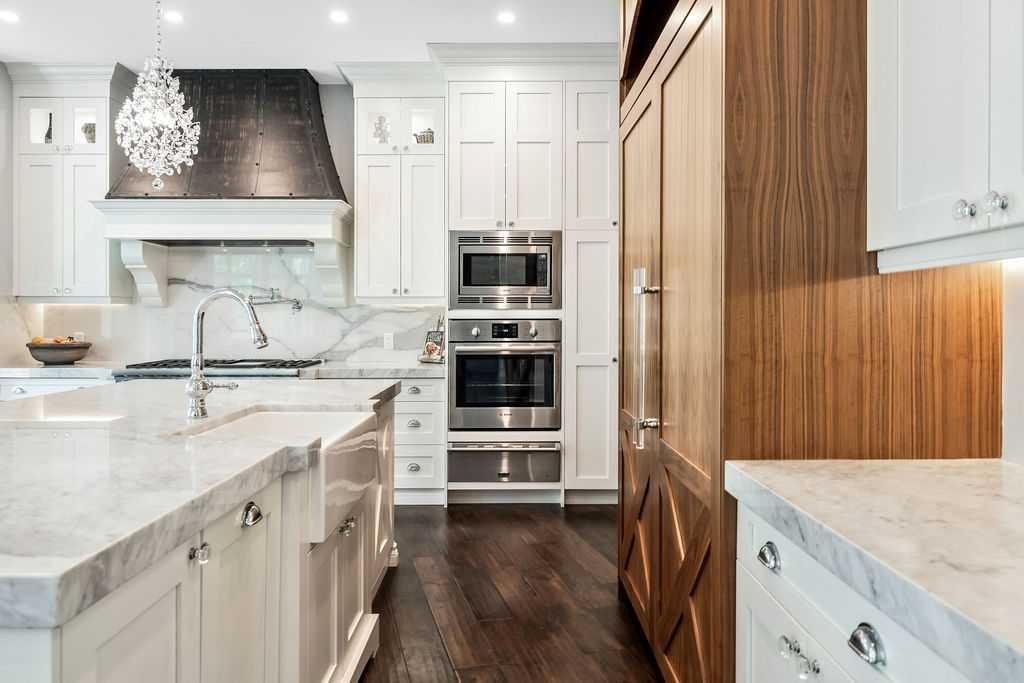 The gourmet kitchen is equipped with everything a chef could desire, including a massive gas stove with grill, built-in wall oven and warming drawer, and both a full-size built-in fridge and freezer encased in clear maple-stained facades and trim. A huge walk-in pantry off the dining area completes this culinary dream.