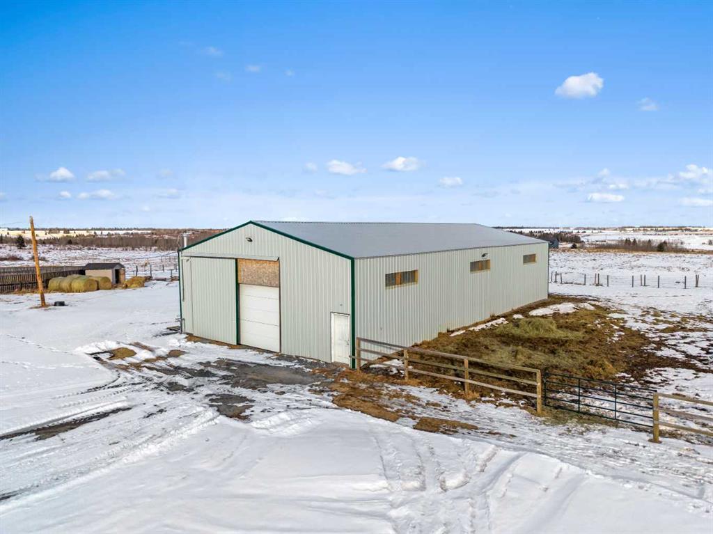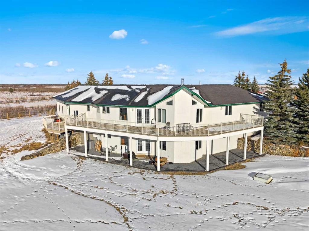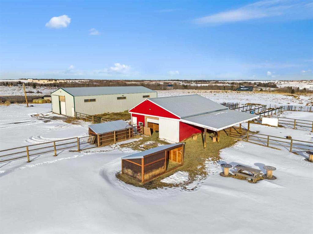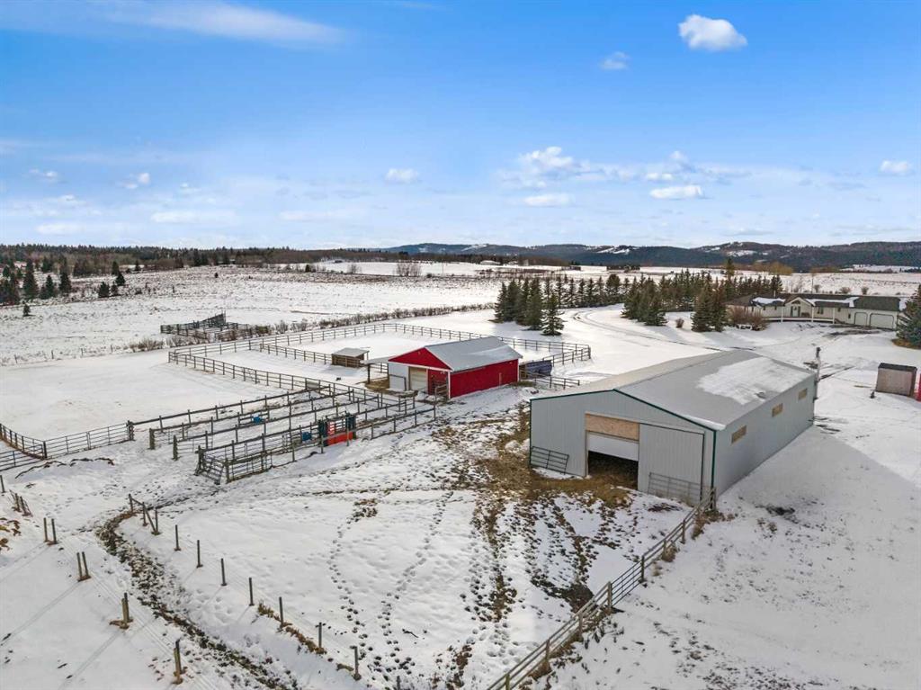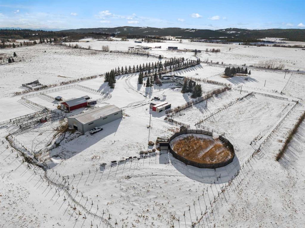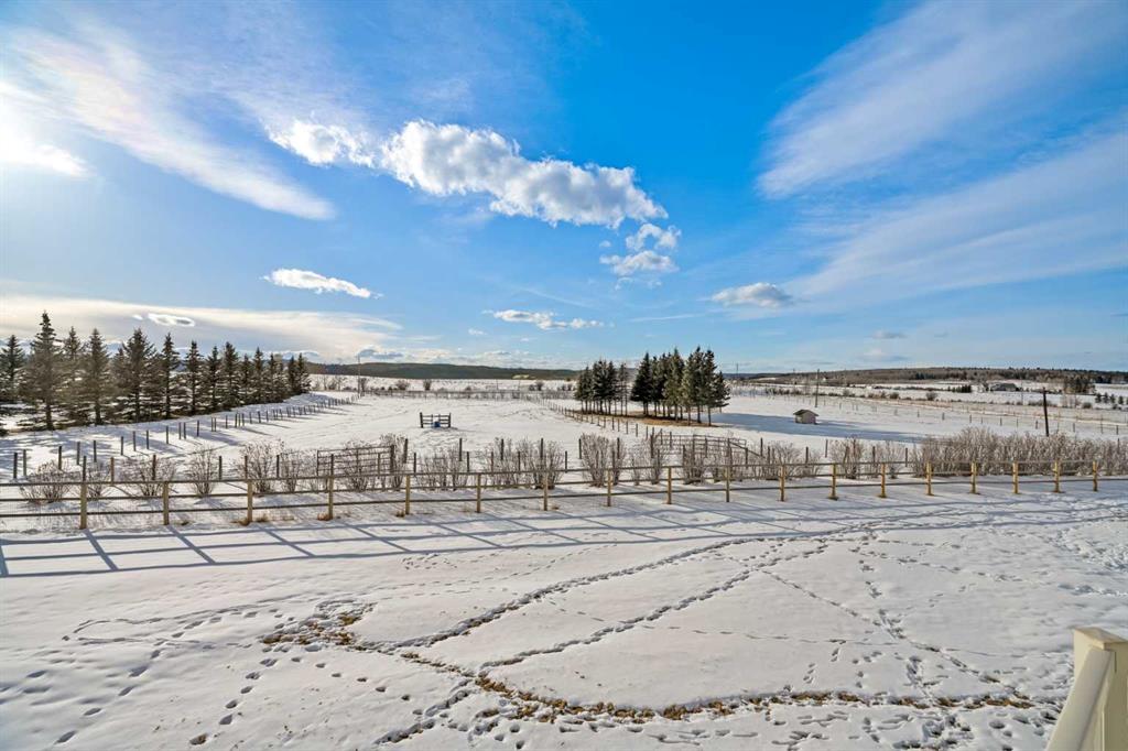 Experience the ultimate acreage lifestyle on 20 breathtaking acres just 15 minutes northwest of Cochrane, where panoramic views of the Wildcat Hills and the peaks of the Canadian Rocky Mountains create an unforgettable backdrop. This sprawling ranch-style bungalow with a fully developed walkout basement offers the rare combination of privacy, space, and refined country living in an exceptionally scenic setting. With over 4,300 square feet of thoughtfully designed living space, the home has been beautifully reimagined with a modern farmhouse aesthetic. Much of the transformation is complete, offering you the exciting opportunity to complete and add your personal touch to bring the vision fully to life. The stunning white farmhouse kitchen anchors the open concept main level, showcasing quartz countertops, built-in appliances, luxury vinyl plank flooring, recessed lighting, and striking faux-beamed ceilings. The main floor offers a dedicated home office, a spacious primary retreat with walk-in closet and private ensuite, and a second bedroom also features a walk-in closet. A five piece main bath, convenient main floor laundry, and a two piece bath ideally situated off the mudroom and triple attached garage enhance everyday functionality. The fully developed walkout basement, completed in 2016, delivers a modern and inviting space perfect for entertaining or extended family living. A large family room centers around a custom wet bar with solid walnut cabinetry, Italian porcelain tile, and a striking double-edge live wood bar top. Two additional generous bedrooms with walk-in closets, a gym or flex room, a three-piece bath, and two expansive storage rooms complete the lower level. In-floor heating throughout the basement, mudroom, and triple garage ensures warmth and comfort year-round. Designed to support your acreage dreams, the property is exceptionally well-equipped with a heated 40' x 80' shop with dedicated workshop space, a 30' x 40' barn with tack, feed room and stalls and a 16' x 40' lean-to. An outdoor riding arena, round pen, paddocks, pastures, stock waters, hydrants, fencing and cross-fencing provide everything needed for equestrian or hobby farm pursuits. A vegetable patch and large fenced dog yard by the house, further enhance the lifestyle possibilities, while two high-producing wells provide abundant and reliable water. Built for longevity and low maintenance, the home features a stucco exterior, vinyl windows, coated decks with metal railings, durable SBS Malarkey rubber shingles installed in 2014, and metal-clad outbuildings designed to stand the test of time. This is more than a property; it is a rare opportunity to embrace wide-open spaces, mountain views, and a lifestyle defined by freedom, functionality and refined country living.