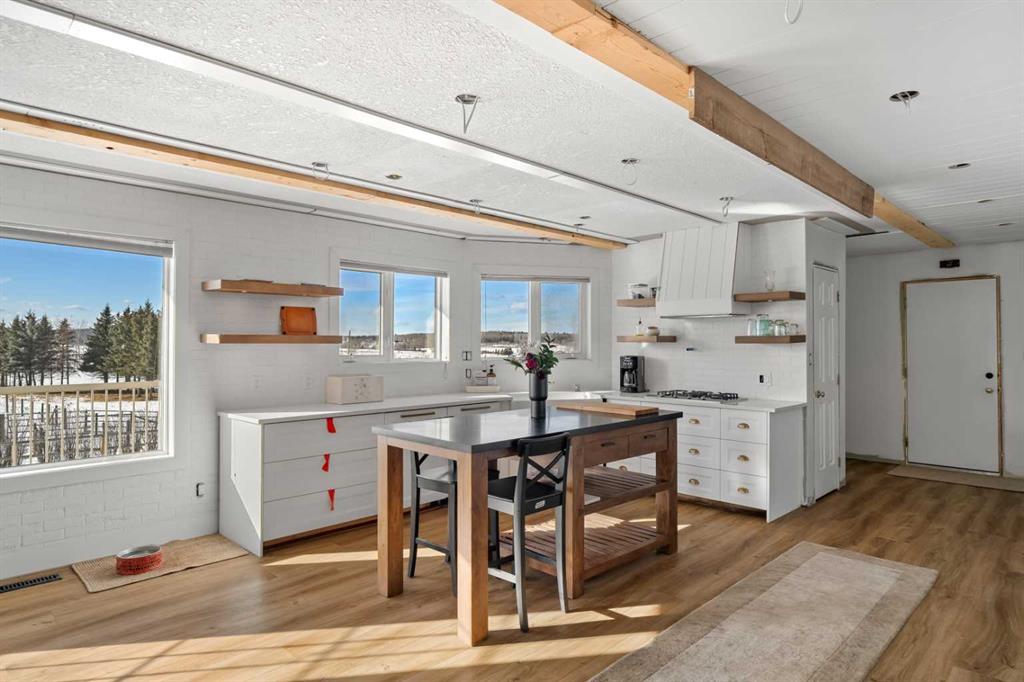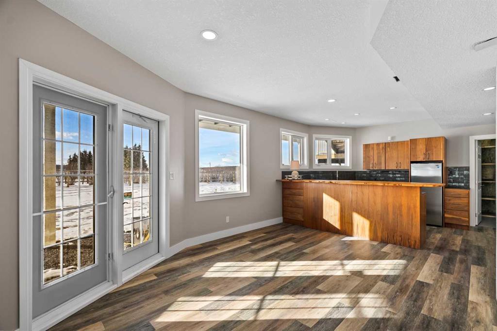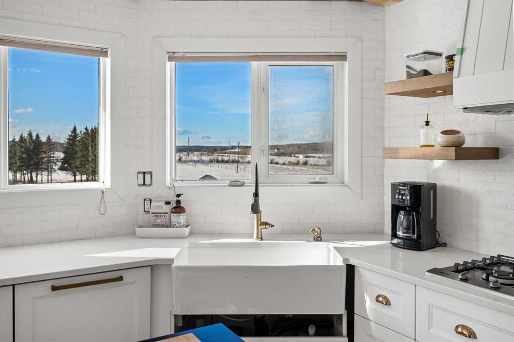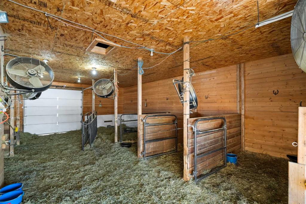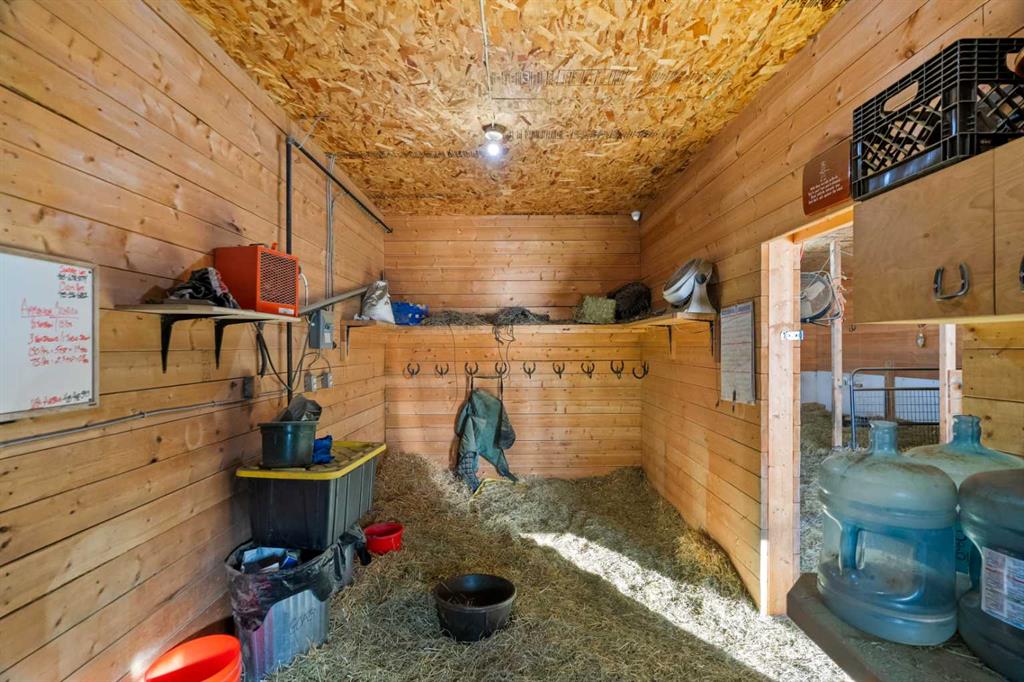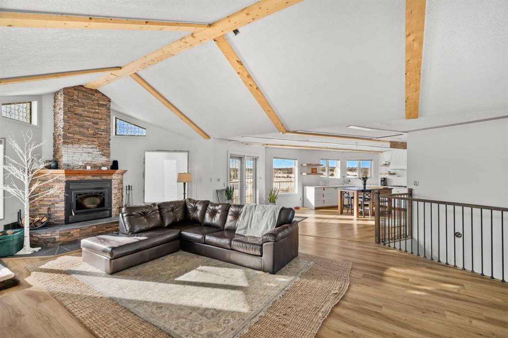 Experience the ultimate acreage lifestyle on 20 breathtaking acres just 15 minutes northwest of Cochrane, where panoramic views of the Wildcat Hills and the peaks of the Canadian Rocky Mountains create an unforgettable backdrop. This sprawling ranch-style bungalow with a fully developed walkout basement offers the rare combination of privacy, space, and refined country living in an exceptionally scenic setting. With over 4,300 square feet of thoughtfully designed living space, the home has been beautifully reimagined with a modern farmhouse aesthetic. Much of the transformation is complete, offering you the exciting opportunity to complete and add your personal touch to bring the vision fully to life. The stunning white farmhouse kitchen anchors the open concept main level, showcasing quartz countertops, built-in appliances, luxury vinyl plank flooring, recessed lighting, and striking faux-beamed ceilings. The main floor offers a dedicated home office, a spacious primary retreat with walk-in closet and private ensuite, and a second bedroom also features a walk-in closet. A five piece main bath, convenient main floor laundry, and a two piece bath ideally situated off the mudroom and triple attached garage enhance everyday functionality. The fully developed walkout basement, completed in 2016, delivers a modern and inviting space perfect for entertaining or extended family living. A large family room centers around a custom wet bar with solid walnut cabinetry, Italian porcelain tile, and a striking double-edge live wood bar top. Two additional generous bedrooms with walk-in closets, a gym or flex room, a three-piece bath, and two expansive storage rooms complete the lower level. In-floor heating throughout the basement, mudroom, and triple garage ensures warmth and comfort year-round. Designed to support your acreage dreams, the property is exceptionally well-equipped with a heated 40' x 80' shop with dedicated workshop space, a 30' x 40' barn with tack, feed room and stalls and a 16' x 40' lean-to. An outdoor riding arena, round pen, paddocks, pastures, stock waters, hydrants, fencing and cross-fencing provide everything needed for equestrian or hobby farm pursuits. A vegetable patch and large fenced dog yard by the house, further enhance the lifestyle possibilities, while two high-producing wells provide abundant and reliable water. Built for longevity and low maintenance, the home features a stucco exterior, vinyl windows, coated decks with metal railings, durable SBS Malarkey rubber shingles installed in 2014, and metal-clad outbuildings designed to stand the test of time. This is more than a property; it is a rare opportunity to embrace wide-open spaces, mountain views, and a lifestyle defined by freedom, functionality and refined country living.
