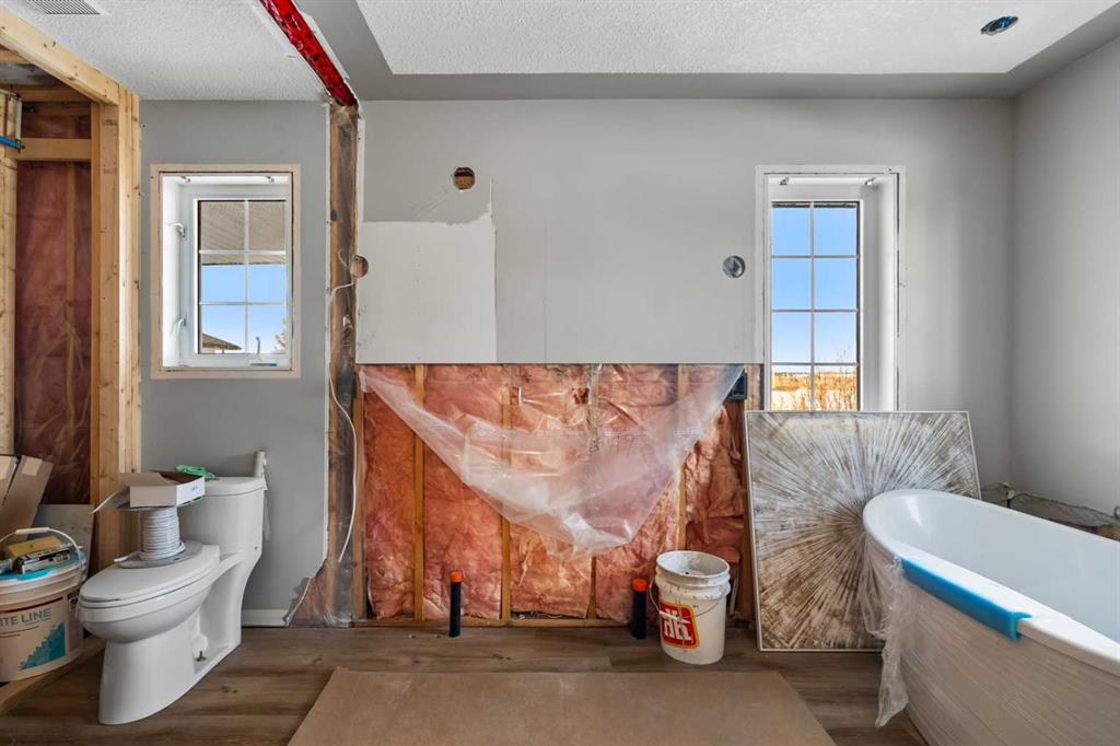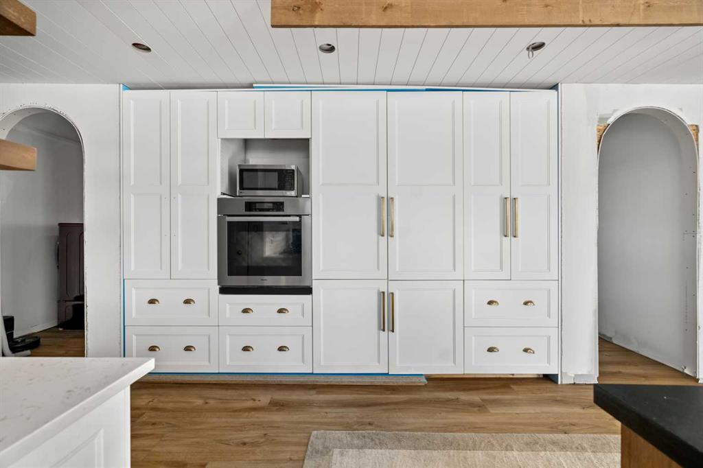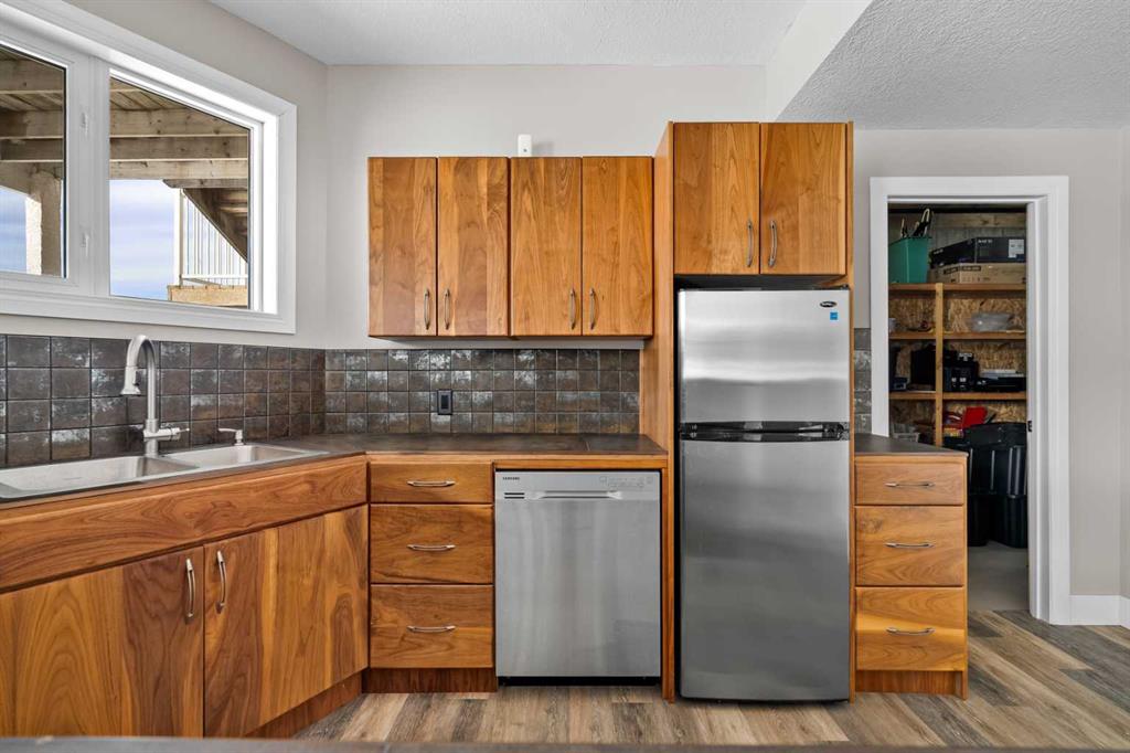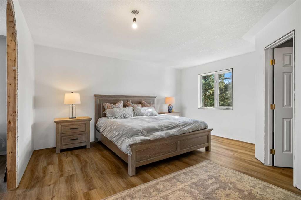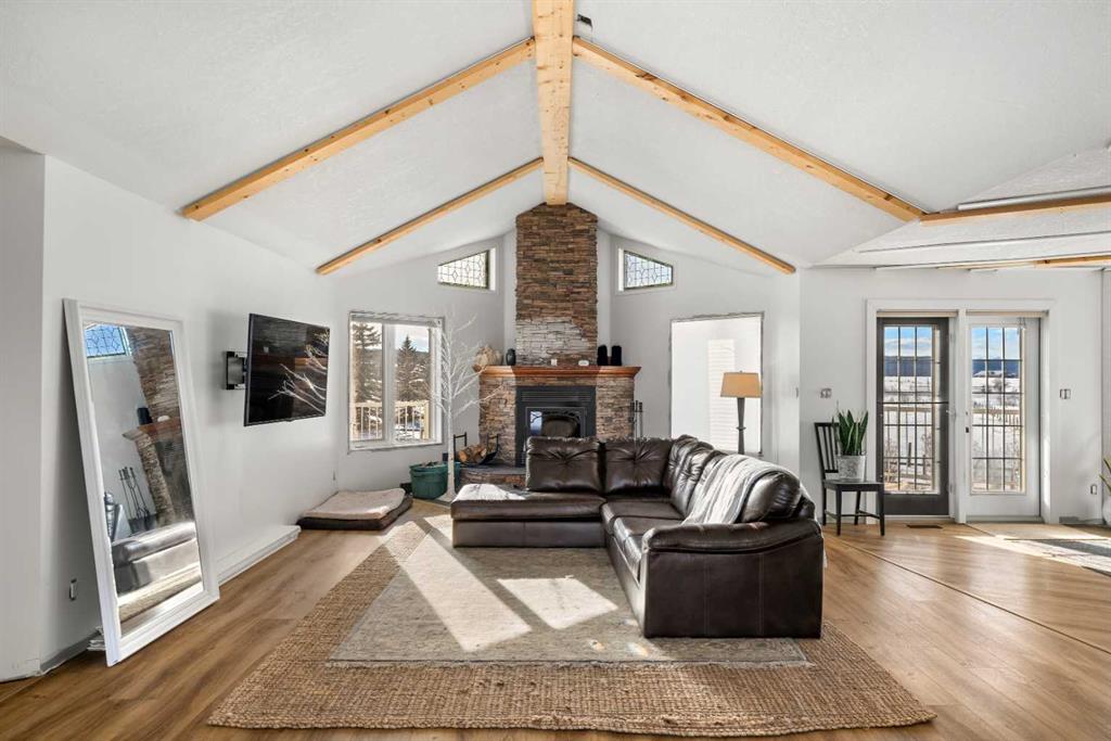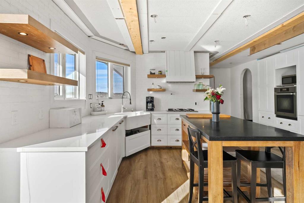 Experience the ultimate acreage lifestyle on 20 breathtaking acres just 15 minutes northwest of Cochrane, where panoramic views of the Wildcat Hills and the peaks of the Canadian Rocky Mountains create an unforgettable backdrop. This sprawling ranch-style bungalow with a fully developed walkout basement offers the rare combination of privacy, space, and refined country living in an exceptionally scenic setting. With over 4,300 square feet of thoughtfully designed living space, the home has been beautifully reimagined with a modern farmhouse aesthetic. Much of the transformation is complete, offering you the exciting opportunity to complete and add your personal touch to bring the vision fully to life. The stunning white farmhouse kitchen anchors the open concept main level, showcasing quartz countertops, built-in appliances, luxury vinyl plank flooring, recessed lighting, and striking faux-beamed ceilings. The main floor offers a dedicated home office, a spacious primary retreat with walk-in closet and private ensuite, and a second bedroom also features a walk-in closet. A five piece main bath, convenient main floor laundry, and a two piece bath ideally situated off the mudroom and triple attached garage enhance everyday functionality. The fully developed walkout basement, completed in 2016, delivers a modern and inviting space perfect for entertaining or extended family living. A large family room centers around a custom wet bar with solid walnut cabinetry, Italian porcelain tile, and a striking double-edge live wood bar top. Two additional generous bedrooms with walk-in closets, a gym or flex room, a three-piece bath, and two expansive storage rooms complete the lower level. In-floor heating throughout the basement, mudroom, and triple garage ensures warmth and comfort year-round. Designed to support your acreage dreams, the property is exceptionally well-equipped with a heated 40' x 80' shop with dedicated workshop space, a 30' x 40' barn with tack, feed room and stalls and a 16' x 40' lean-to. An outdoor riding arena, round pen, paddocks, pastures, stock waters, hydrants, fencing and cross-fencing provide everything needed for equestrian or hobby farm pursuits. A vegetable patch and large fenced dog yard by the house, further enhance the lifestyle possibilities, while two high-producing wells provide abundant and reliable water. Built for longevity and low maintenance, the home features a stucco exterior, vinyl windows, coated decks with metal railings, durable SBS Malarkey rubber shingles installed in 2014, and metal-clad outbuildings designed to stand the test of time. This is more than a property; it is a rare opportunity to embrace wide-open spaces, mountain views, and a lifestyle defined by freedom, functionality and refined country living.
