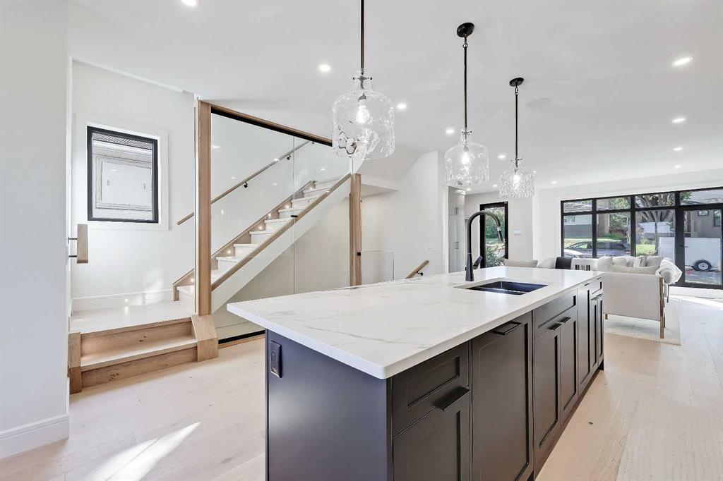 The main floor opens into a welcoming foyer w/ built-in closet & bench, offering views into the spacious living room w/ a gas fireplace w/ full-height tile, as well as a stunning wood-panelled feature wall. Beautiful oak hardwood flooring leads you into the open-concept kitchen – fully equipped w/ an oversized island w/ quartz countertop, timeless shaker-style cabinetry w/ numerous lower drawers, & a contemporary flat-panel built-in cabinetry pantry. The designer kitchen is nicely finished w/ a full stainless steel appliance package, complete w/ a panelled French door refrigerator, a built-in wall oven & microwave, a gas cooktop w/ pot filler, & a built-in dishwasher. The custom built-ins continue into the dedicated dining room, w/ open shelving & lower cabinets w/ quartz counter for everyday convenience. Step out onto the back deck through the rear mudroom, complete w/ a built-in bench, coat cabinet, & tile flooring. Before you head upstairs, the stylish powder room is tucked away w/ a beautiful skirted vanity & vessel sink.