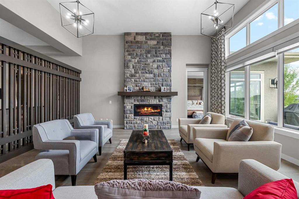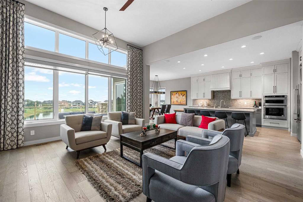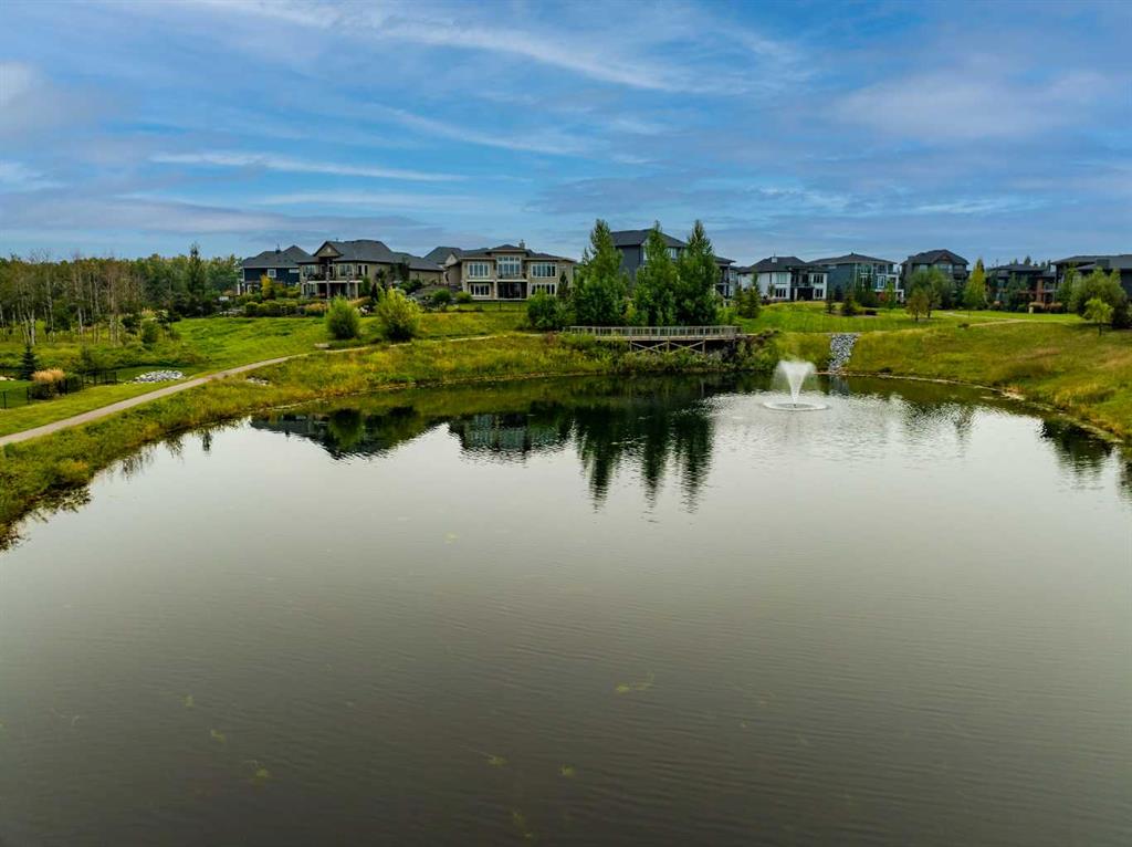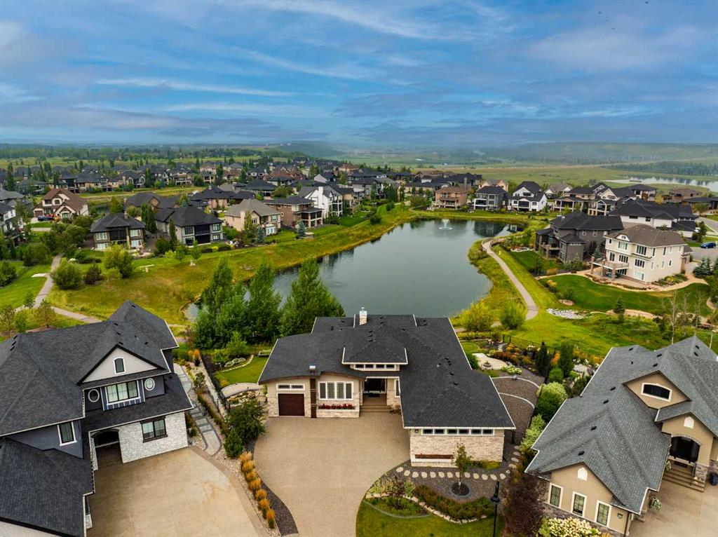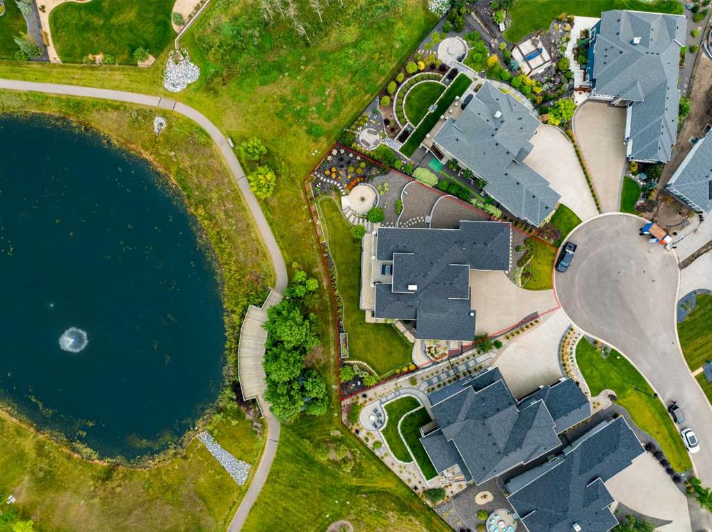 Set within a serene landscape of water and winding pathways, this luxury walkout bungalow offers architectural sophistication and natural tranquility. Designed on the sought-after Carrara 2 floor plan, the home captures a sense of openness and grandeur from the moment you arrive, with its expansive triple car garage and striking exterior. Inside, soaring 11-foot and 14-foot ceilings create an immediate feeling of volume and light, elevating every space with an airy, refined atmosphere. The main living area showcases comfort and grandeur with oversized windows framing uninterrupted views of the pond and pathway system beyond. Natural light floods the interior throughout the day, reflecting off carefully selected finishes and enhancing the home’s warm, modern palette. The heart of the home is an expansive and beautifully appointed kitchen. A massive island, custom cabinetry, upgraded appliances, storage galore with a functional yet elegant butlers pantry, a separate walk in pantry and short and convenient close entrance through the oversized mudroom to the garage entrance perfect for bringing in grocery's. The open concept connects the dining and great room, forming an ideal setting for both everyday living and upscale entertaining. Clean architectural lines, generous proportions, and an effortless flow between spaces define the layout, with elevated ceiling heights adding drama and distinction without sacrificing intimacy. The dining area flows onto the expansive upper terrace, where a glass-railing system ensures your view of the pond remains uninterrupted while you enjoy an evening cocktail. Or seat your guests in this well appointed living room with a floor to ceiling stone fireplace both great options. Work from home in the private office away from the hustle and bustle of family activities. The primary suite is a sanctuary of its own, generous in size and enhanced by the home’s signature high ceilings, offering a quiet escape with serene views and a spa-inspired ensuite and a massive closet that won’t disappoint. The walkout lower level extends the living space in a way that feels fully integrated with the outdoors. Large glass doors open directly onto a private patio, where the gentle presence of the pond and landscaped pathways creates a peaceful retreat just steps from your living room. This level is perfectly suited for hosting guests, relaxing with family, or creating a personalized entertainment space, all while maintaining the same high-end feel as the main floor. Private bedrooms, a wet bar, a large family room, games area, yoga/ exercise room and finished storage room complete the level. Throughout the home, the combination of architectural height, thoughtful layout, and premium craftsmanship results in a residence that feels both expansive and welcoming. The triple car garage adds ample space for vehicles, storage, and lifestyle needs. This home embodies a rare balance of luxury, comfort, and natural beauty.