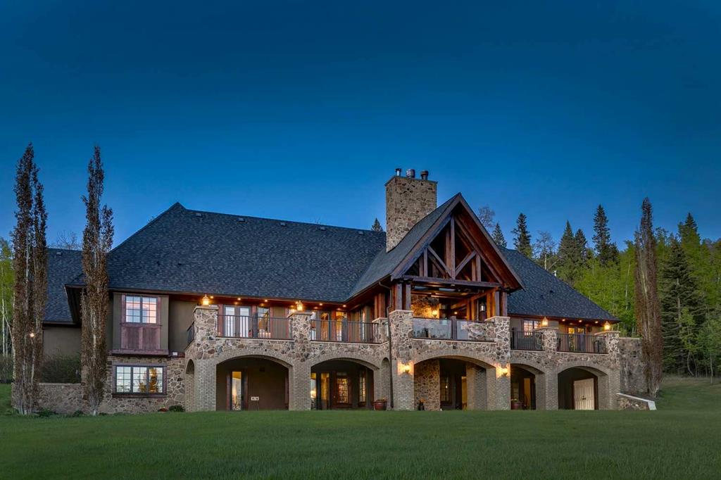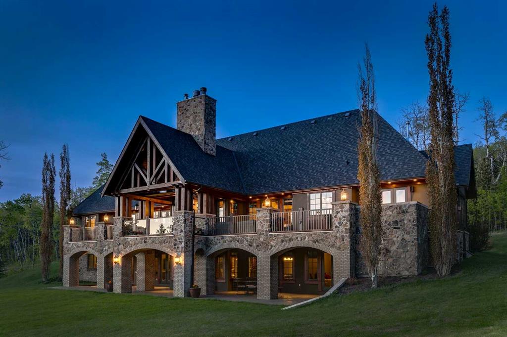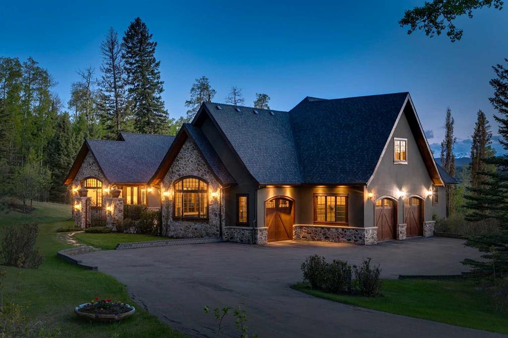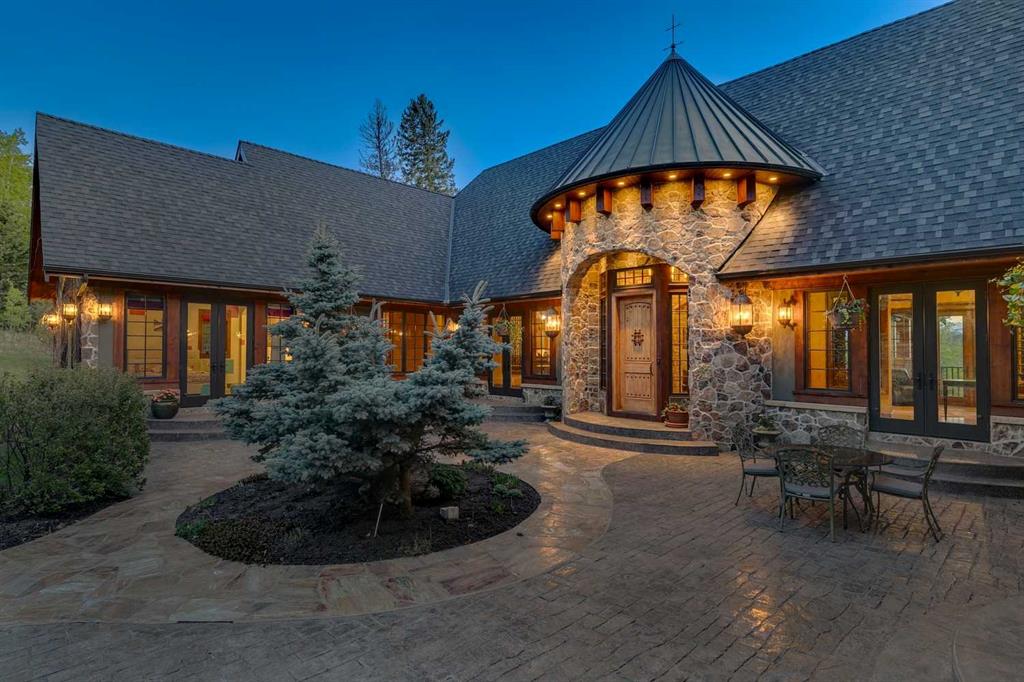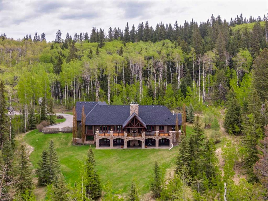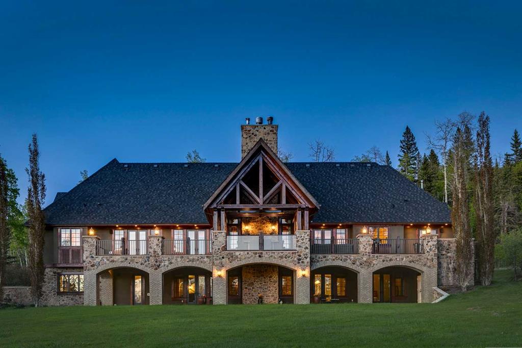 25 minutes from southwest Calgary city limits, this timber and stone masterpiece is set against the backdrop of the majestic Rockies, embraced by rolling ranch lands that offer endless natural beauty. Nestled between Brown-Lowery Provincial Park and Kananaskis Forest Reserve the home promises a lifestyle rooted in nature and refined living . The nearby charming towns of Millarville, Black Diamond and Bragg Creek host festivals and markets year round along with access to esteemed schools, shopping, entertainment and medical facilities. This 2011 SAM Award–Best New Custom Home-winning residence captivates with its stone fireplaces, exposed timber beams, tall French doors under vaulted ceilings. By design, mornings begin in a bright courtyard featuring a serene fountain, while evenings are reserved for unwinding on a west-facing deck that showcases sunsets and mountain vistas “as far as the eye can see.” With amenities like a built-in gas BBQ, an outdoor stone fireplace, and overhead heaters beneath the shelter of a timber truss roof, every season is met with inviting warmth and style. The home’s seamless flow unites a one and half story main floor, a walkout lower level, and an upper loft that can be converted to feature a fourth bedroom, ensuite bath and private den—totaling 6,561 square feet of thoughtfully planned living space. The chef’s kitchen is a dream come true, featuring custom-built alder cabinets, an Aga vented gas range, an integrated fridge and freezer, and a plumbed coffee maker. This culinary space adjoins rooms that facilitate both formal dining and casual family gatherings, ensuring that every meal becomes a shared experience. True to its natural spirit, the home is built almost entirely of organic materials. A copper-seamed Coppola roof crowns the exterior alongside natural stone and brick facades, while reclaimed hardwoods and honed stone floors lend an artisanal touch throughout. Metal-clad fir windows and oversized French doors open onto wood-planked decks that embrace the walkout patio and extend to the hot tub area—perfect for relaxing or entertaining in style. A Scandinavian-inspired spa, a three-piece bath, and a dedicated gym further round out a suite of wellness-oriented features. Inside, vaulted ceilings accented by fir timber beam trusses create a grand yet inviting atmosphere. Stone and granite countertops provide a luxurious touch in every room. Additional highlights include a home theater, wine cellar, billiards room, and a striking Tulikivi fireplace that anchors memorable family moments. An ensuite bedroom on the lower level ensures comfort and privacy for guests or extended family. Modern living integrated with timeless design. State-of-the-art equipment all working together to keep the air, water, and environment healthy, clean, and comfortable year-round. This move-in ready estate awaits your private viewing.