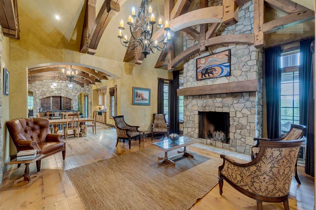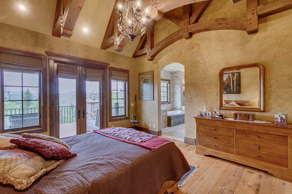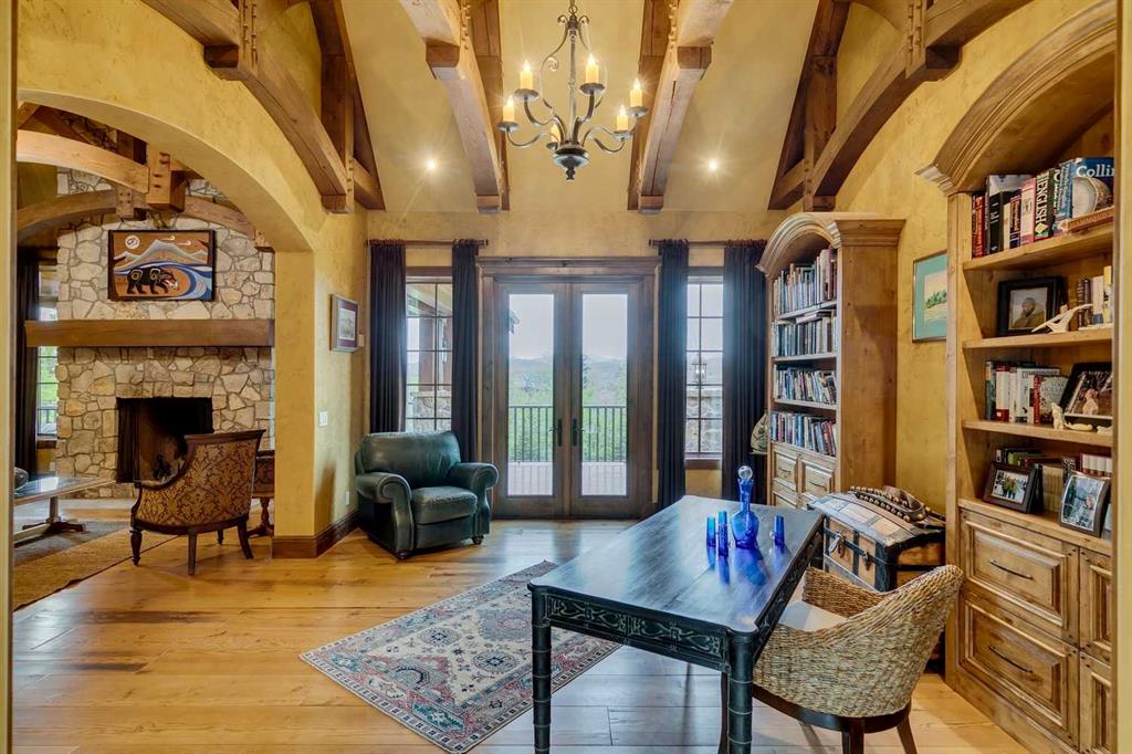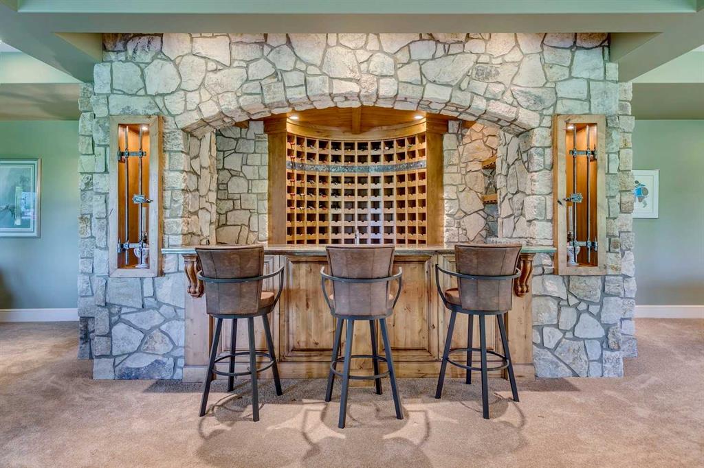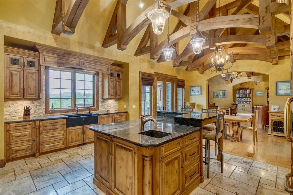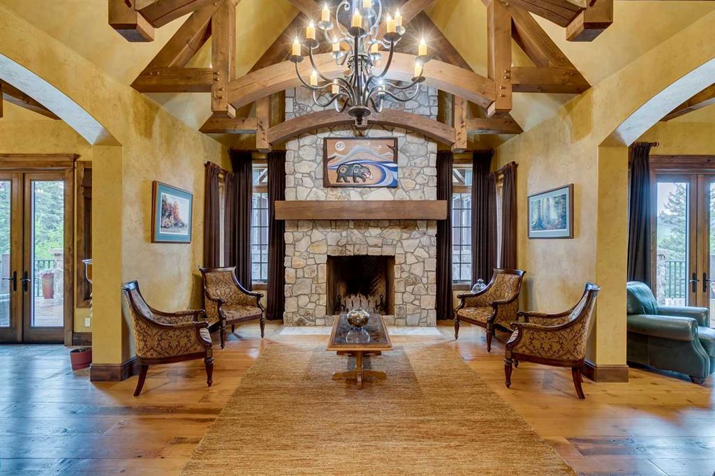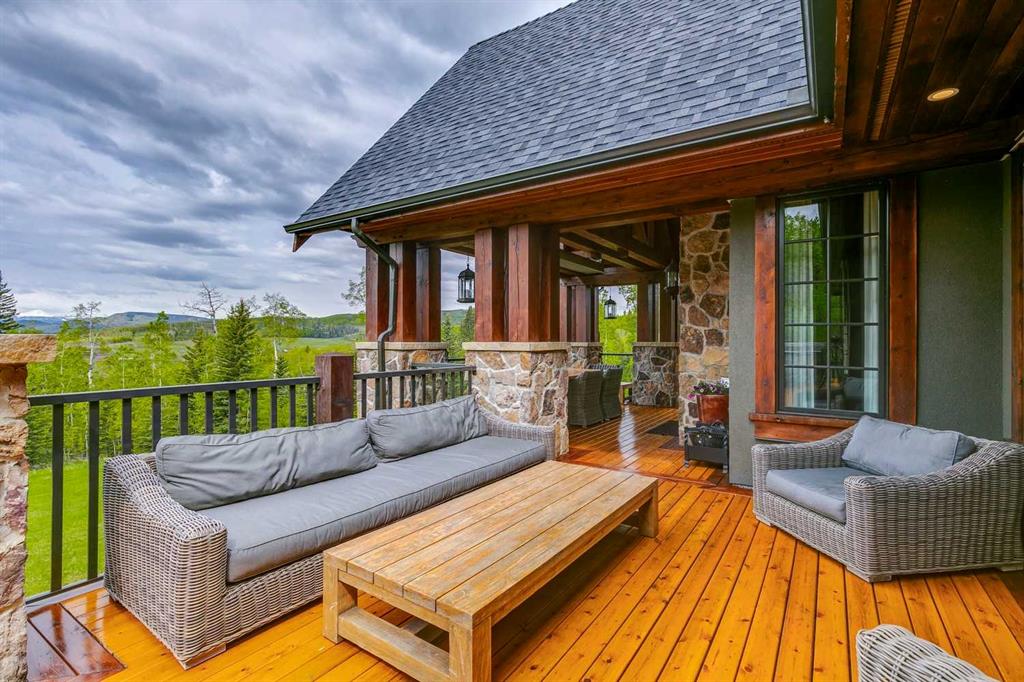 25 minutes from southwest Calgary city limits, this timber and stone masterpiece is set against the backdrop of the majestic Rockies, embraced by rolling ranch lands that offer endless natural beauty. Nestled between Brown-Lowery Provincial Park and Kananaskis Forest Reserve the home promises a lifestyle rooted in nature and refined living . The nearby charming towns of Millarville, Black Diamond and Bragg Creek host festivals and markets year round along with access to esteemed schools, shopping, entertainment and medical facilities. This 2011 SAM Award–Best New Custom Home-winning residence captivates with its stone fireplaces, exposed timber beams, tall French doors under vaulted ceilings. By design, mornings begin in a bright courtyard featuring a serene fountain, while evenings are reserved for unwinding on a west-facing deck that showcases sunsets and mountain vistas “as far as the eye can see.” With amenities like a built-in gas BBQ, an outdoor stone fireplace, and overhead heaters beneath the shelter of a timber truss roof, every season is met with inviting warmth and style. The home’s seamless flow unites a one and half story main floor, a walkout lower level, and an upper loft that can be converted to feature a fourth bedroom, ensuite bath and private den—totaling 6,561 square feet of thoughtfully planned living space. The chef’s kitchen is a dream come true, featuring custom-built alder cabinets, an Aga vented gas range, an integrated fridge and freezer, and a plumbed coffee maker. This culinary space adjoins rooms that facilitate both formal dining and casual family gatherings, ensuring that every meal becomes a shared experience. True to its natural spirit, the home is built almost entirely of organic materials. A copper-seamed Coppola roof crowns the exterior alongside natural stone and brick facades, while reclaimed hardwoods and honed stone floors lend an artisanal touch throughout. Metal-clad fir windows and oversized French doors open onto wood-planked decks that embrace the walkout patio and extend to the hot tub area—perfect for relaxing or entertaining in style. A Scandinavian-inspired spa, a three-piece bath, and a dedicated gym further round out a suite of wellness-oriented features. Inside, vaulted ceilings accented by fir timber beam trusses create a grand yet inviting atmosphere. Stone and granite countertops provide a luxurious touch in every room. Additional highlights include a home theater, wine cellar, billiards room, and a striking Tulikivi fireplace that anchors memorable family moments. An ensuite bedroom on the lower level ensures comfort and privacy for guests or extended family. Modern living integrated with timeless design. State-of-the-art equipment all working together to keep the air, water, and environment healthy, clean, and comfortable year-round. This move-in ready estate awaits your private viewing.