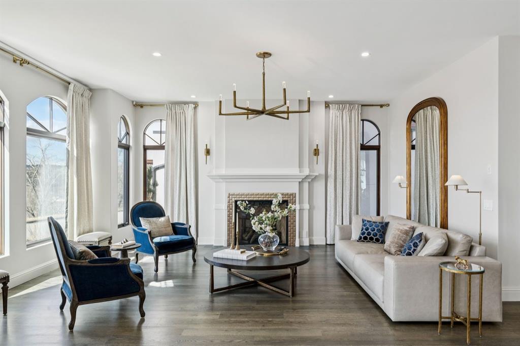 Perched along the coveted ridge in the prestigious community of St. Andrews Heights, this exceptional estate home captures truly breathtaking panoramic views of the valley and downtown skyline, an ever changing backdrop that elevates daily living into something extraordinary. Wrapped in timeless stone tile, the home’s castle-inspired exterior makes a striking first impression, hinting at the grandeur that awaits within. Step inside to graceful arched windows and refined lighting that together create an atmosphere of understated luxury. The open concept layout is both elegant and inviting, anchored by white oak hardwood flooring throughout and thoughtfully designed spaces for modern family living. The living room is a statement in sophistication, featuring a gas fireplace that exudes warmth and style. The adjoining dining area flows seamlessly into a truly remarkable kitchen that's designed to inspire. Crisp white cabinets with glass-front accents frames the space, while marble counters add a sense of refinement. A butlers pantry adds further convenience and a striking blue centre island offers generous seating and storage, complemented by charming beamed ceiling above. A full suite of high end Miele appliances, including an induction cooktop, built-in wall and steam ovens, microwave oven, panelled dishwasher, and separate panelled fridge and freezer ensures both beauty and performance. Sliding glass doors open to a slate patio and lush green space with curated planters for your own private oasis. A distinguished home office, accessed through french doors, features coffered ceilings and stunning wall paneling, with additional access to the rear patio. The main level is completed by a spacious mudroom with storage and offers access to the triple attached garage. A dramatic curved staircase leads to the upper level where a magnificent vaulted bonus room showcases a second gas fireplace, and a Juliet balcony, while a private upper deck embraces sweeping downtown, ridge and valley views. The primary suite is a true sanctuary presenting vaulted ceilings, a Juliet balcony, and exquisite custom dressing room. The lavish 5pc ensuite is designed for indulgence, complete with in-floor heating, dual sinks, vanity counter, a glass enclosed shower, and two separate water closets. Two additional generously sized bedrooms, a full bath, and a thoughtfully designed laundry room with built-in storage, concealed drying racks and sink complete the upper level. The fully developed lower continues the home’s refined aesthetic, offering expansive recreation and games areas filled with natural light from oversized windows. A glass enclosed home gym, fourth bedroom, and a 3pc bath provide flexibility for growing families or guests, while a large storage room with secondary laundry hookup ensures practicality. With its rare combination of timeless design, elevated finishes, and unparalleled views, this extraordinary home offers a lifestyle of sophistication, comfort, and enduring appeal.