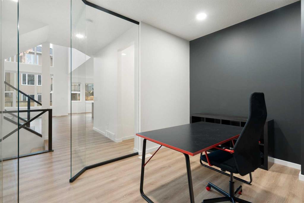 From the moment you step inside, you’re greeted by a bright, open-concept floor plan highlighted by soaring ceilings, expansive windows, and sleek contemporary finishes. The main level includes a stylish glass-enclosed home office—perfect for remote work or homework—and a spacious great room anchored by a dramatic two-storey black marble feature wall. Luxury vinyl plank flooring adds both beauty and durability throughout.