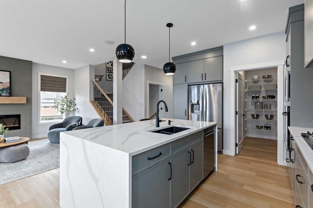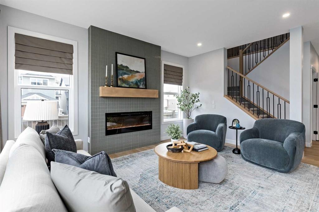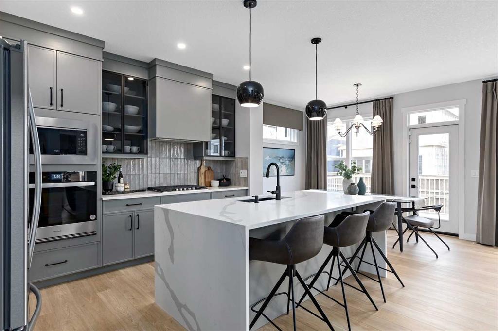 The main floor showcases a bright open-concept layout finished with luxury vinyl plank flooring throughout the main level, stairwell, and basement. The kitchen is designed for both style and function, featuring 1-¼” quartz countertops with waterfall island, built-in appliances, gas cooktop, wood range hood, and upgraded glass cabinetry extended to the ceiling. A separate spice kitchen with gas range and upgraded chimney hood fan provides added convenience for cooking and entertaining. The living room is centered around an elegant electric fireplace with tile surround and mantel, creating a warm focal point. A main floor bedroom with full bathroom and a versatile flex room offer excellent options for guests, a home office, or multi-generational living.