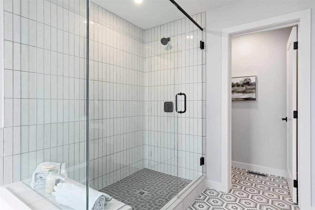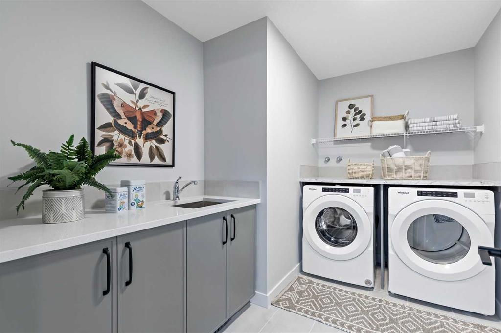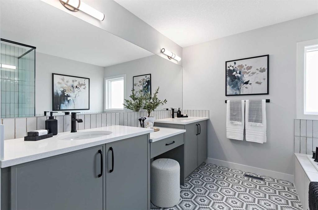 Upstairs, the home offers 5 bedrooms above grade, including dual primary suites designed for comfort and privacy. The main primary bedroom features a spacious walk-in closet and a beautifully upgraded ensuite with double vanity, soaking tub, and extended glass shower with bench. A central bonus room with upgraded spindle railing provides additional living space perfect for relaxing or entertaining. Tile flooring enhances the upper bathrooms and laundry room, while plush carpet provides comfort throughout the bedrooms. The upper laundry room includes built-in cabinetry, countertop workspace, and sink for everyday convenience.
