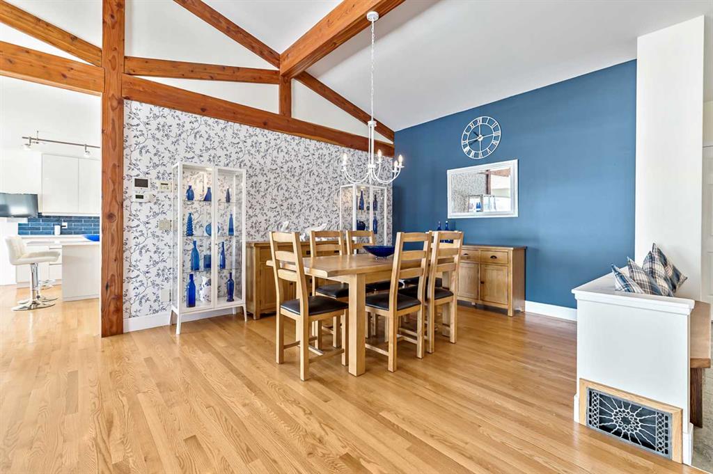 Drive through the log gate and discover over 6,000 square feet of beautifully developed living space in a renovated WALKOUT bungalow designed for both grand entertaining and comfortable family living. VAULTED TIMBER ceilings, banks of windows, and hardwood floors enhance the wide-open floor plan, while a dramatic stone fireplace anchors the great room. The formal dining area flows seamlessly from the living space, creating an inviting atmosphere for memorable gatherings.