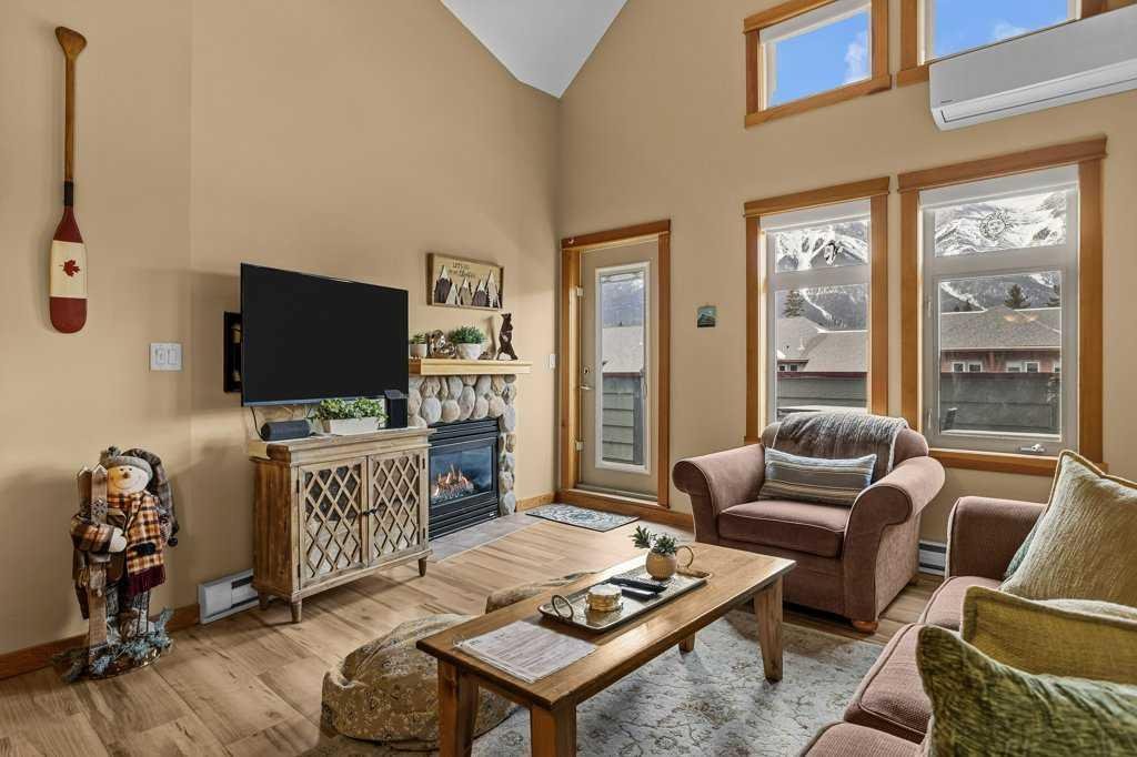 The A+ Short Term Rental you've been waiting for! Massive views, preferred light and orientation, top floor, summer ready, this 2 bed, 2 bath two-storey Lodges penthouse condo is zoned TOURIST HOME—perfect for Airbnb or personal use. Enjoy unmatched iconic mountain views, a smart layout, and quality finishes throughout. Updates include new flooring, air conditioning, and designer blinds. Stylishly decorated, this property features soaring ceilings, natural light, and a spacious private balcony to complete the package. Fully furnished and ideally located, this is a rare opportunity to own a top-floor mountain retreat in one of Canmore’s best run condos. Plus, amenities here include 3 hot tubs and a year-round heated outdoor pool. A must see! NOTE: List price includes GST; speak to your accountant about deferral options. List Price $999,000+GST
