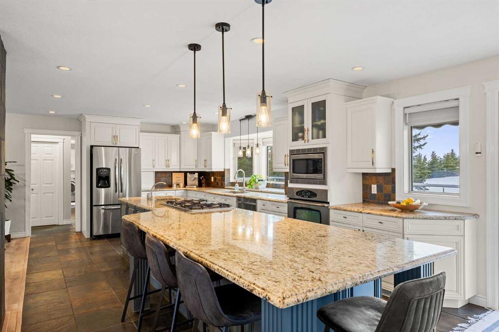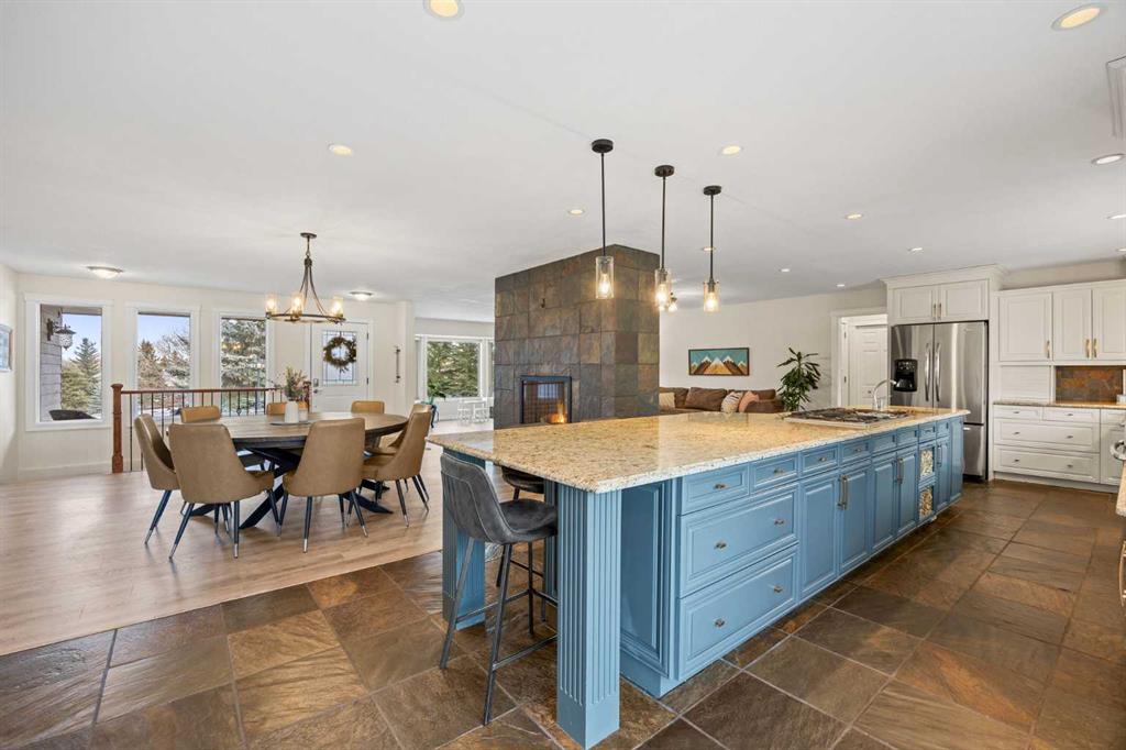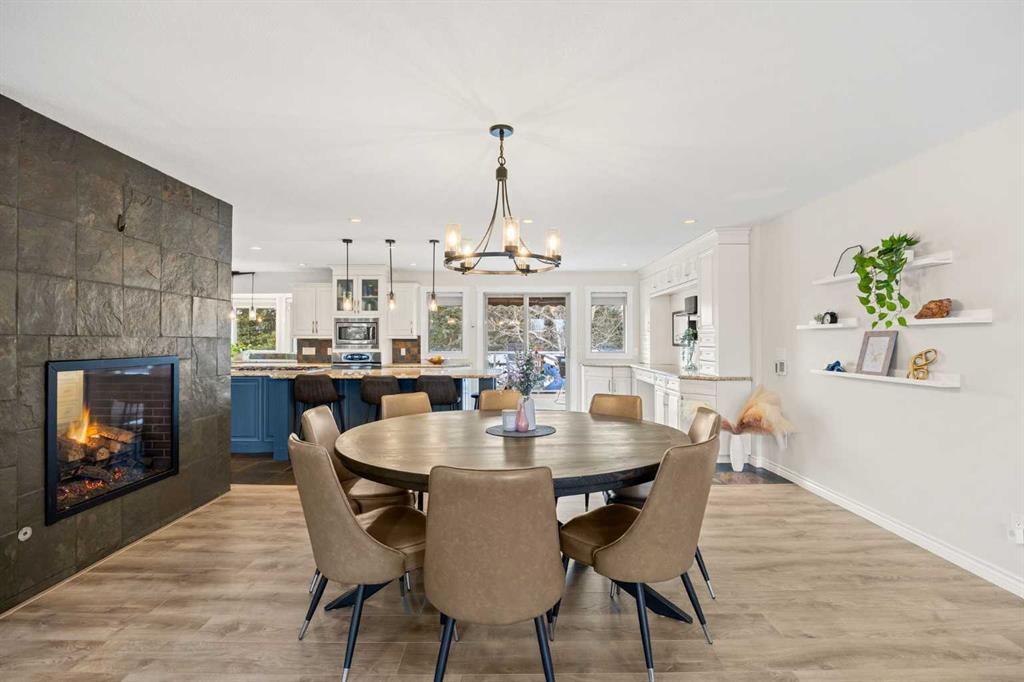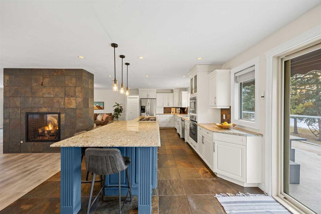 Inside, the home is bright, open, and thoughtfully updated, featuring new flooring throughout (2024), including heated slate tile, and a striking double-sided fireplace anchoring the main living and dining spaces. The expansive kitchen is designed for entertaining, offering custom cabinetry, granite countertops, heated slate floors, and a massive centre island that truly serves as the heart of the home.