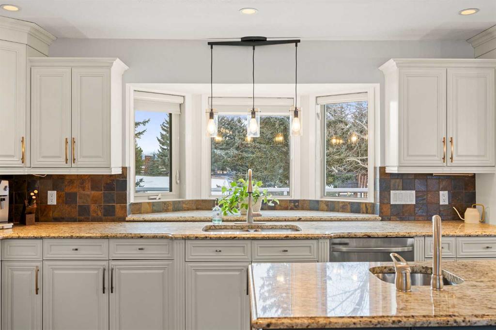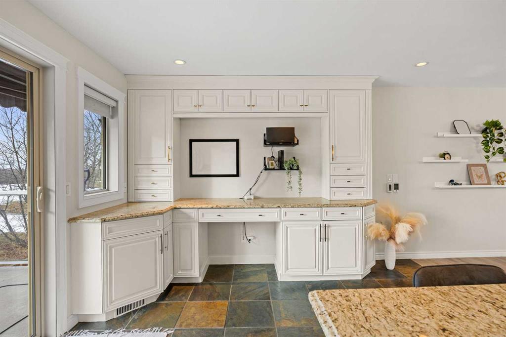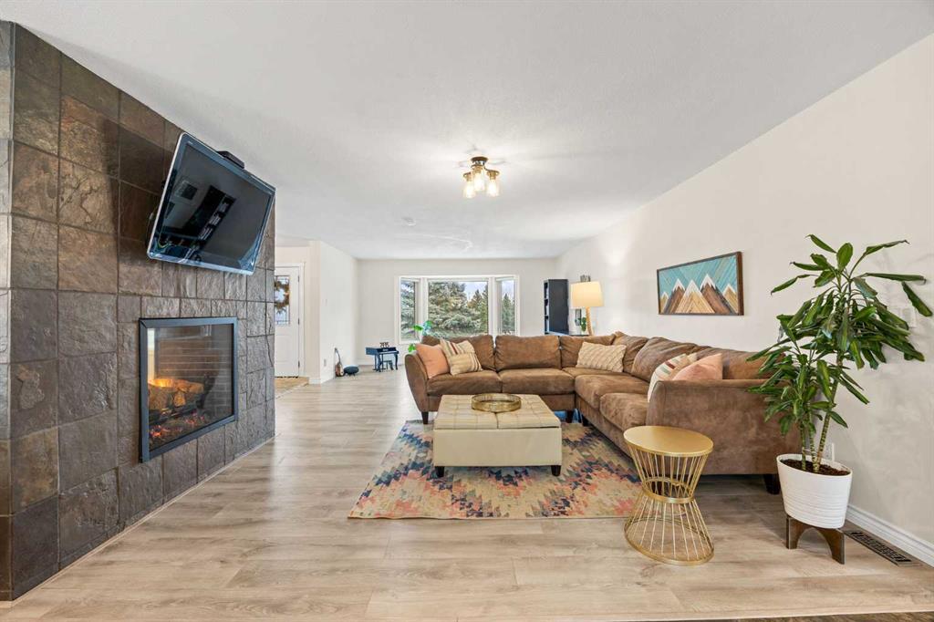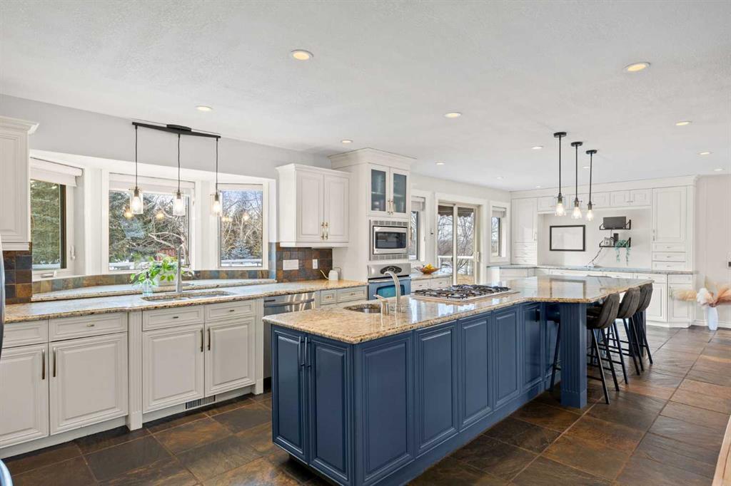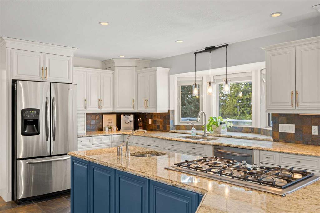 Inside, the home is bright, open, and thoughtfully updated, featuring new flooring throughout (2024), including heated slate tile, and a striking double-sided fireplace anchoring the main living and dining spaces. The expansive kitchen is designed for entertaining, offering custom cabinetry, granite countertops, heated slate floors, and a massive centre island that truly serves as the heart of the home.