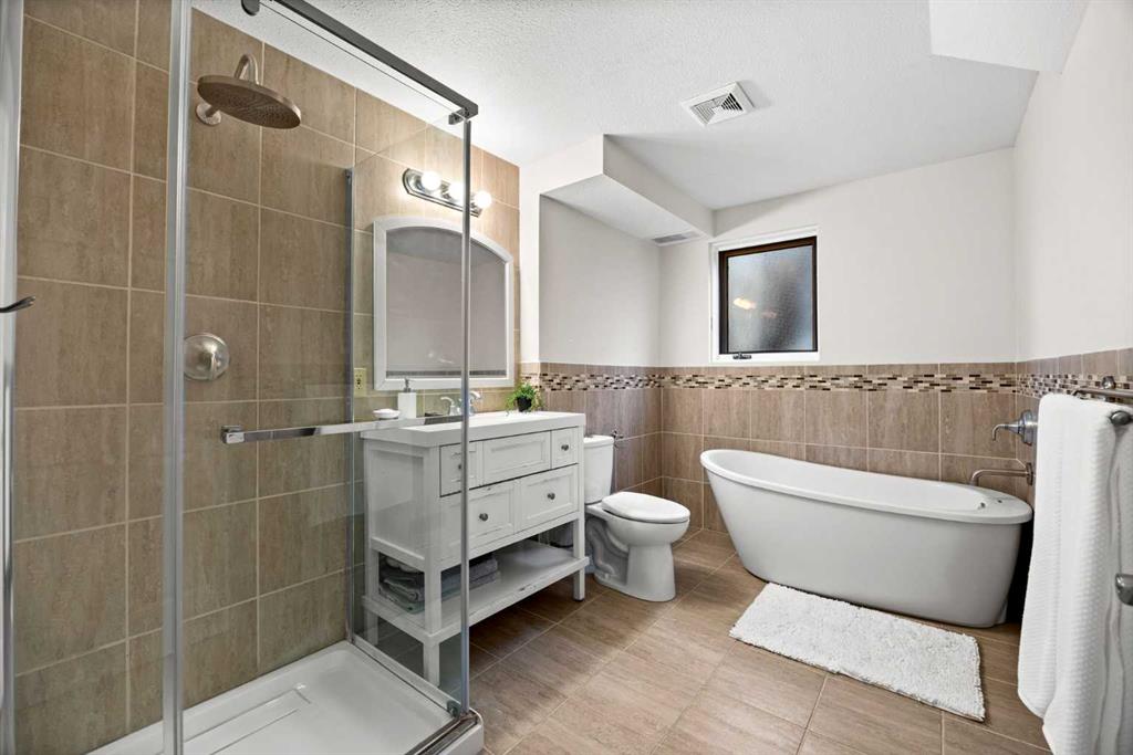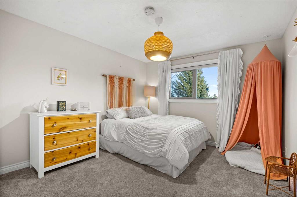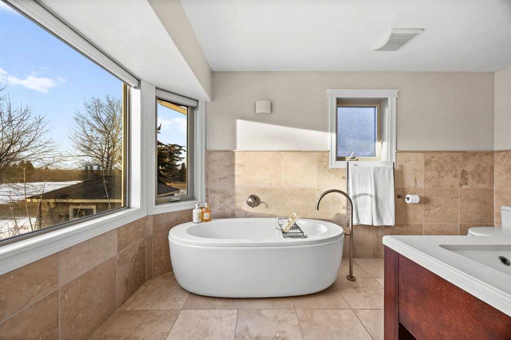 Enjoy sunrises from the front porch and spectacular sunsets from the west-facing back deck, where mountain views create a stunning natural backdrop. The west-facing primary retreat features his-and-hers closets and a renovated 5-piece ensuite finished with heated travertine tile. Two additional large bedrooms and a full bathroom complete the main level.