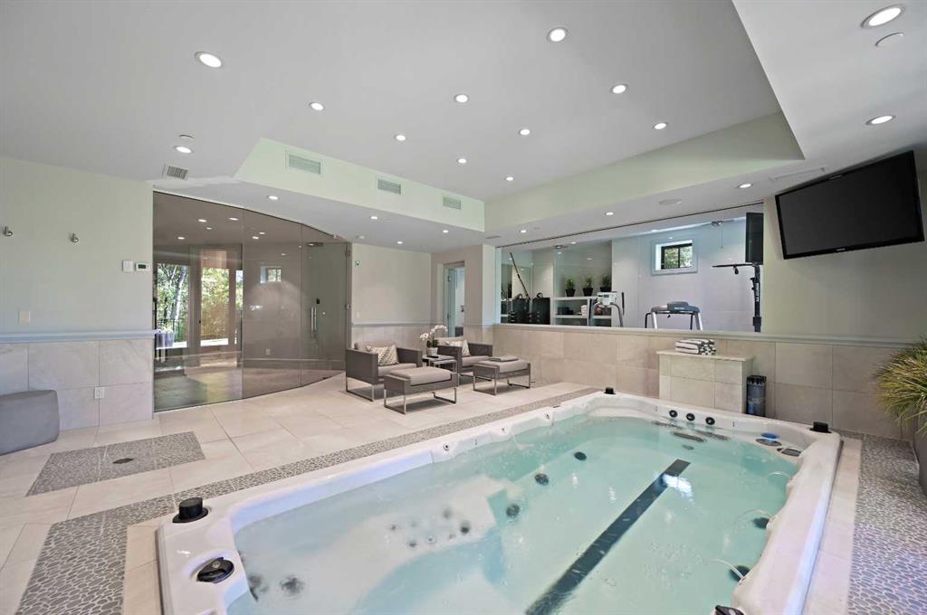 Nestled within the prestigious enclave of Springbank Valley Heights, this exceptional custom-built estate embodies understated luxury and timeless sophistication.Spanning over 7,500 square feet of exquisitely designed living space on a 12,604 sq. ft. lot, every detail of this residence reflects a deep commitment to craftsmanship and elegance.The stately stone exterior and charming front veranda create a distinguished first impression, while the grand foyer—with its sweeping curved staircase and polished hardwood floors—sets the stage for the refined interiors beyond. Designed for both culinary excellence and intimate entertaining, the gourmet kitchen features professional grade Viking and Miele appliances, including a gas range, an additional speed oven that doubles as a microwave, espresso machine, triple dishwashers, and a large double Sub-Zero fridge that complements the kitchen’s exceptional functionality.Granite countertops and custom cabinetry elevate the space, while the great room exudes warmth and sophistication, showcasing a custom granite stone fireplace that creates a “Chic Chalet” ambiance reminiscent of an upscale mountain retreat—perfect for gathering and relaxation. This space flows into the adjacent dining room, distinguished by its vaulted ceiling with custom wood inlay and uninterrupted ravine views—an inspiring setting for hosting or intimate evenings, framed by expansive windows that open to a serene west-facing backyard. Outside, an inviting new tile patio with a built-in BBQ and wood-burning fireplace creates a seamless extension of the home—ideal for alfresco dining and evening conversation as the sun sets over the ravine. A private home office with custom millwork provides a peaceful retreat for productivity, while the heated triple-car garage with its own furnace offers direct access to a spacious media lounge complete with wet bar, two-piece bath, and home theatre setup. Upstairs, the primary suite is a sanctuary of calm with a spa-inspired 6-piece ensuite featuring a steam shower, dual vanities, and a meticulously designed walk-in closet.Two additional bedrooms, each with private ensuites, are complemented by a full upper-level laundry room for convenience. A second laundry area on the main level adds thoughtful functionality.The walkout lower level caters to wellness and leisure, showcasing a training pool enclosed in glass-a space that feels like a private spa, complete with bar fridge and freezer drawers, alongside a fully equipped fitness room and two additional bedrooms, each with a full bath.Thoughtfully appointed with in-floor heating, triple furnace systems, and a comprehensive fire suppression system, this residence offers a rare combination of advanced safety, comfort, and timeless style.Privately positioned against the ravine and just minutes from Aspen Landing and Stoney Trail, this is more than a home—it is a statement of enduring quality, designed for those who appreciate refinement, privacy, and elegance in every detail.