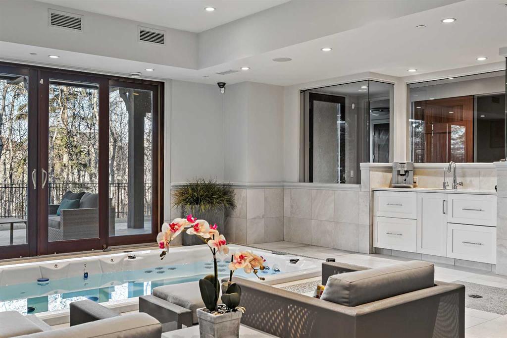 Nestled within the prestigious enclave of Springbank Valley Heights, this exceptional custom-built estate embodies understated luxury and timeless sophistication.Spanning over 7,500 square feet of exquisitely designed living space on a 12,604 sq. ft. lot, every detail of this residence reflects a deep commitment to craftsmanship and elegance.The stately stone exterior and charming front veranda create a distinguished first impression, while the grand foyer—with its sweeping curved staircase and polished hardwood floors—sets the stage for the refined interiors beyond. Designed for both culinary excellence and intimate entertaining, the gourmet kitchen features professional grade Viking and Miele appliances, including a gas range, an additional speed oven that doubles as a microwave, espresso machine, triple dishwashers, and a large double Sub-Zero fridge that complements the kitchen’s exceptional functionality.Granite countertops and custom cabinetry elevate the space, while the great room exudes warmth and sophistication, showcasing a custom granite stone fireplace that creates a “Chic Chalet” ambiance reminiscent of an upscale mountain retreat—perfect for gathering and relaxation. This space flows into the adjacent dining room, distinguished by its vaulted ceiling with custom wood inlay and uninterrupted ravine views—an inspiring setting for hosting or intimate evenings, framed by expansive windows that open to a serene west-facing backyard. Outside, an inviting new tile patio with a built-in BBQ and wood-burning fireplace creates a seamless extension of the home—ideal for alfresco dining and evening conversation as the sun sets over the ravine. A private home office with custom millwork provides a peaceful retreat for productivity, while the heated triple-car garage with its own furnace offers direct access to a spacious media lounge complete with wet bar, two-piece bath, and home theatre setup. Upstairs, the primary suite is a sanctuary of calm with a spa-inspired 6-piece ensuite featuring a steam shower, dual vanities, and a meticulously designed walk-in closet.Two additional bedrooms, each with private ensuites, are complemented by a full upper-level laundry room for convenience. A second laundry area on the main level adds thoughtful functionality.The walkout lower level caters to wellness and leisure, showcasing a training pool enclosed in glass-a space that feels like a private spa, complete with bar fridge and freezer drawers, alongside a fully equipped fitness room and two additional bedrooms, each with a full bath.Thoughtfully appointed with in-floor heating, triple furnace systems, and a comprehensive fire suppression system, this residence offers a rare combination of advanced safety, comfort, and timeless style.Privately positioned against the ravine and just minutes from Aspen Landing and Stoney Trail, this is more than a home—it is a statement of enduring quality, designed for those who appreciate refinement, privacy, and elegance in every detail.