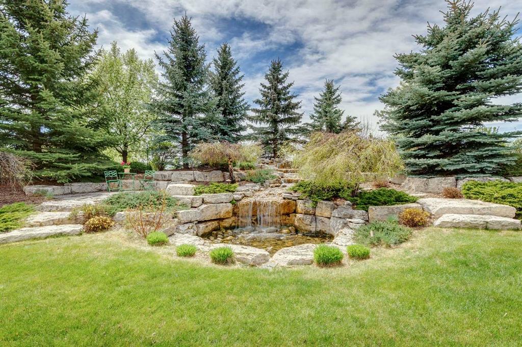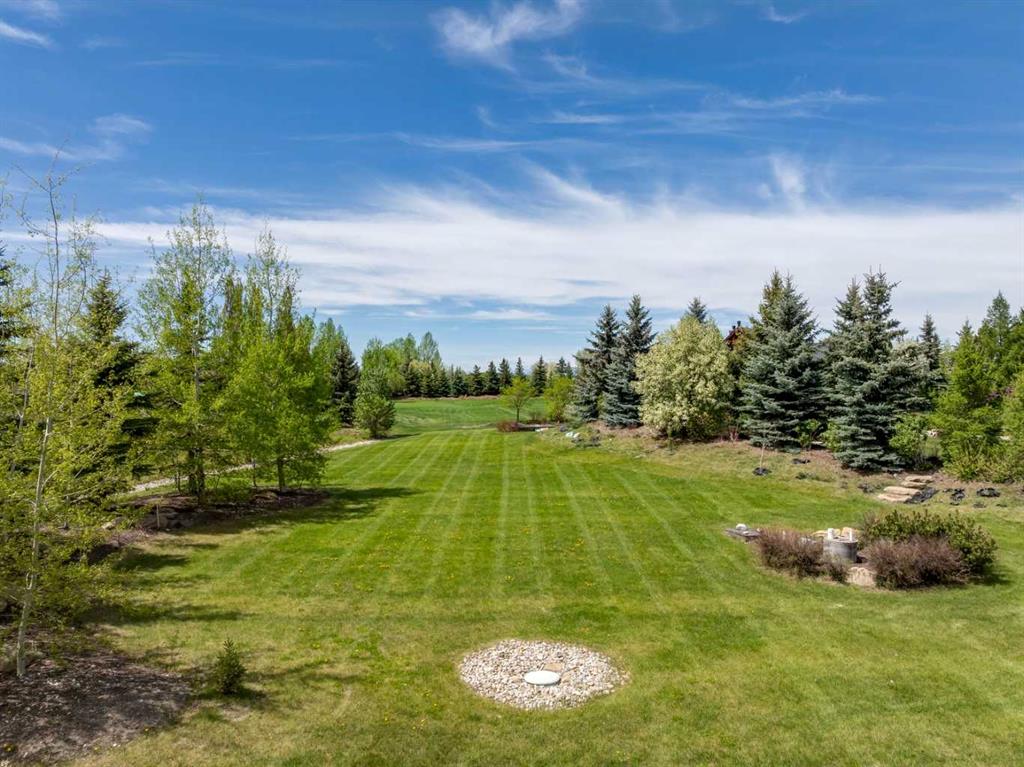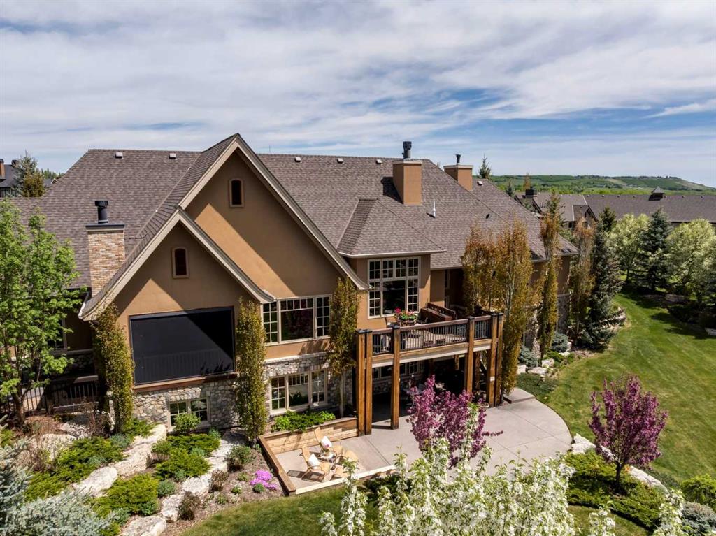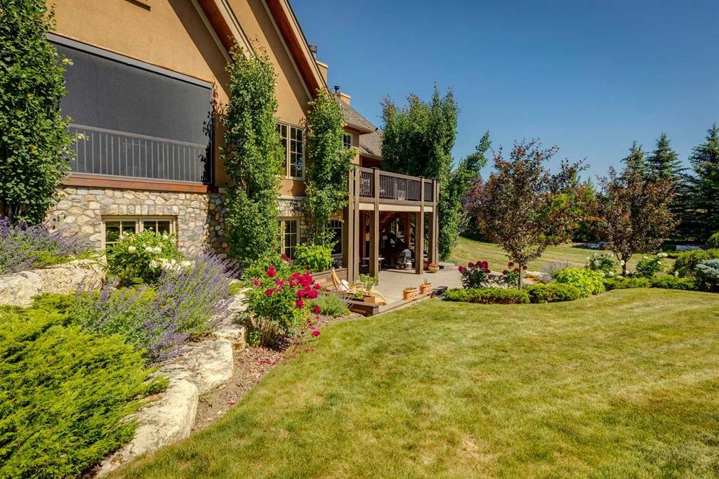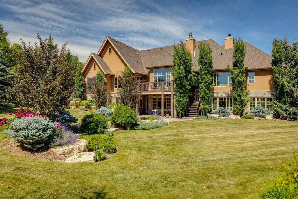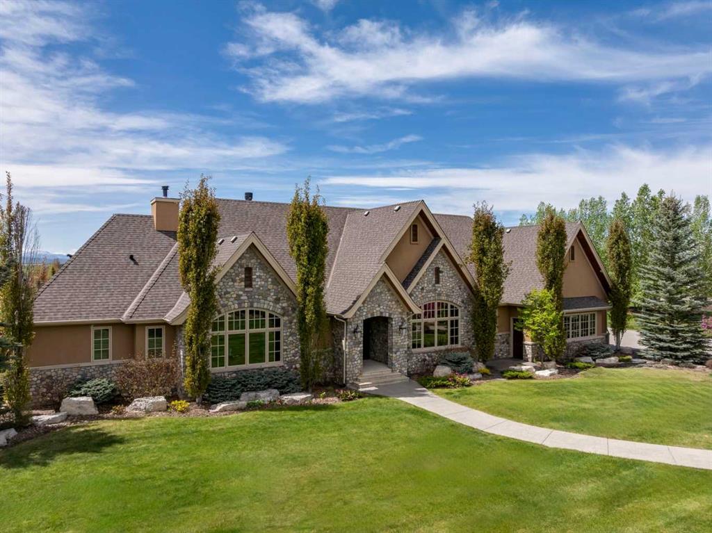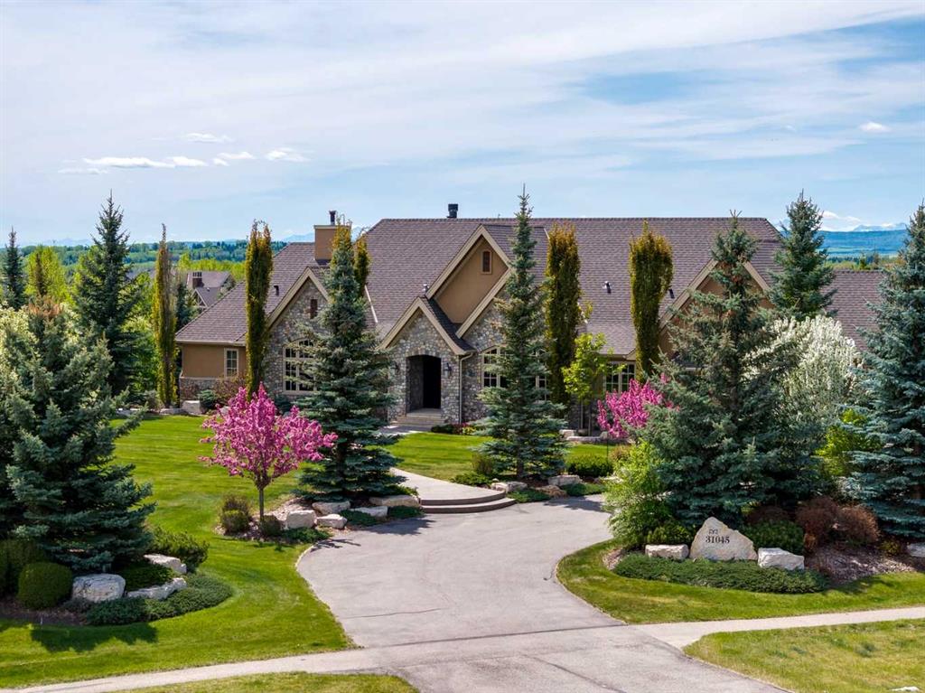 Nestled within the prestigious Morgans Rise estate community, this custom built 4 bedroom bungalow by Gallaghers Homes showcases refined craftsmanship with over 6,285 SF of luxurious living space, thoughtfully situated on a meticulously landscaped 2-acre parcel. Hear the gurgling water feature and the bird songs as you contemplate the beauty of the world famous Rocky Mountains. Step inside this luxurious architectural gem to experience premium finishes including site installed 1/4 sawn oak hardwood, cork flooring, glittering Schonbek chandeliers, intricate wainscoting and narrow French passage doors adorned with beveled and leaded glass. The grand foyer with its diamond-patterned limestone and marble tile opens to a sophisticated open-concept living area enhanced by Bermuda and double cornice ceilings. At the heart of the home is a chef's dream kitchen featuring a Wolf 6-burner gas range, wall oven and warming drawer, Subzero fridge and 2 fridge drawers and a Meile dishwasher. There is a spacious island, custom cabinetry, bronzed hardware and a walk-through pantry tucked behind the kitchen. Enjoy casual meals in the sunlit breakfast nook. Have morning coffee on the raised wood deck or cozy up with the gas heater or build a fire in the wood burning fireplace on the 3 season screened porch. A formal dining room with built-in bookshelves and wet bar makes entertaining a pleasure. The principal bedroom is a serene retreat complete with a sitting area, walk-in closet with a dressing table, and a spa-like 6-piece ensuite featuring a steam shower, soaker tub, towel warmer and double vanity. The main level also includes a den/flex room with fireplace, a laundry room and mudroom. The walk-out level is designed for comfort and entertaining. It is anchored by a spacious family room and gas fireplace that opens to the patio. There is a private guest suite with a 4 piece ensuite bath, 2 additional bedrooms, a full and half bath, fitness room, wine cellar, and wet bar, 2 oversized storage rooms, cedar closet and lockers. Other appliances include a Subzero wine fridge, Subzero bar fridge, Sharp microwave drawer, 2 Fisher & Paykel dishwasher drawers, central vacuum system and a front loading Meile front load washer and dryer. Additional features include 4 fireplaces, an elevator, heated 4-car garage, Split faced fieldstone detailing inside and out, central a/c, water softener and purifier, cistern, underground sprinklers and a security system. Recent updates include fresh Farrow and Ball paint, new site installed oak hardwood flooring in the principal bedroom, warm cork flooring in the walk out level bedrooms, new lighting, chandeliers and pot lights, updated electrical wiring, updated Mother Board and hydraulics on the elevator and additional fruit trees/berry plants/perennials. Plenty of room to build a pool or guest house. This is more than a home in the country; it's an opportunity for an elevated lifestyle in this exceptional property only 6 minutes from Calgary's West Side.